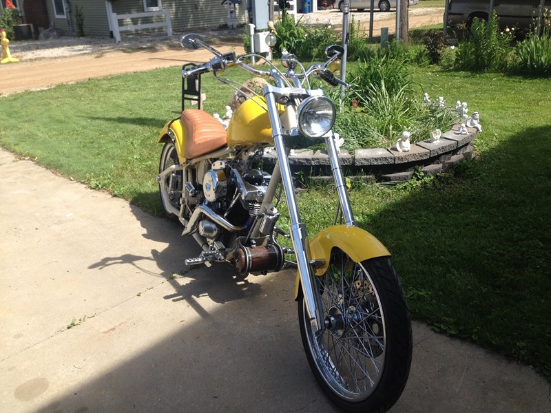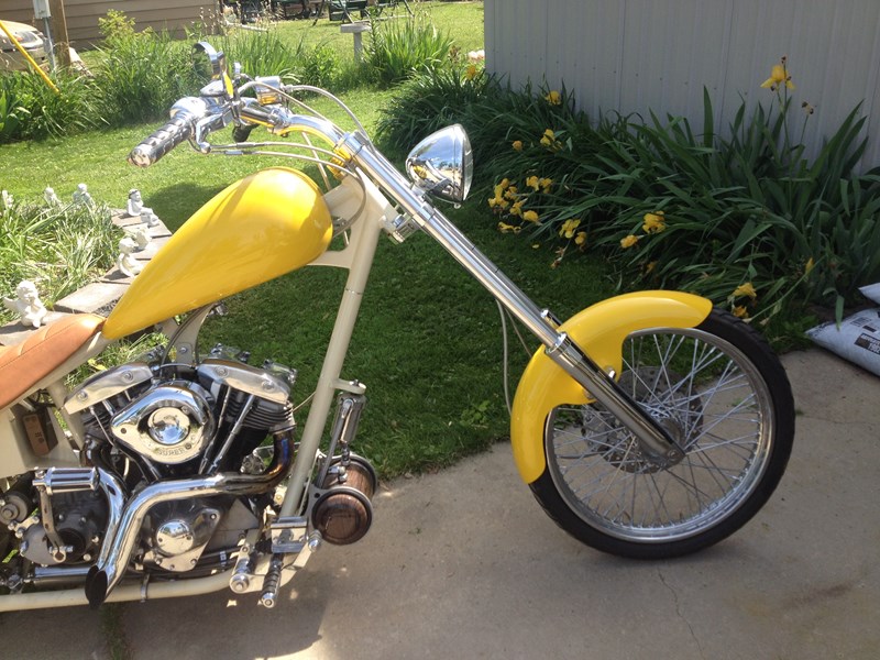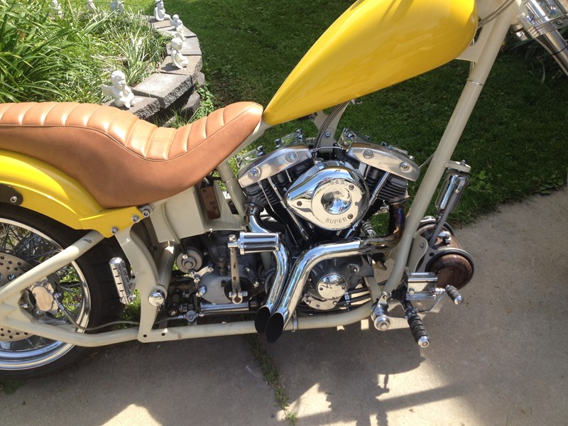 Shovel head custom, motor rebuilt, in a soft tail frame. I am including the original frame that has been powder coated, this has no motor or transmission in the original frame ( they are in the Chopper). I have enough parts from the original bike to make a roller minus a gas tank and the seat, most everything else is there, oil bag, wiring, front end, wheels, ect. I completed this chopper a few years ago and have not ridden it as mush as I thought I would. It rides and handles great, I had the bike in a shop last summer and they ran it on a dyno to get all the jetting and carb set correctly, the shop owner test rode the bike and confirmed how well in handled. Long bike at 9 feet long with over $20,000 invested this is a great buy.