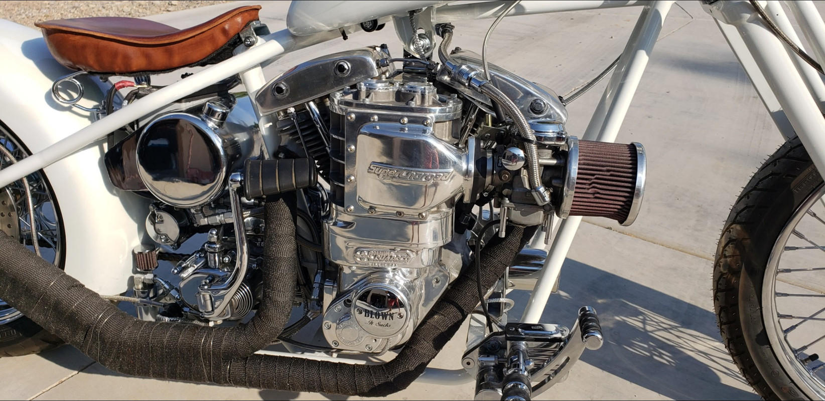 '79 FLH Custom Chopper. Axle to axle, all new. 80ci, Shovelhead w/lightened & balanced Evo flywheels. Magnacharger supercharger producing 4 lbs.boost. 40mm CV carb,Leinweber cam, Custom exhaust. Moto Iron springer. BDL, GMA belt drive and controls. All the best on this build. 21" front wheel. 200mm rear. Custom paint. More pics on request.