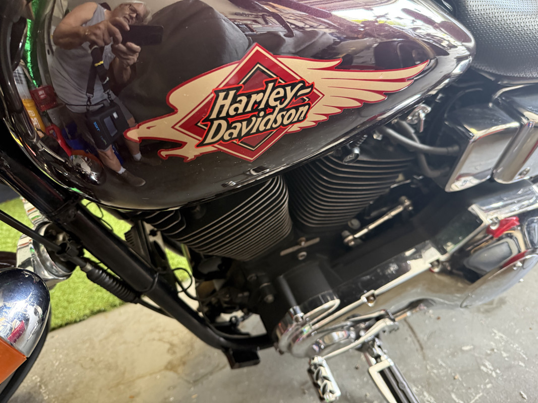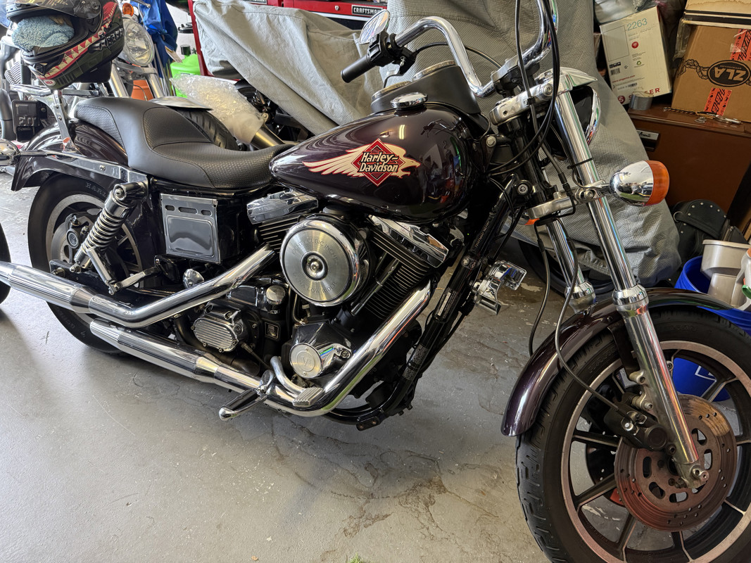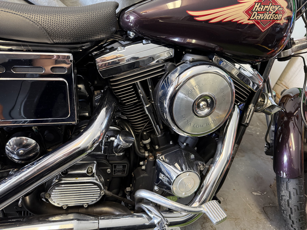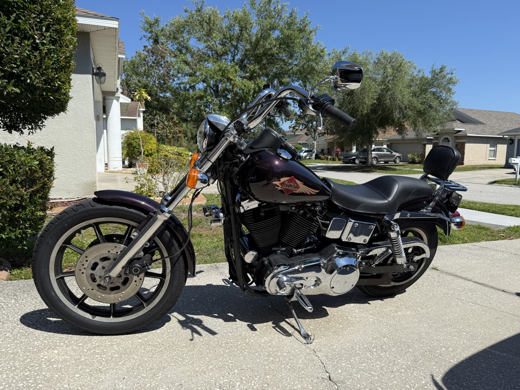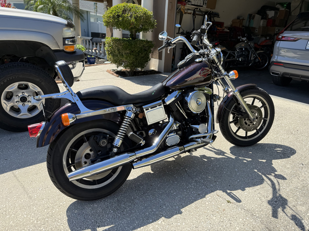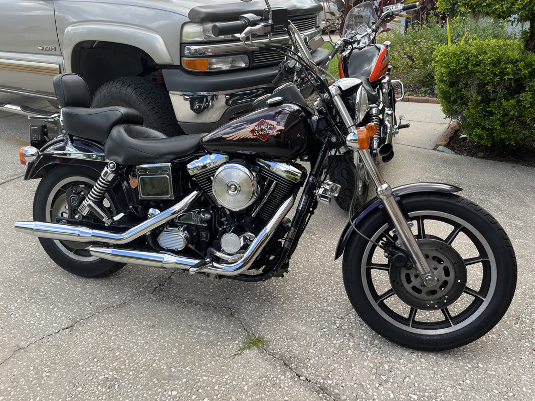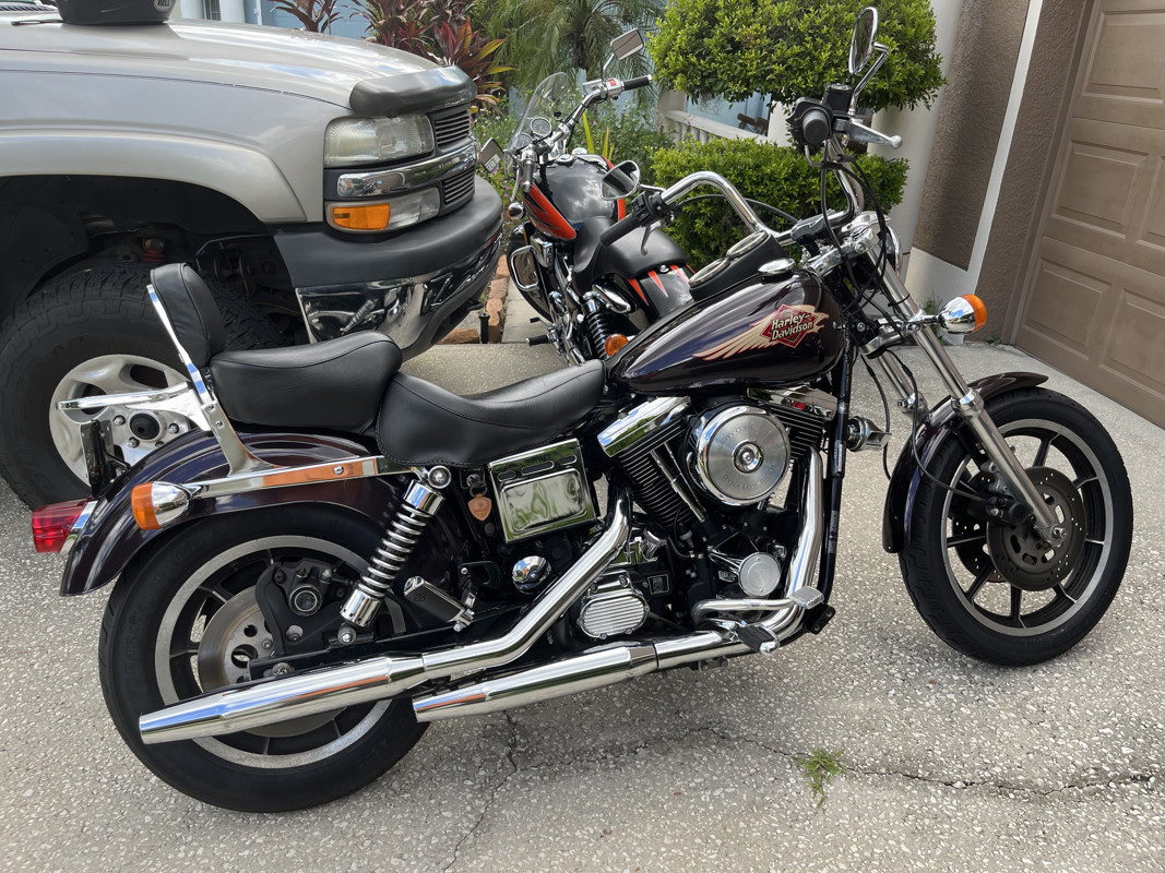 Excellent condition 1995 Dyna low rider with 80 cubic inch, 1340cc Evolution motor that is unmodified. The color is Burgundy Pearl. Mid controls. It comes with a new Saddleman low profile seat and an extra comfort Mustang seat for long distance rides. A factory HD detachable windshield and forward HD foot rests are also included but not shown in my photos. New tires, fresh fluids include engine oil, transmission fluid, primary fluid, new Drag Specialties reusable air filter element and new spark plugs. 26,638 miles on the bike. It’s mostly a factory original HD except for the seats, handlebars,and foot pegs. Also comes with a very loud horn. Original paint. It’s a very clean 1995 Dyna Low rider. A true HD classic. Original Florida bike tha has always been garaged. I am the 2nd owner. Priced at $5800