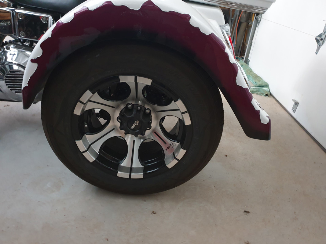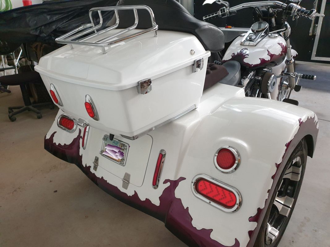 This rare, one owner machine is a one-of-a-kind! The body work has been designed and meticulously hand crafted with 3 dementional elements & three tone paint - head turnR4sure! Chrome Jockey shift (can be easily changed back to stock at handlebar). "Mirage" accents throughout add just the right amount of shine. The rear end of this trike is rubber mounted, which makes for a smooth ride. It has an Iron horse front wheel & brake and classy Dick Cepek rear wheels (all new tires). The manual reverse shift make easy manouvering anywhere. Lockable trunk & Harley tour pack for security. Digital battery display with USB &12V connectors. Too many other extras to list here.