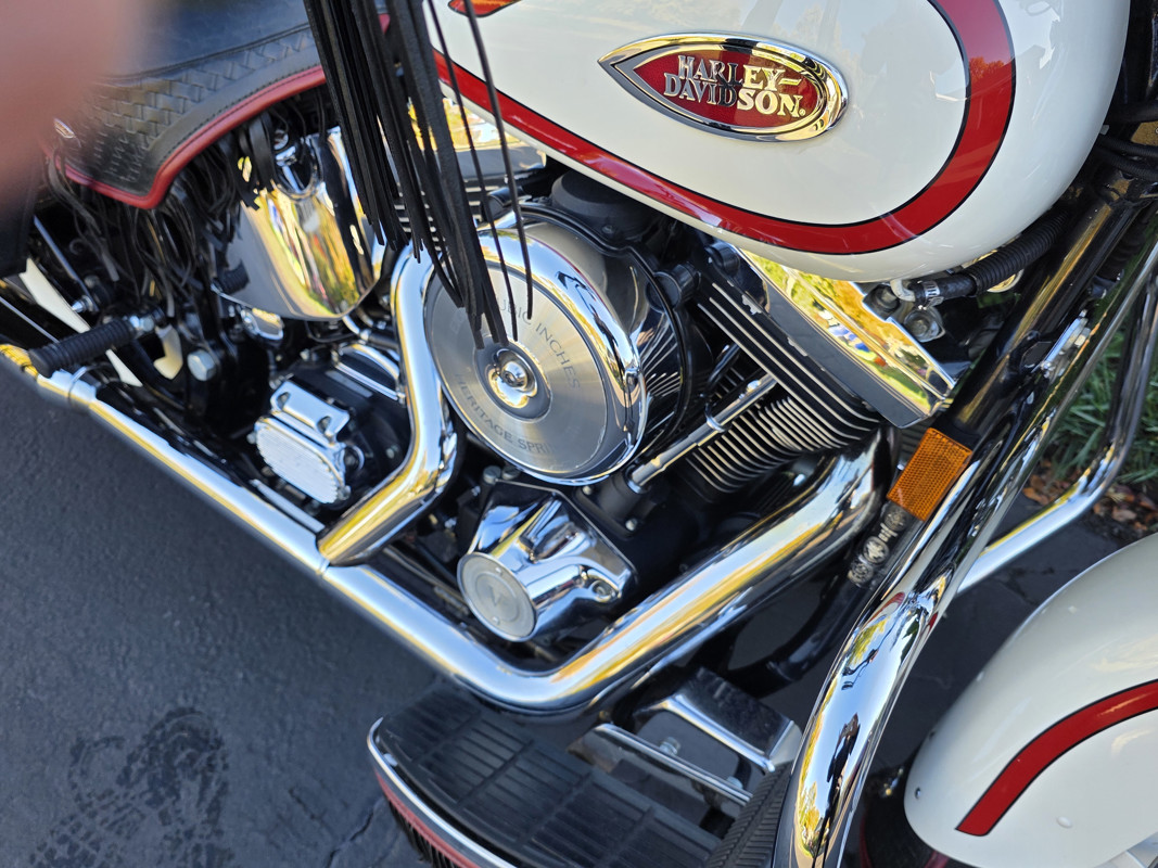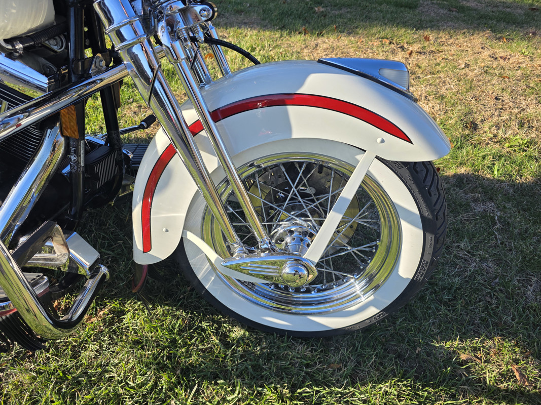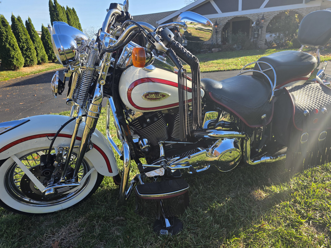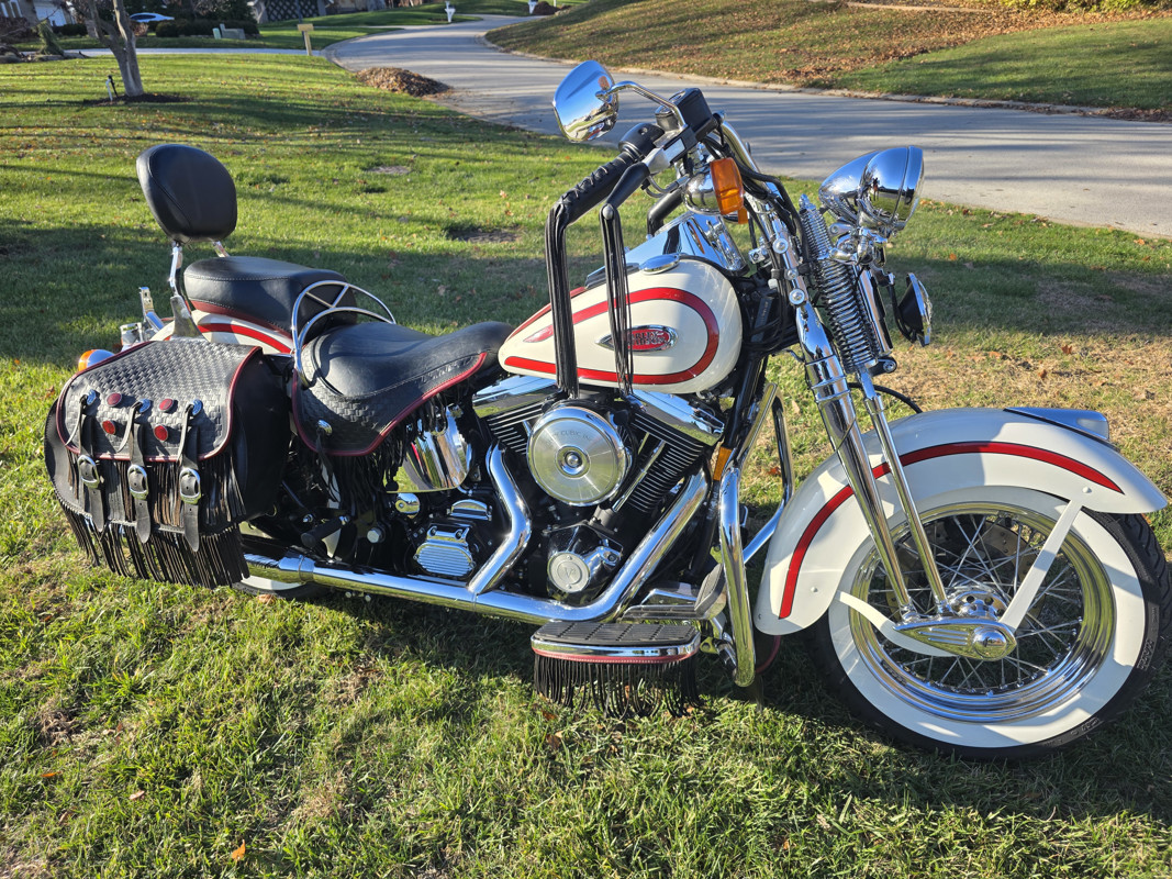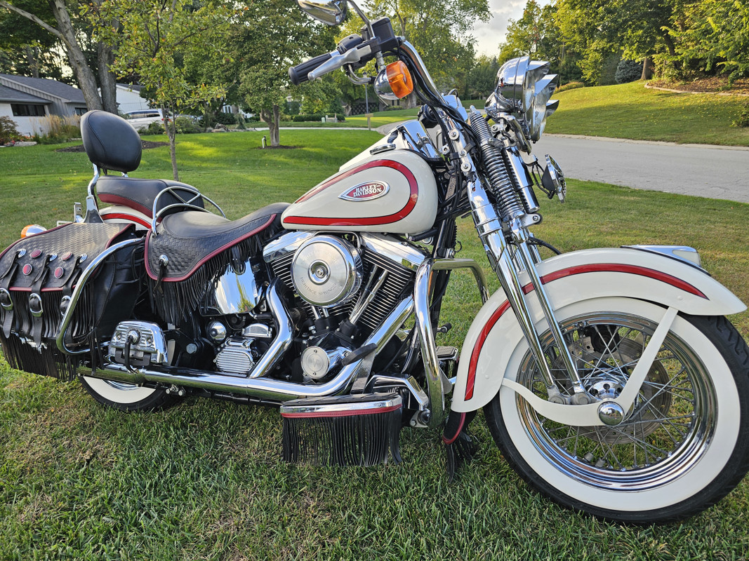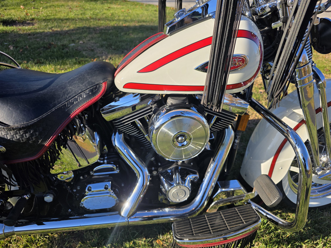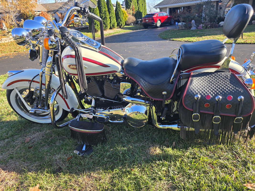 Come see this beautiful 1st year Heritage Springer finished off in birch white w red stripe with only 14623 miles. Same owner since 1996. Equipped with Screamin Eagle fishtails, sissy bar, quick remove windshield, mudflaps, floorboard fringe , new tires and more. Looks, runs and rides like a much newer bike. I have 4 of these and thinning out my herd.