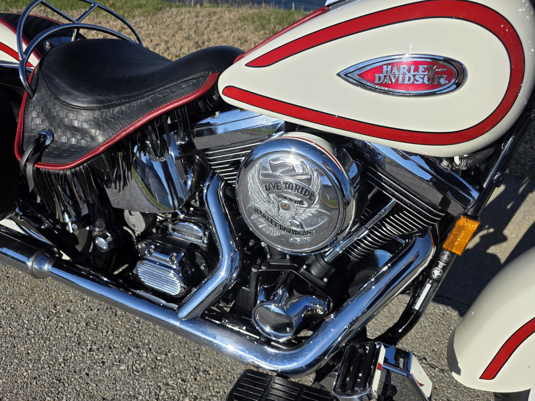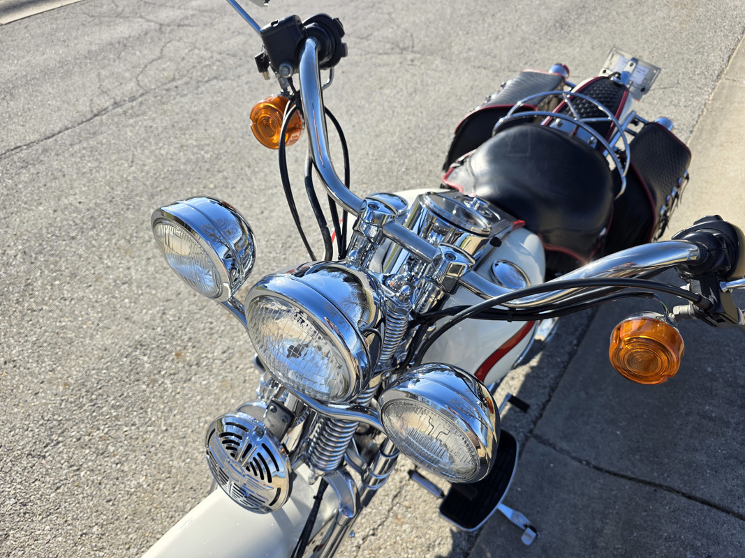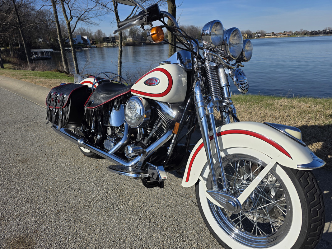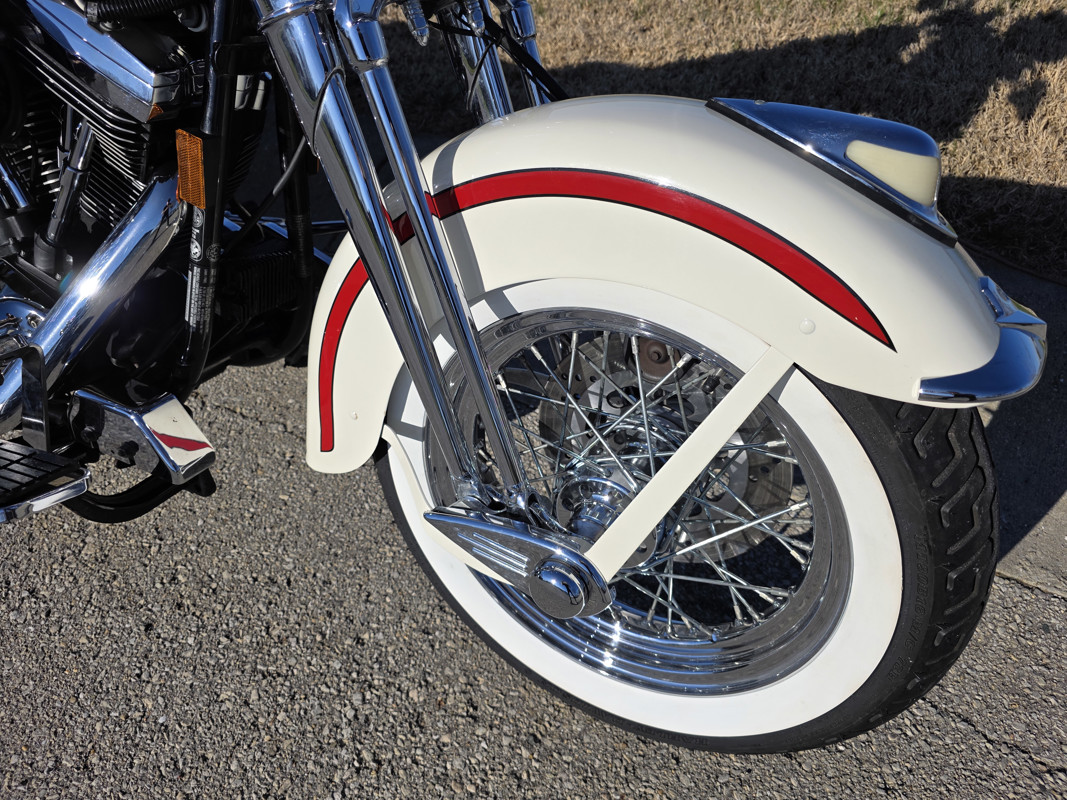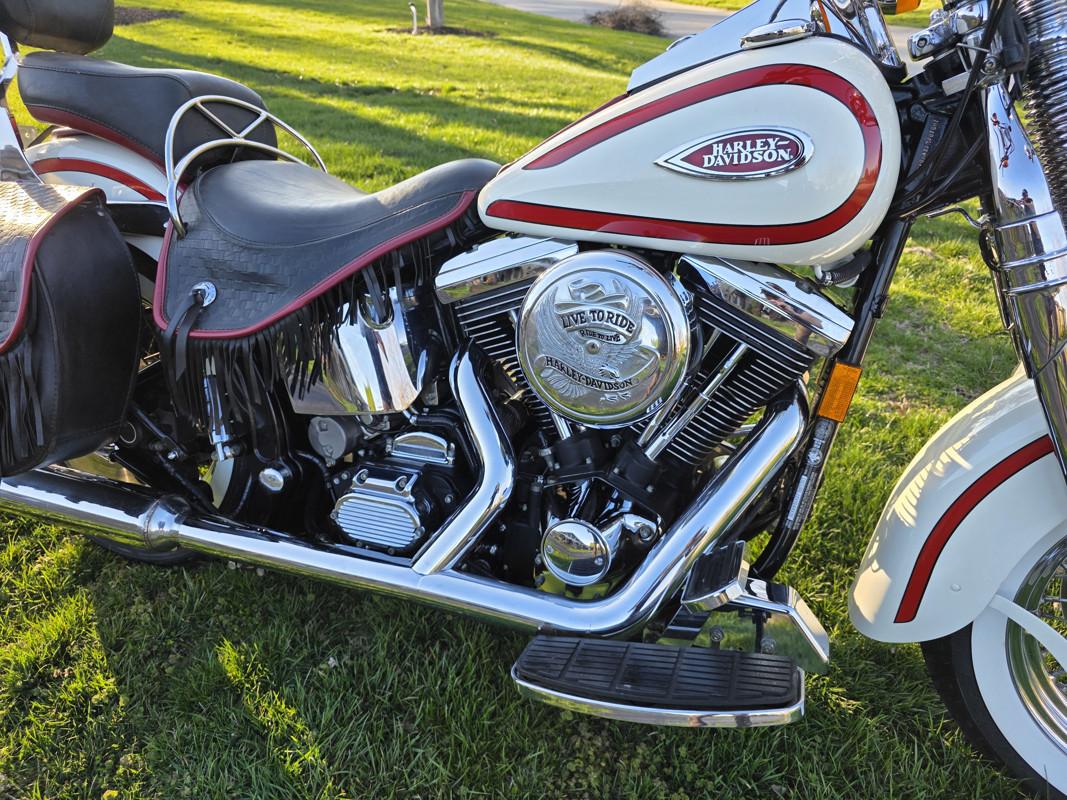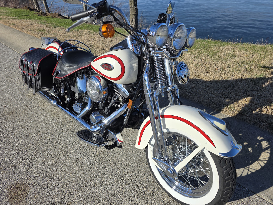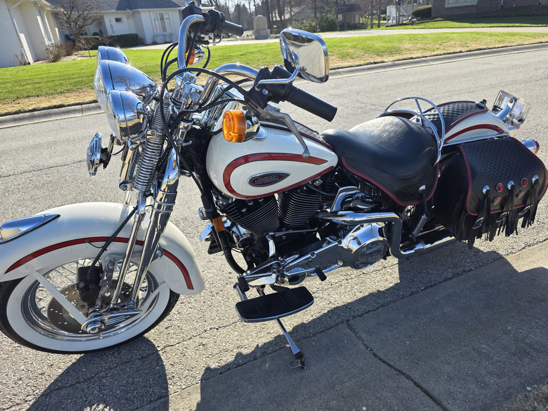Take a L@@K at my beautiful 1st year Heritage Springer nicknamed the Ol Boy by the HD crowd. 16K miles finished off in birch white w red stripe. Really nice shape and runs and rides like a dream. Has Slip ons, Stage 1, quick remove sissy bar, fender bra for the solo look. Almost 30 years old and still my favorite harley. I have a blue stripe I ride myself. NOT a destress sale, low ball offers will be ignored. I had a collection of these and am thinning out the herd. Also have another with 7K miles.