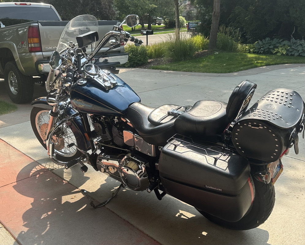 Excellent condition. Garage kept. Well maintained, Highway touring mileage only. Original owner. Modified as a light weight touring bike. Mustang saddle w/ backrest, modified wider front wheel, rebuilt top end, S&S carb, Vance & Hines 2 to 1 exhaust, saddle bags, Garmin trip computer, & LED lights. Selling to move to a trike. (Old age is a bitch!)
