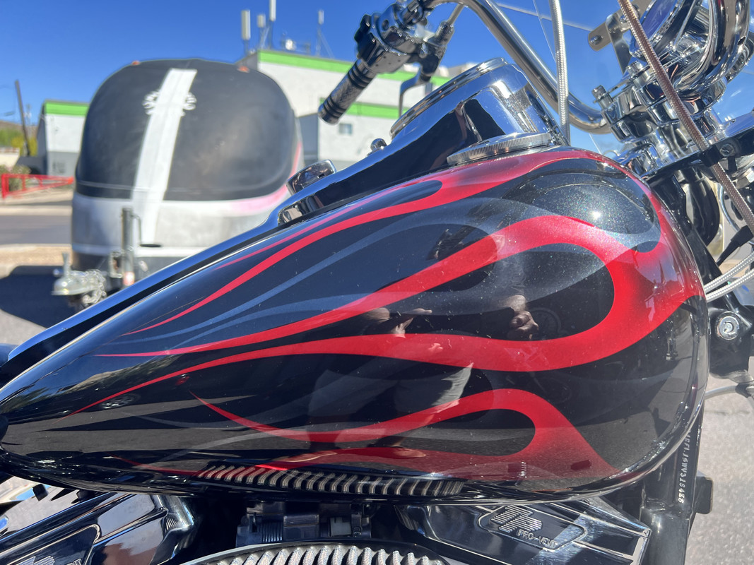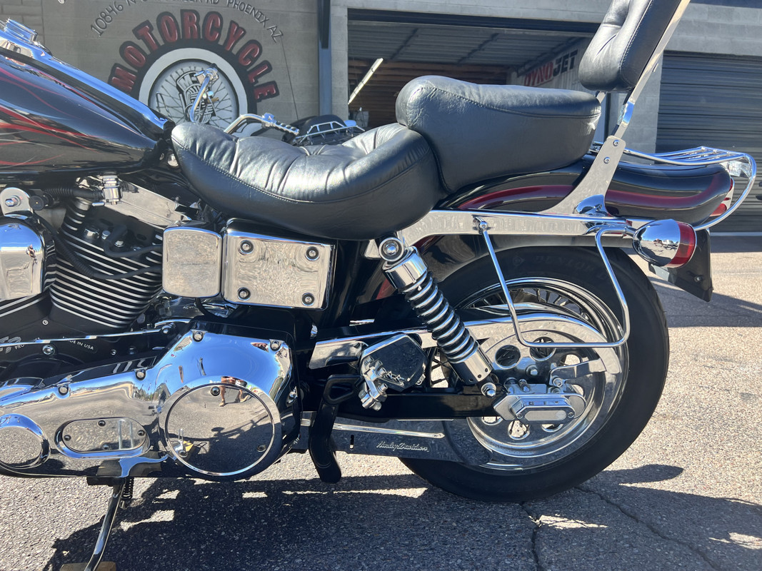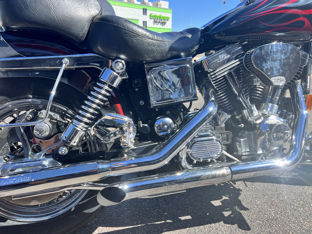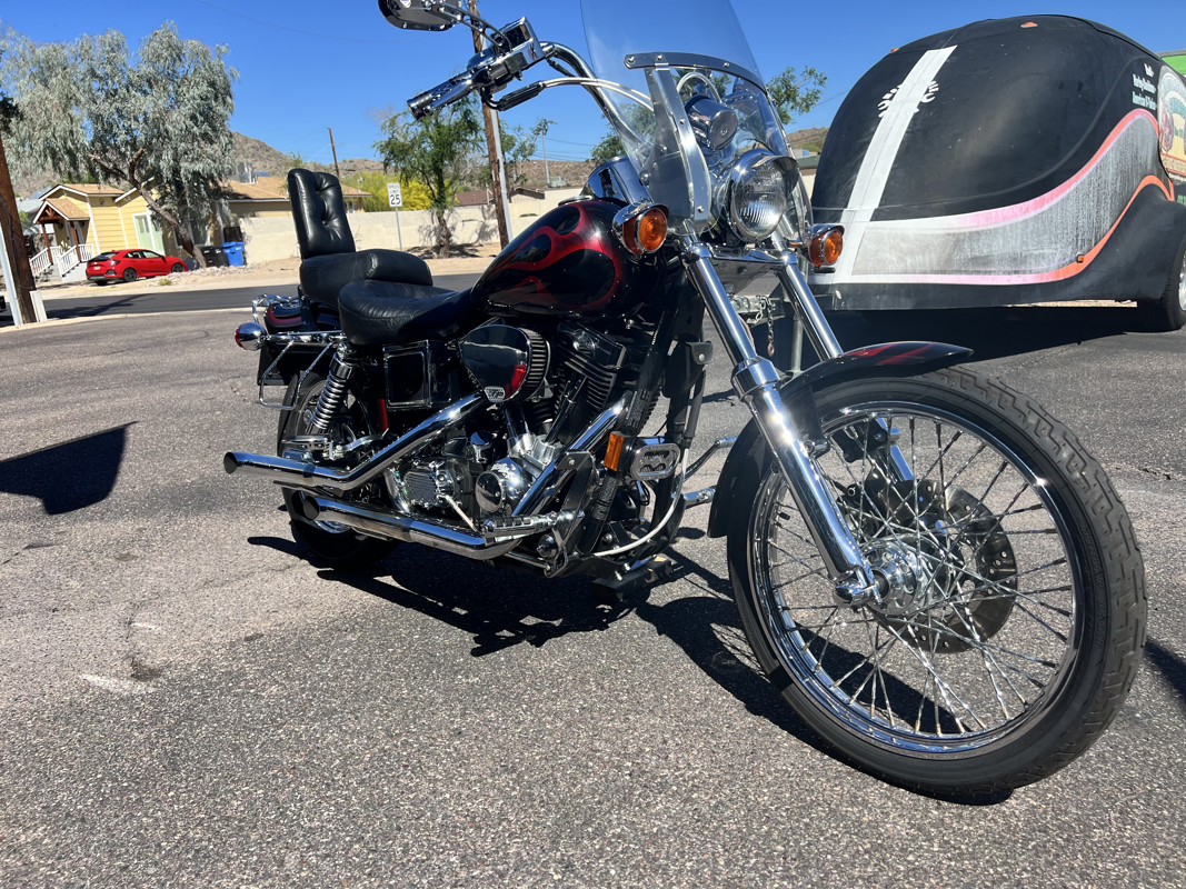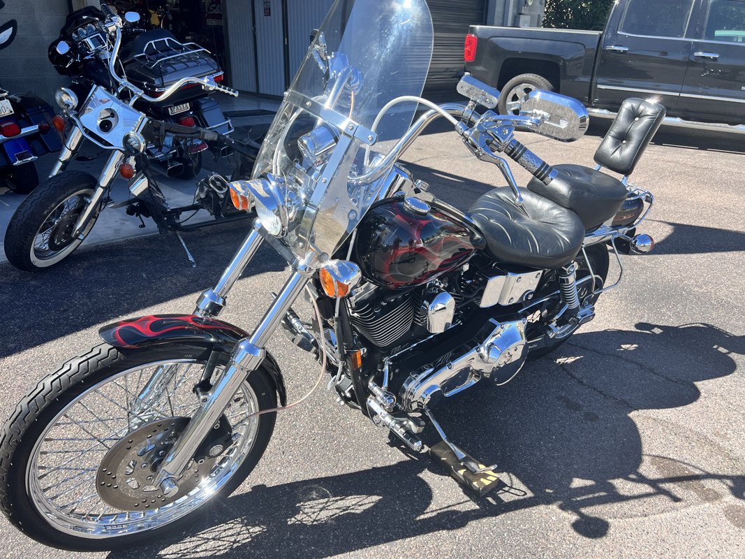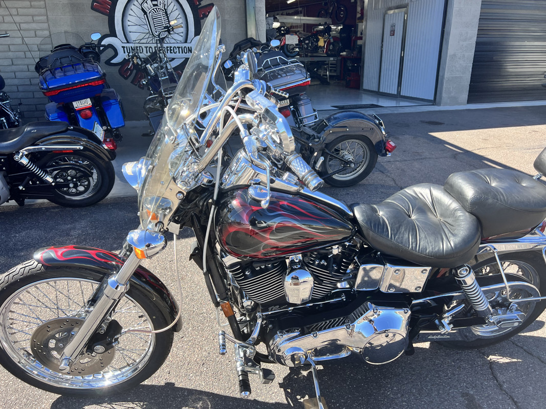 Original owner selling this customized 1998 FXDWG. We put a TP107 motor in after 8500 miles. Turns 100 HP at 3300 rpm. Bike has custom paint ghost flames on tank, front and rear fenders. Twisted chrome spokes, chrome front suspension . After market Mustang seats with jell pads installed. Chrome Arlene Ness hand grips and much more. Tires are brand new and all the fluids have been flushed out and replaced.