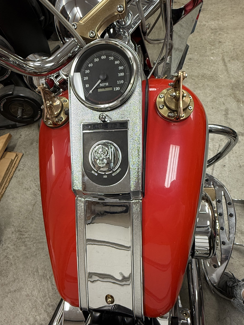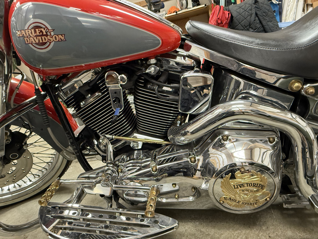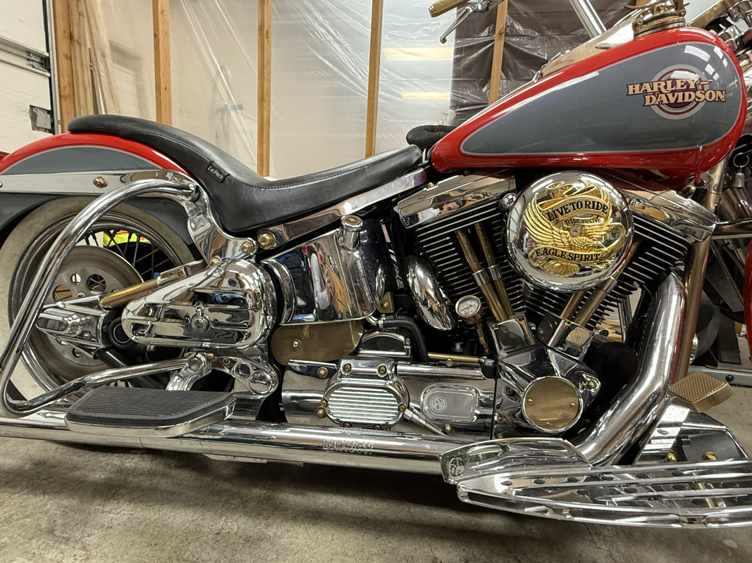 New parts, Break pads, Fork seals, 3" lowering fork springs, Adjustable rear struts, White Walls, Ape hangers, Mirrors, Chrome parts, neck cover, rear axel cover, vintage toolbox, drives floor boards, passenger floor boards, transmission gap cover, rear frame cover, custom made behind transmission cover, wind guards, Front crash bar, rear crash bar, head bolt covers, inner primary cover, custom frame cover under seat, lower dash, switch covers, break and clutch levers, Front fender guard, Sampson true dual fishtails, short rear blinkers, license plate bracket, 21 inch Front wheel, Polished lower forks, Arlen ness air cleaner, Gold eagle Air cleaner cover, Gold switches, Brass parts, grips, swing arm covers, down tube cover, starter cover, acorn rocker box bolts, acorn Front and rear fender bolts, Allen bolts for every motor bolt, break pedal, handle bar top clamp, spike horn bolt, timing cover, oil pressure gage, Brass gas caps handmade in Ukraine, shift pages, shift connector rod, Gold eagle derby cover, New seat, Custom lights, Cam, sire