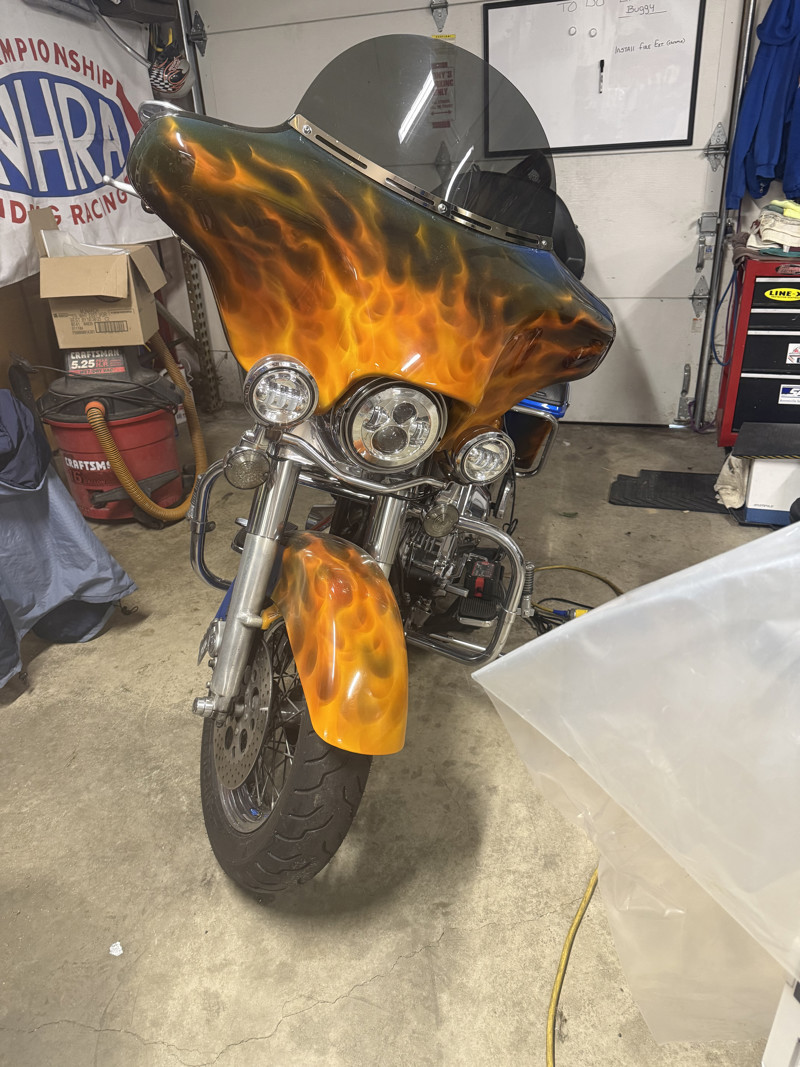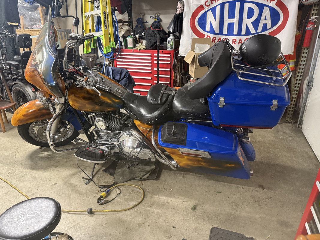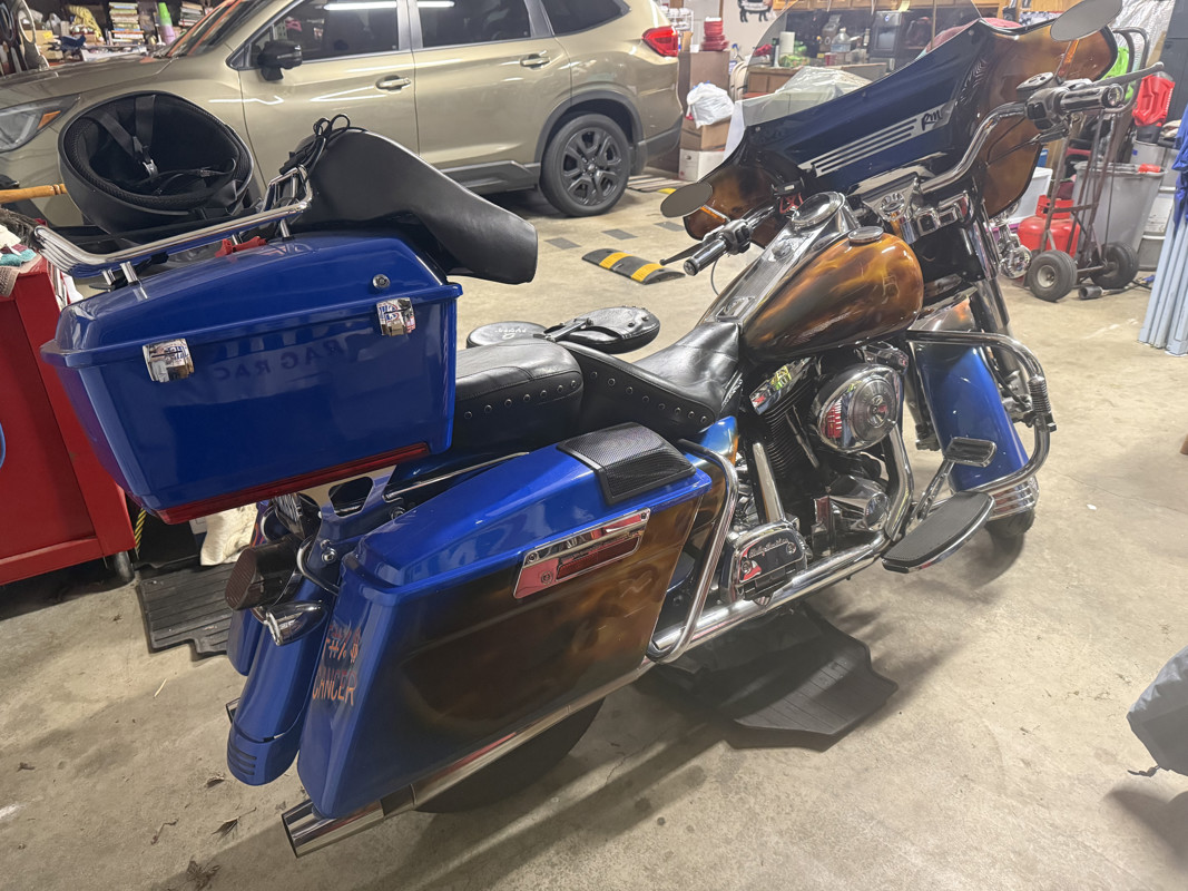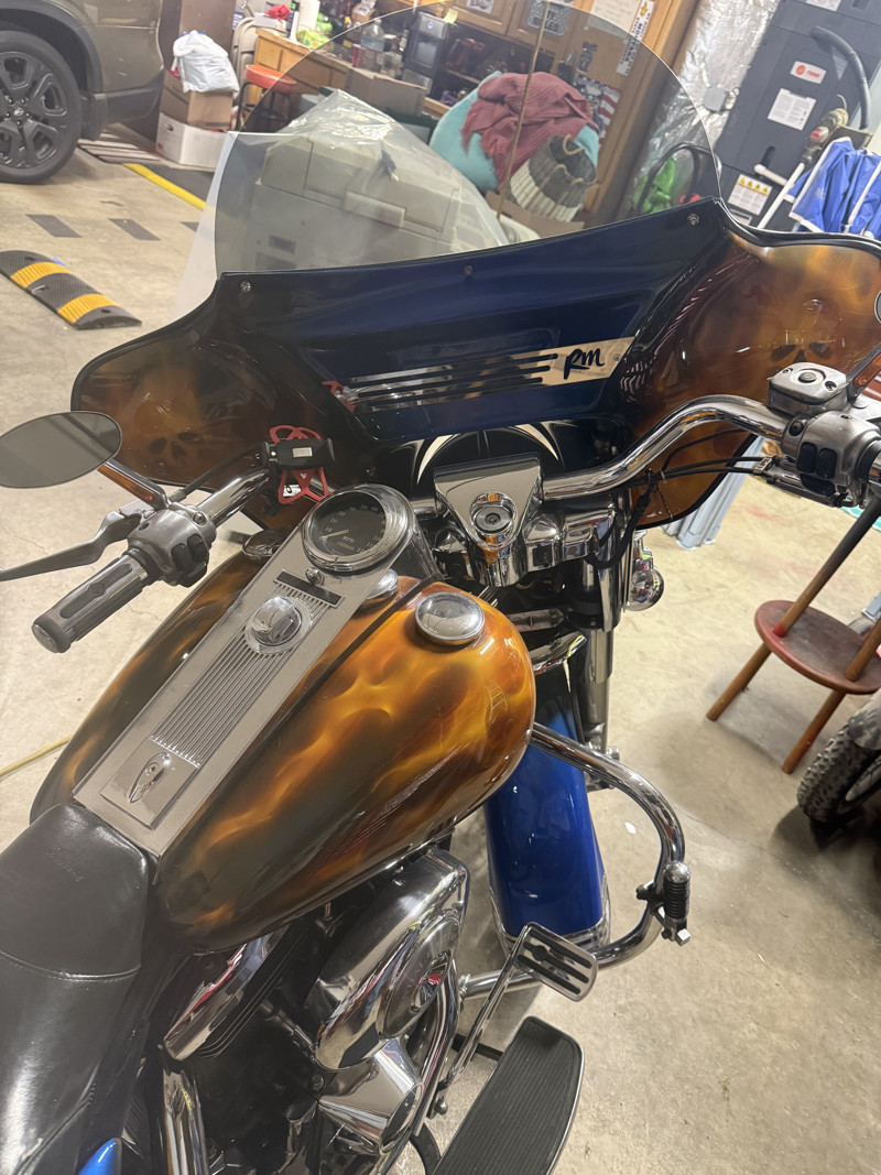 98 road king classic, new tires, tubes, LED Lights all around, custom flamed paint, tour package, heated rear seat, non stereo fairing, Bluetooth stereo with lid speakers , EVO motor with new lifters, push rods cam and positioning sensor & drive belt…comes with helmets and men & women’s chaps