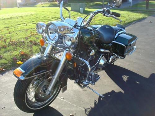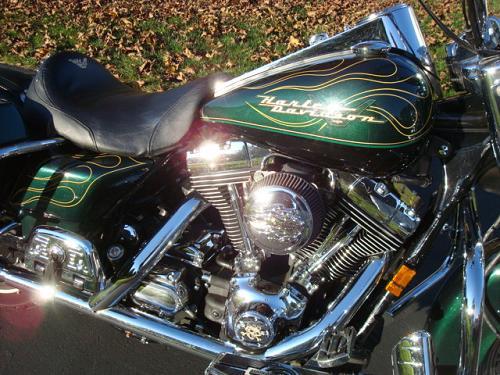 GOT A BIKE NIGHT TO GO TO? THIS MACHINE COMANDS ATTENTION AT EVERY SHOW. WITH ITS CUSTOM FLAME PINSTRIPING BY THE "ONE ARMED BANDIT", AND ITS MANY CHROME HARLEY ACCESSORIES, YOU CAN ARRIVE IN STYLE.