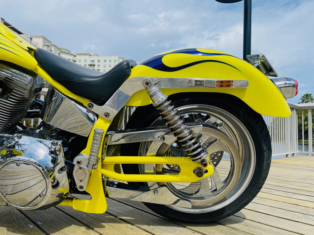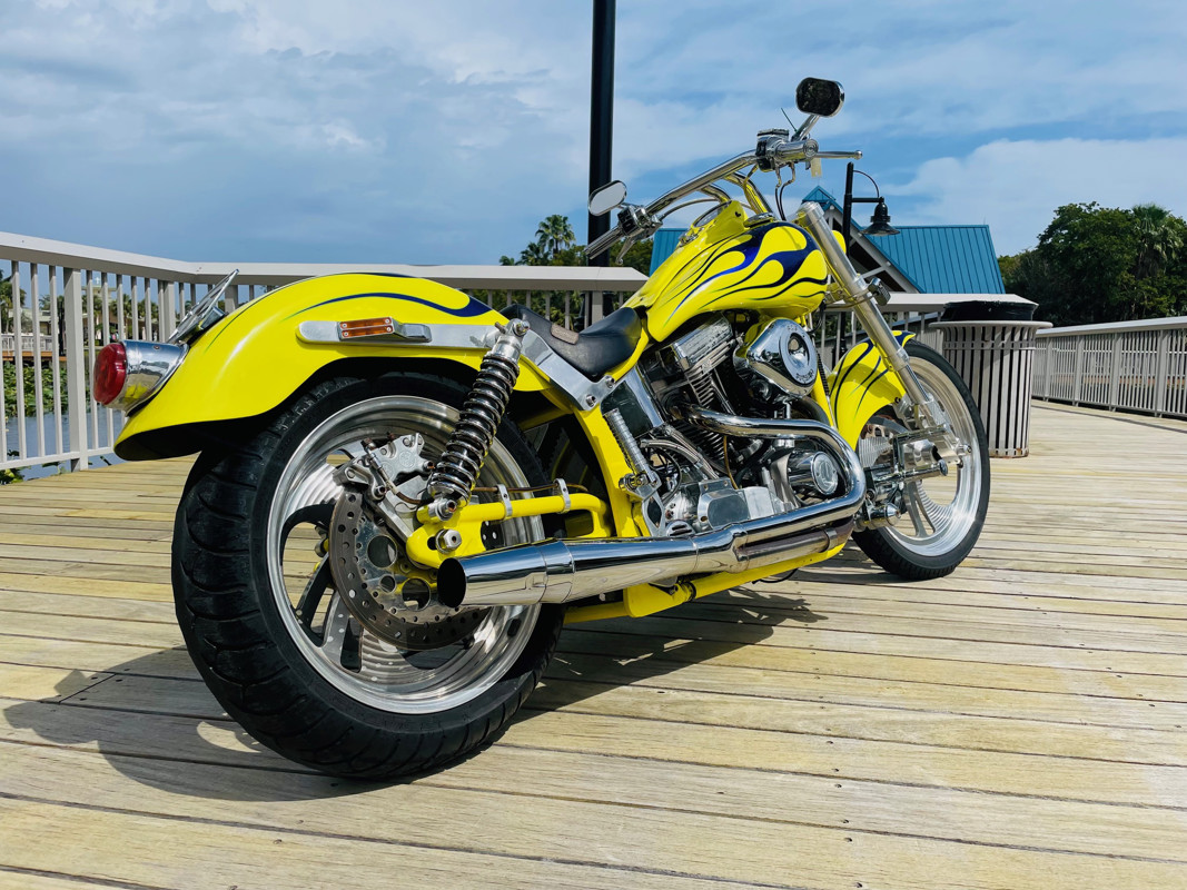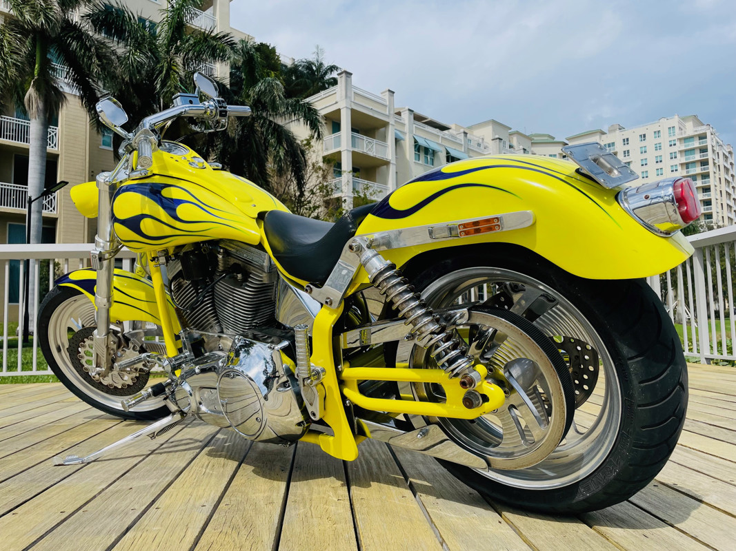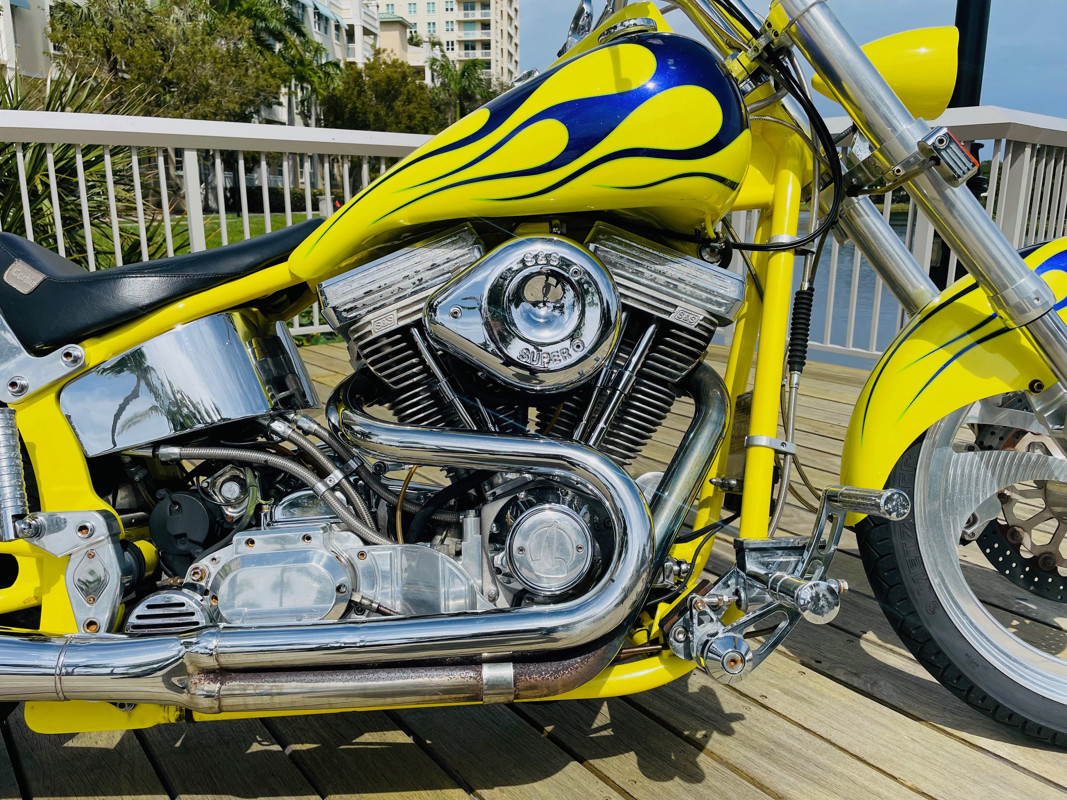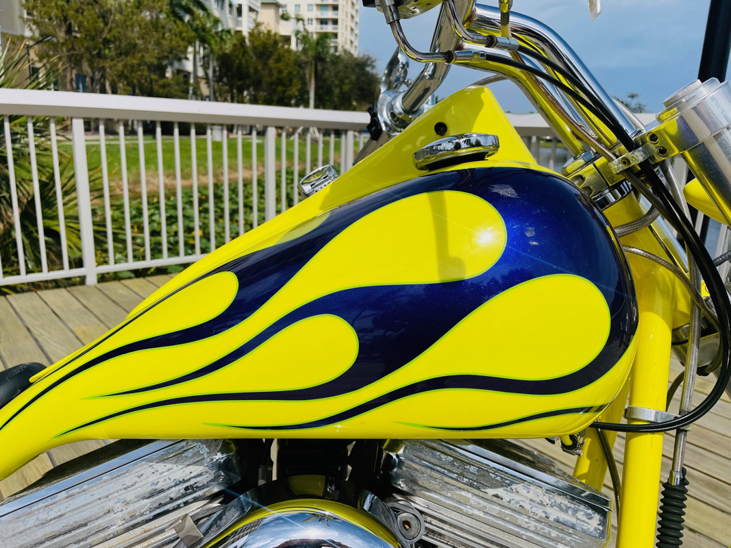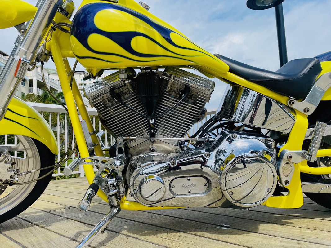 This bike is finished in yellow with nice custom paint. One of the original early Titan versions of the Gecko RM, a pro-street version with a S&S 96ci motor and 5-speed transmission. Plenty of power on this 620Lbs bike. Range still at 150miles with a 5gal fuel tank. The S&S Carburetor is fully equipped to power this motor and get the best out of it.
