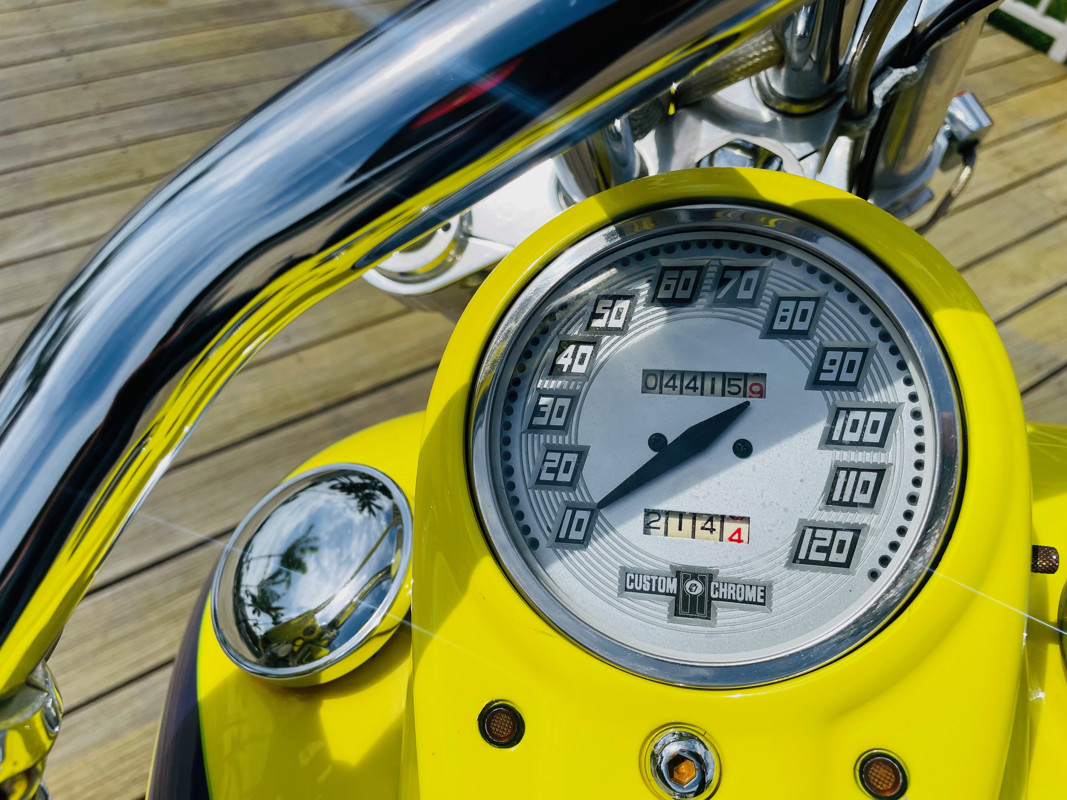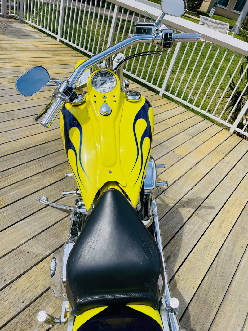 The first reaction you get when you pull up somewhere is “wows”. Flying under the radar is basically impossible with this chopper. It screams for attention just by its super nice lime green paint job. The chrome is glistening all around blinding your fellow motorists in the sunlight reflections.