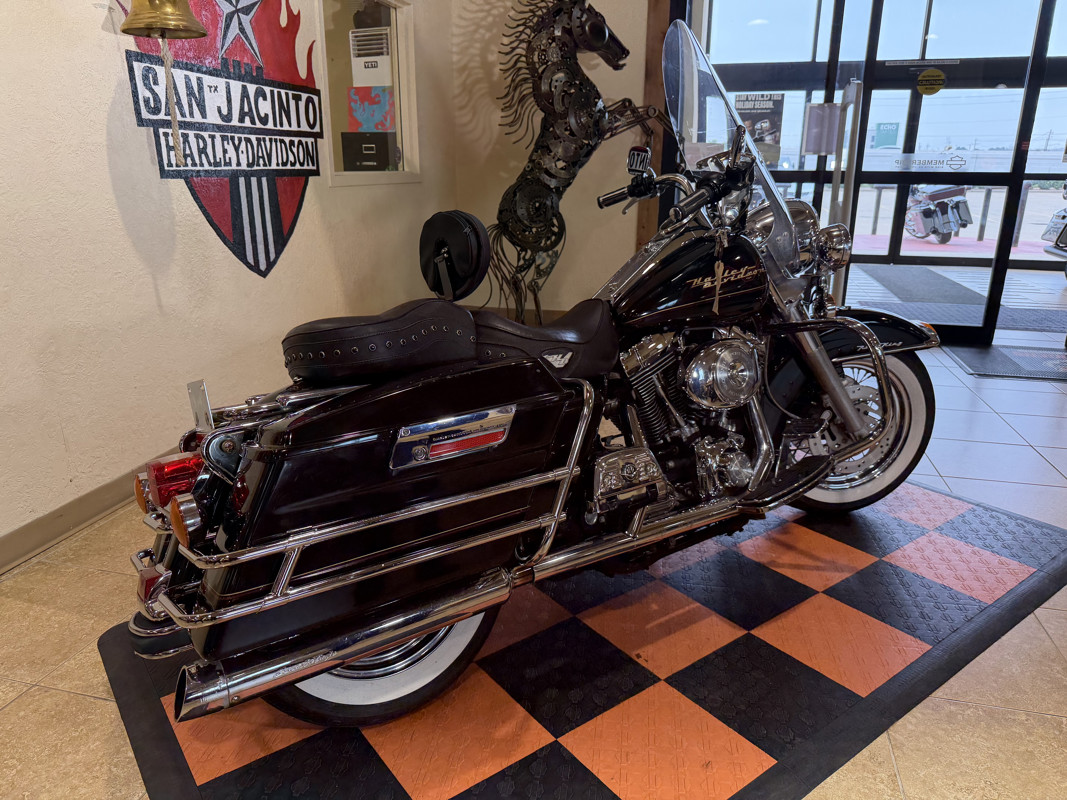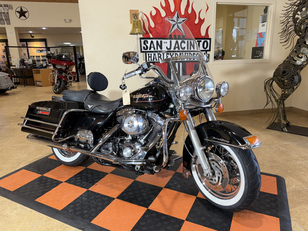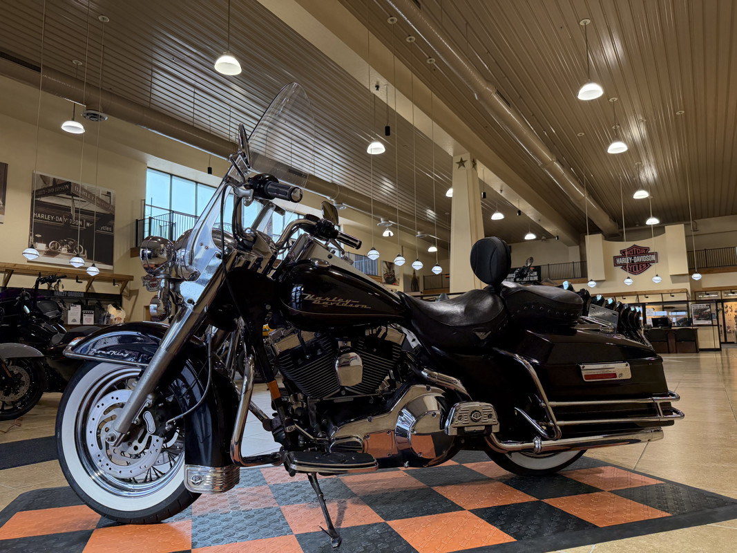 Ask most people to conjure up the best image of motorcycling from their youth, and this is it. The big, strong lines. The broad windshield. The massive chrome headlamp and nacelle. The Road King® brings it all back. But we’re not in business to merely wax nostalgic. Under all the brilliant chrome and lustrous paint lies our latest touring performance. At the center is eighty-eight cubic inches of Twin Cam 88™, isolation mounted in our touring frame. The combination is ready for any kind of road trip you have in mind. And at day’s end, the windshield and passenger pillion detach. You can have a custom look that beats anything on the strip, minutes after blowing into town.