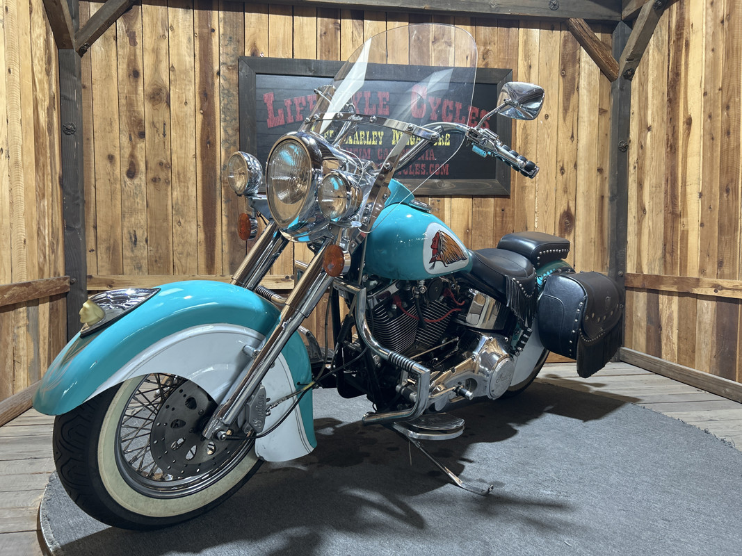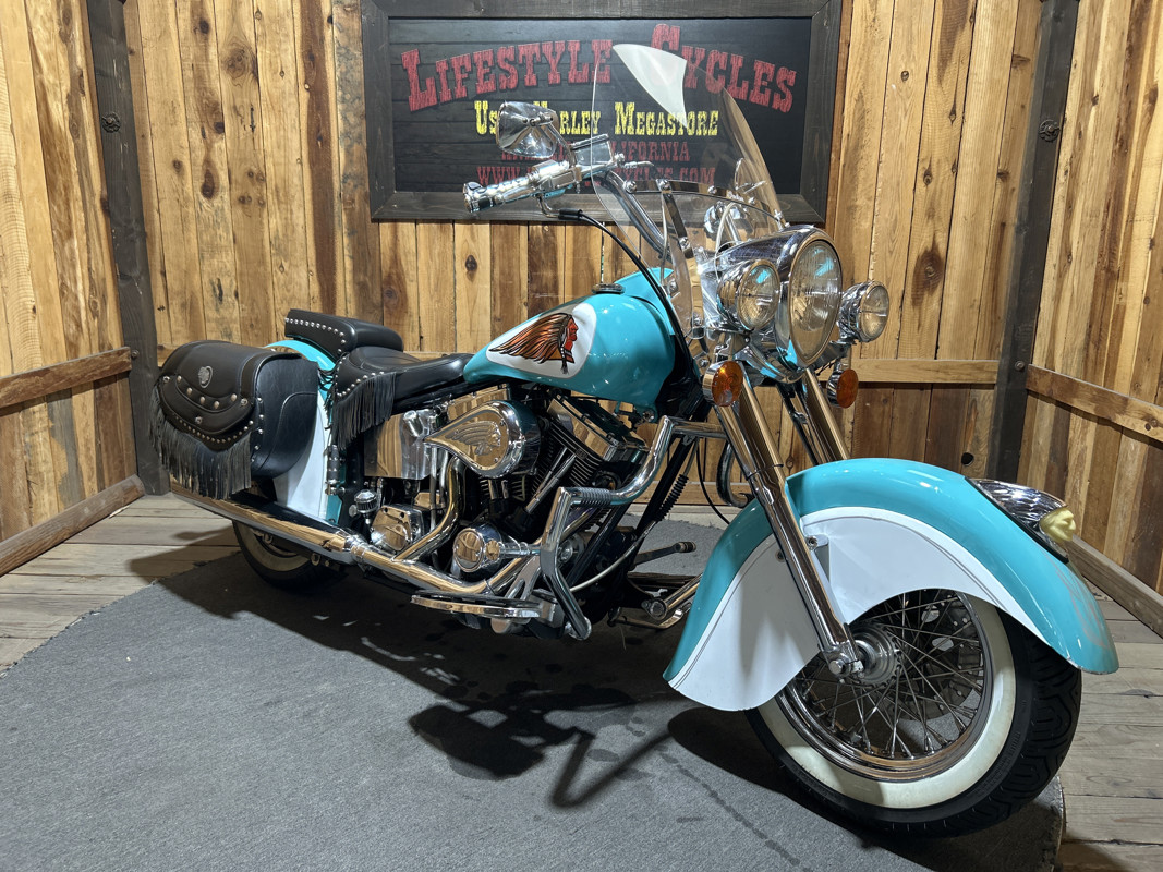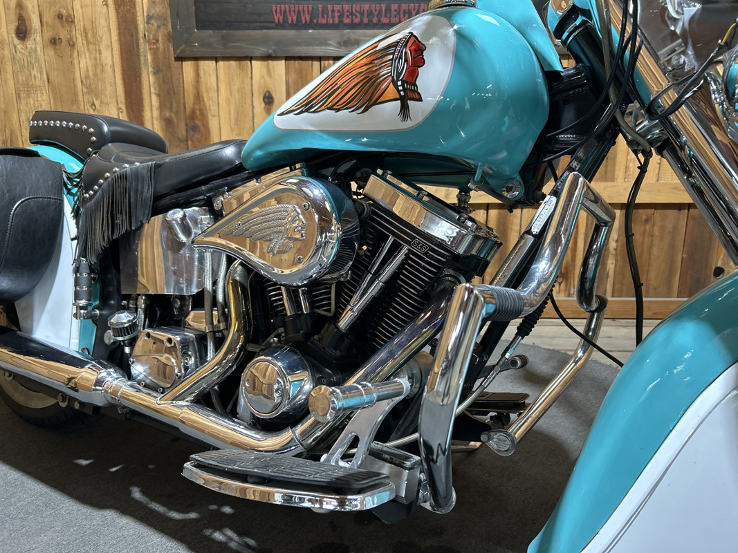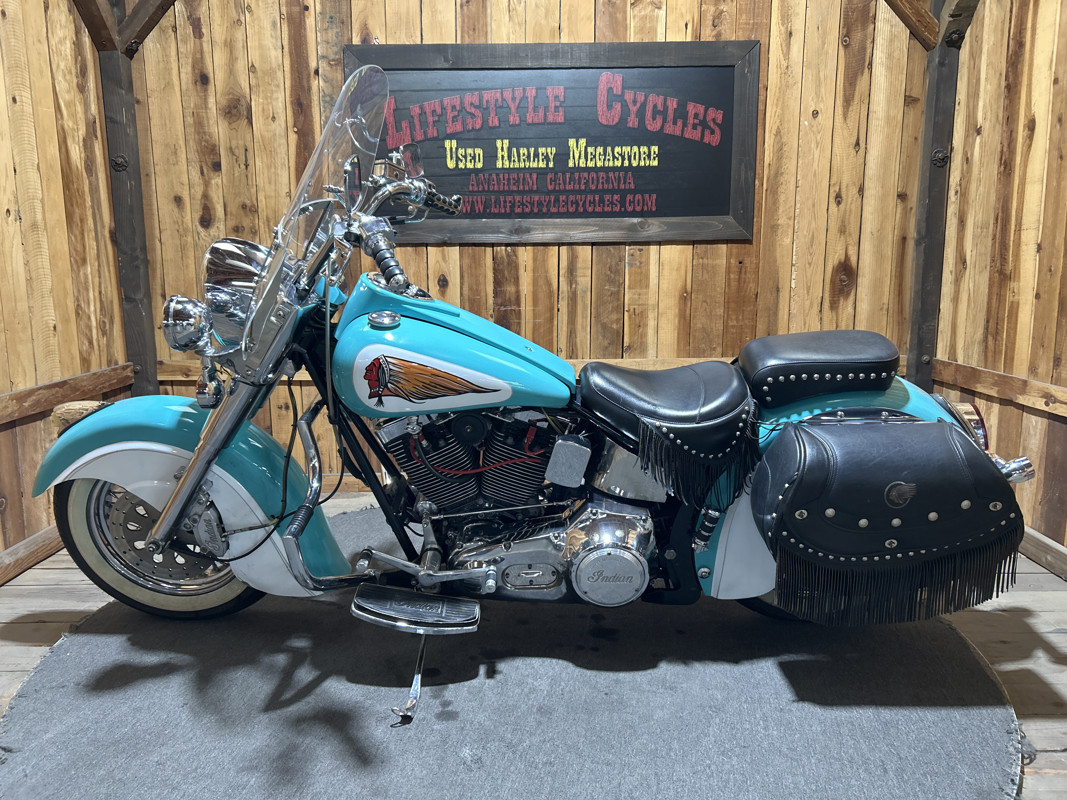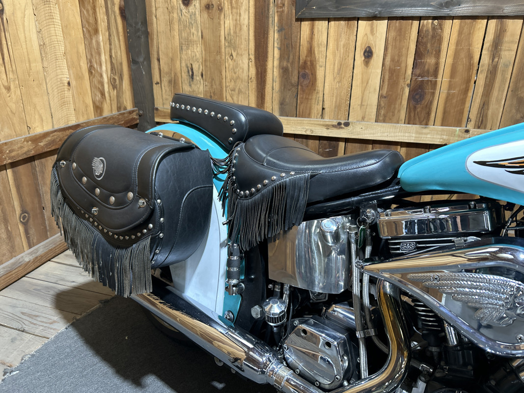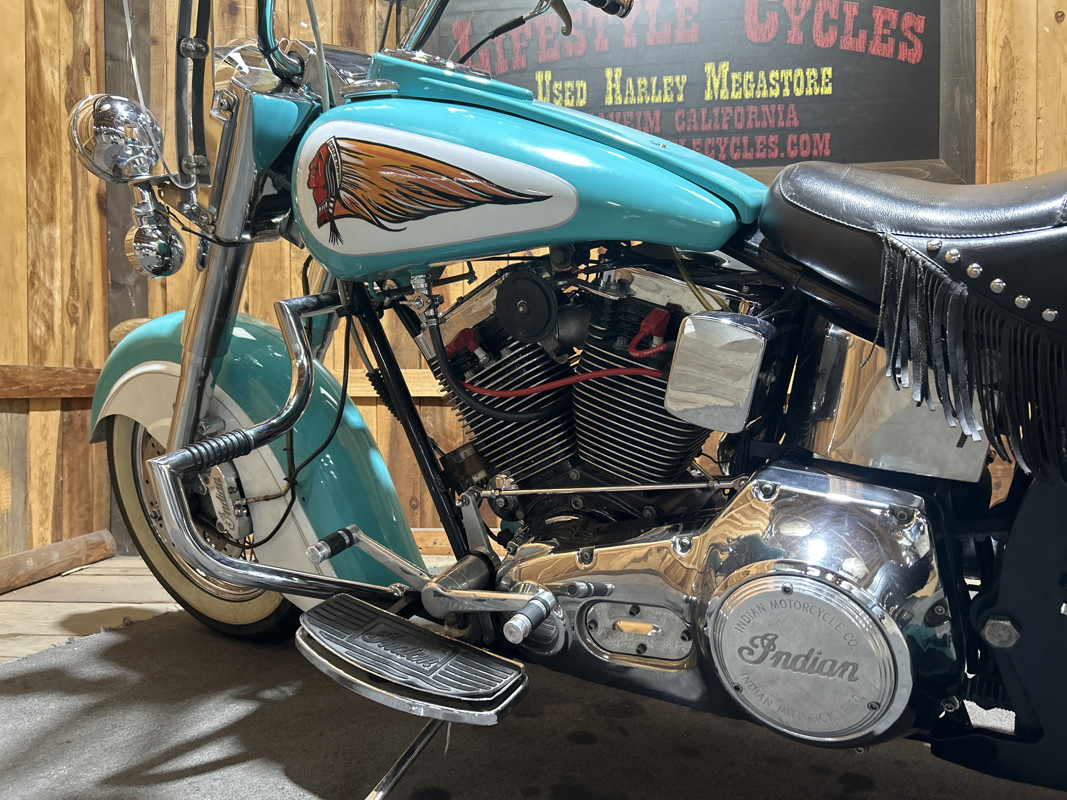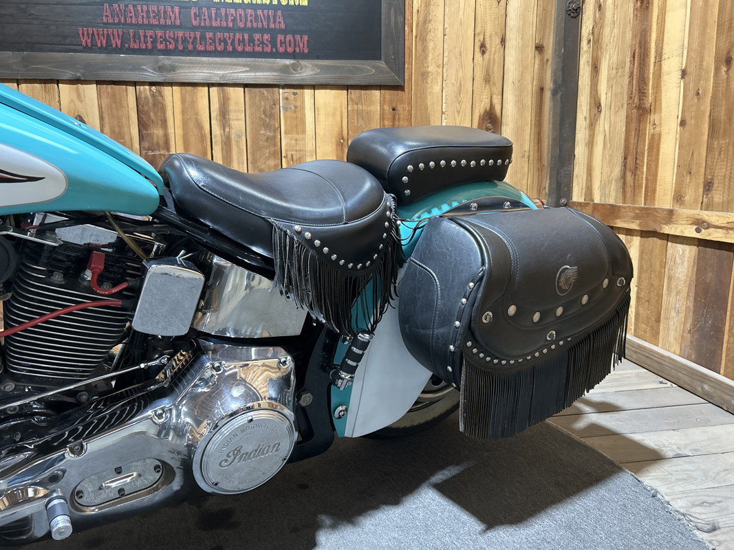 * Teal/Cream OEM Indian Paintjob * S and S 88 Cubic Inch V-Twin Motor * 5 Speed Transmission * S and S Carburetor * Chrome Engine Guard * Chrome 2 into 1 Exhaust * Indian Leather Saddlebags * Solo Rider Seat with Passenger Seat Pad