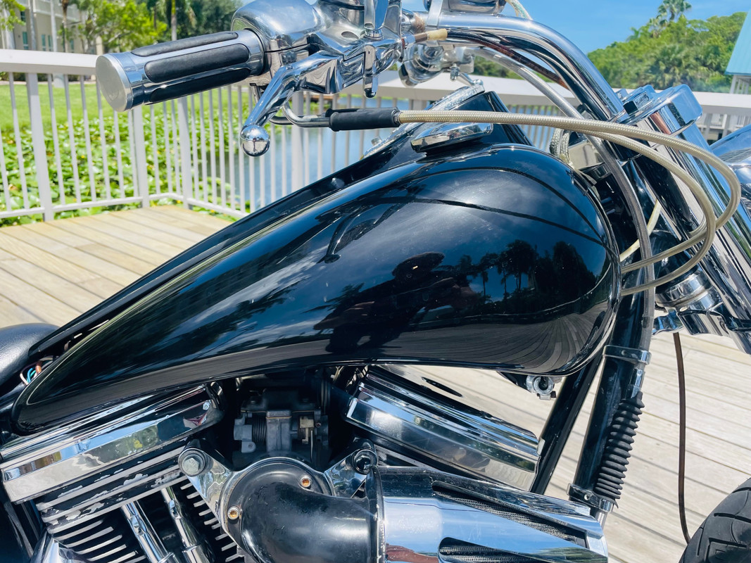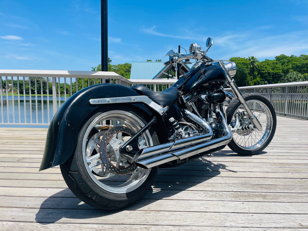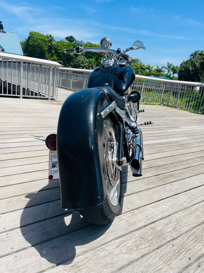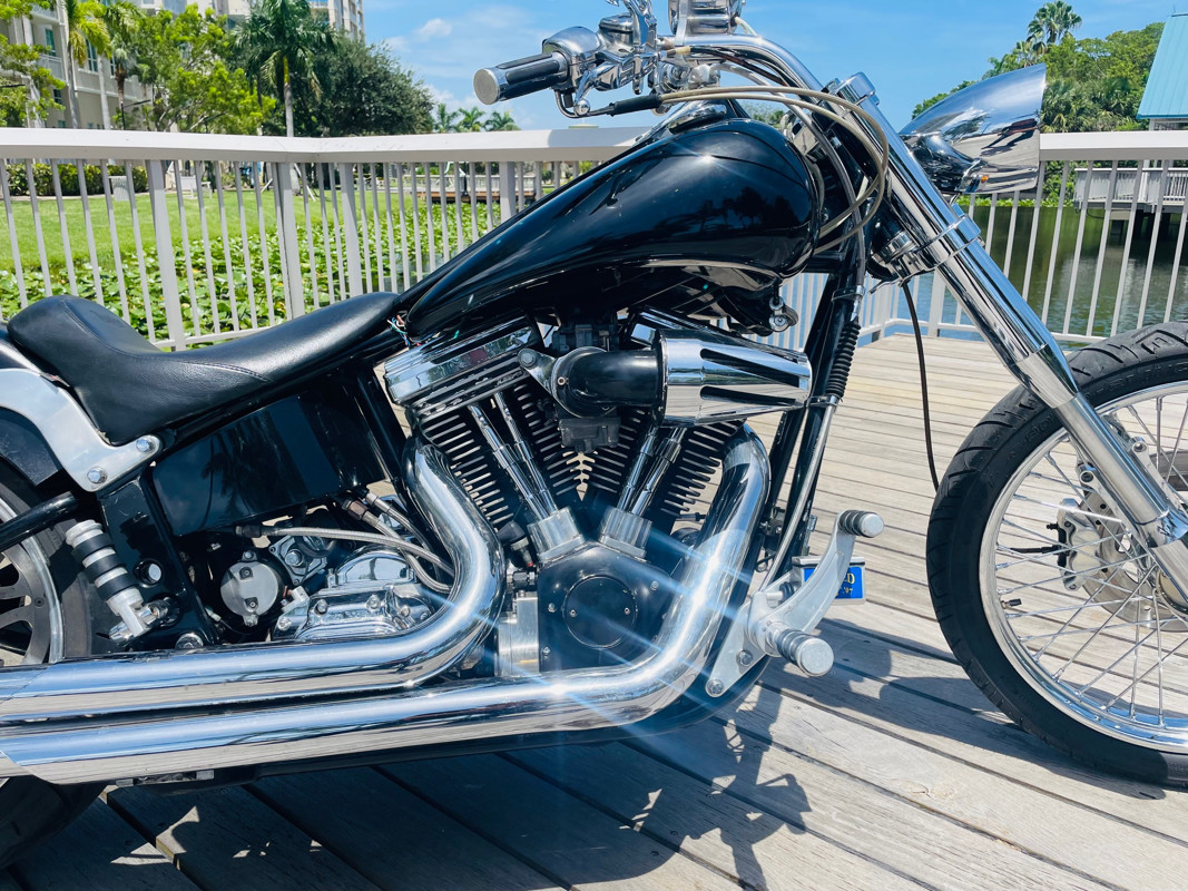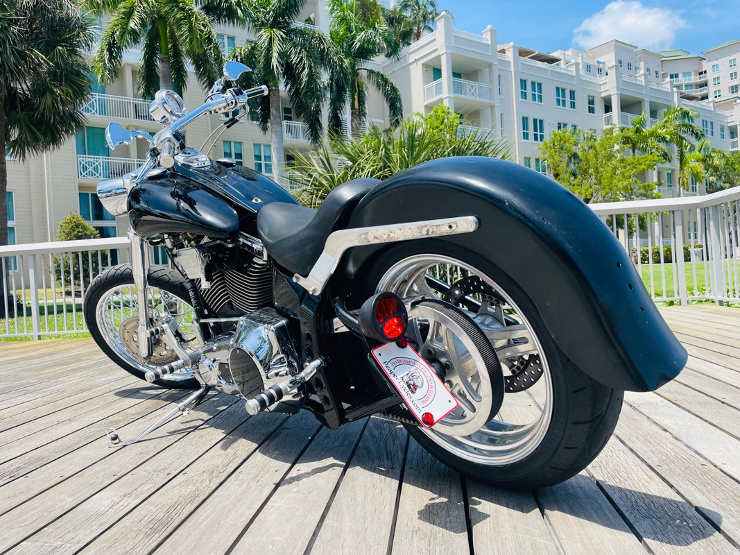 This Big Dog Wolf is a nice bike in good overall condition with the typical flaws of a 20+ year old bike. Some chrome peeling here and there and the occasional paint chip. The rear fender has been replaced for a full cover fender that needs some attention. No rear turn signals. This bike is a great bike for someone who is hoping to make a few more modifications. It runs, needs a few minutes to warm up and run without the choke. Lithium battery powered.