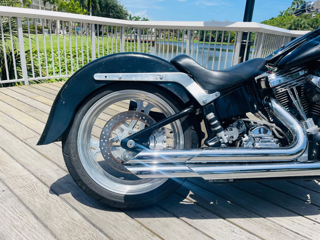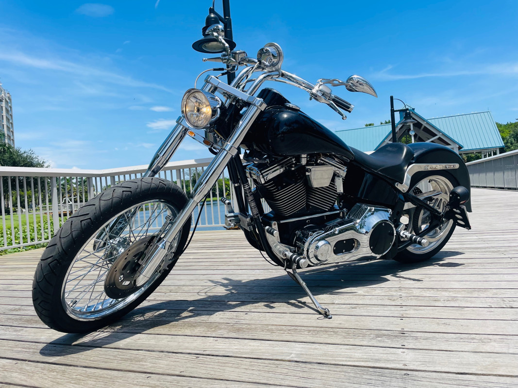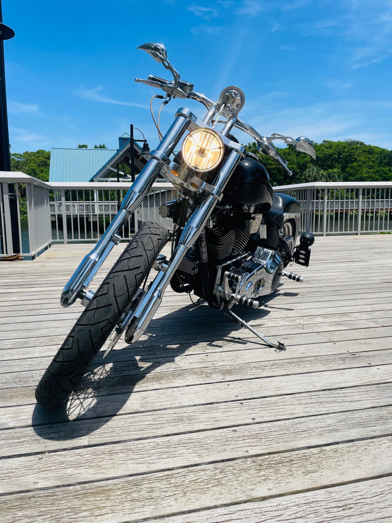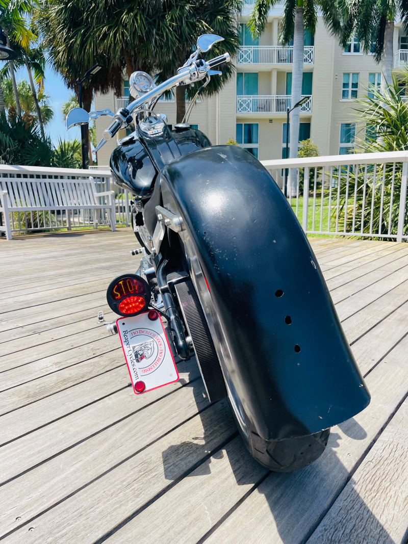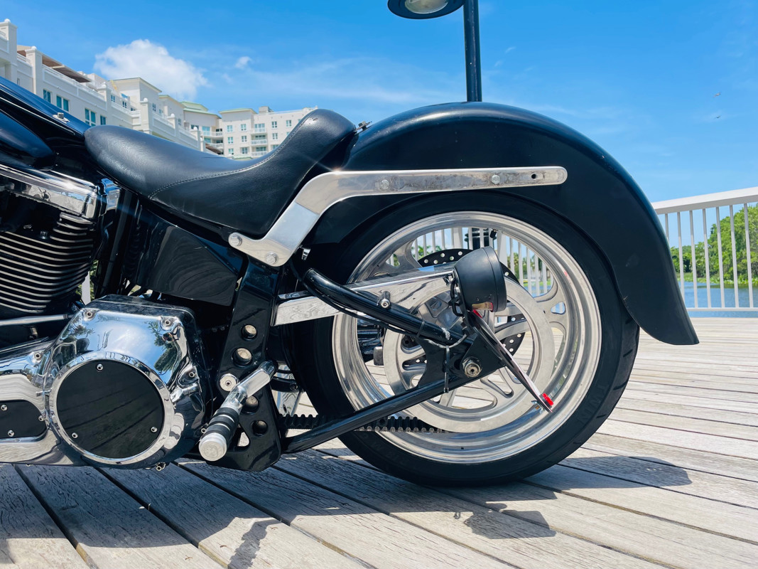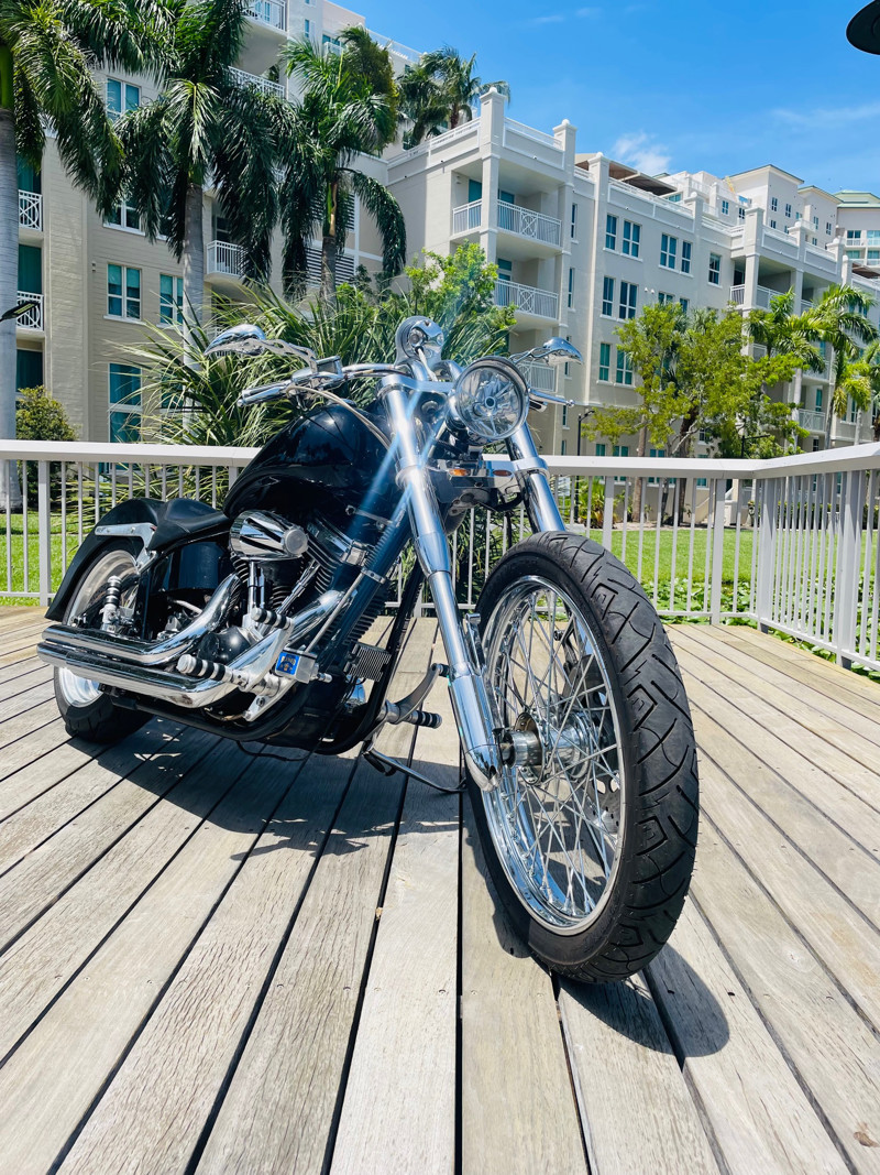This Big Dog Wolf is a nice bike in good overall condition with the typical flaws of a 20+ year old bike. Some chrome peeling here and there and the occasional paint chip. The rear fender has been replaced for a full cover fender that needs some attention. No rear turn signals. This bike is a great bike for someone who is hoping to make a few more modifications. It runs, needs a few minutes to warm up and run without the choke. Lithium battery powered.