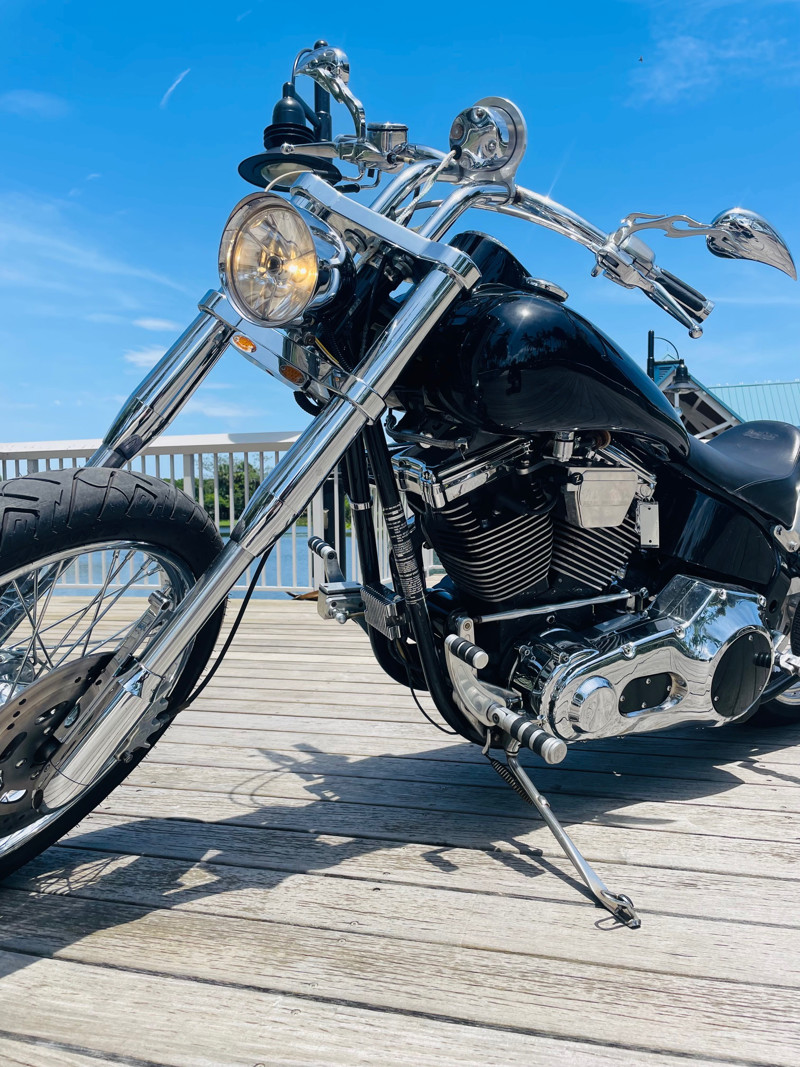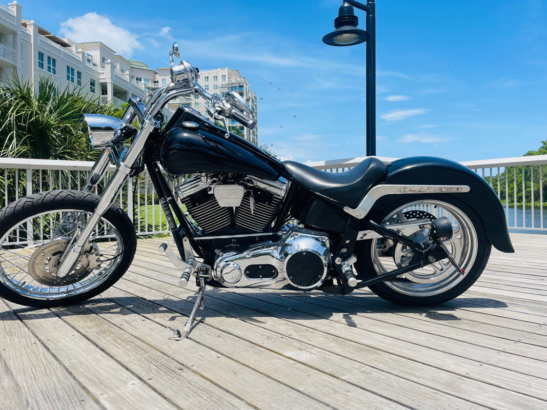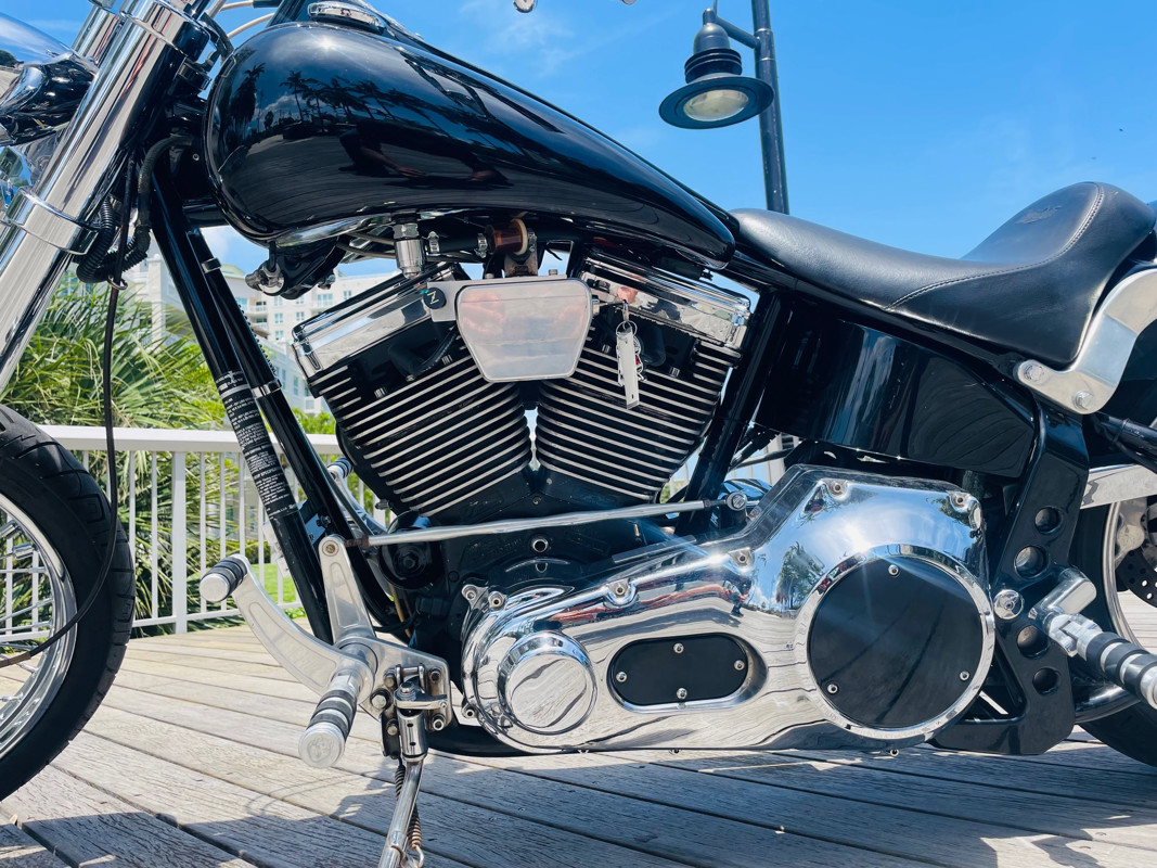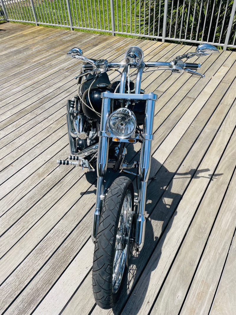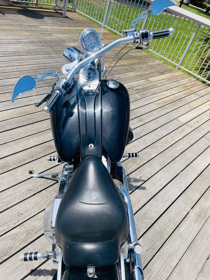 This Big Dog Wolf is a nice bike in good overall condition with the typical flaws of a 20+ year old bike. Some chrome peeling here and there and the occasional paint chip. The rear fender has been replaced for a full cover fender that needs some attention. No rear turn signals. This bike is a great bike for someone who is hoping to make a few more modifications. It runs, needs a few minutes to warm up and run without the choke. Lithium battery powered.