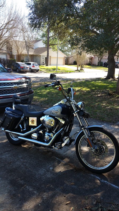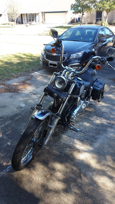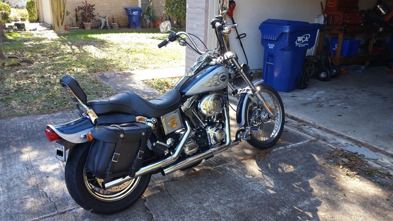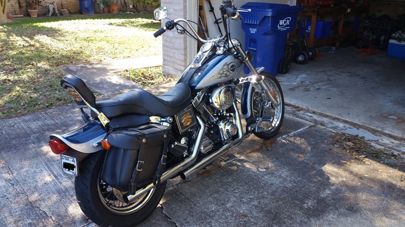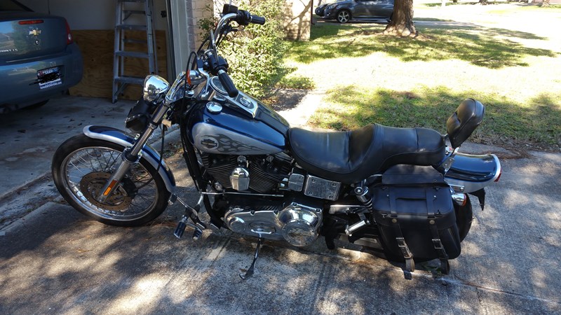 2002 FXDWG Sinister Blue/Diamond Ice. One Original Owner. New Battery and Rear tire. All fluids have just been changed. Vance and Hines Pipes (No Baffles). Forward controls extended 3 inches. Four inch handlebar risers. Fork brace, saddlebags. 25,000 mi. Garage kept. Excellent condition. Like New!! Runs great!! Up-to-date tags and inspection. Clean title in hand.
