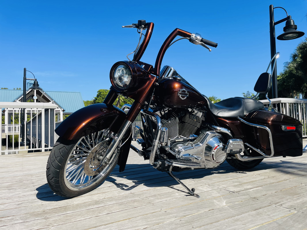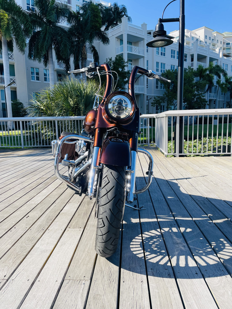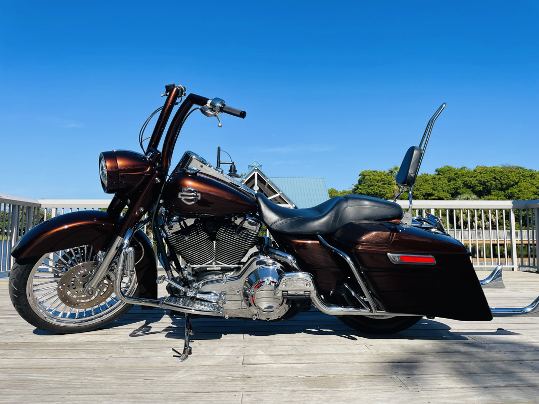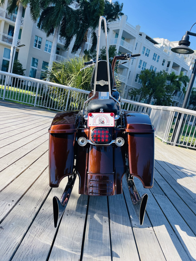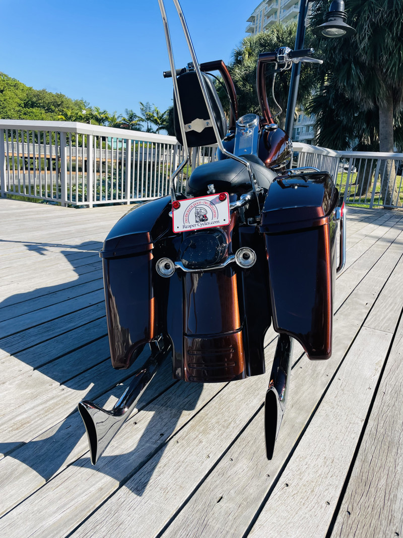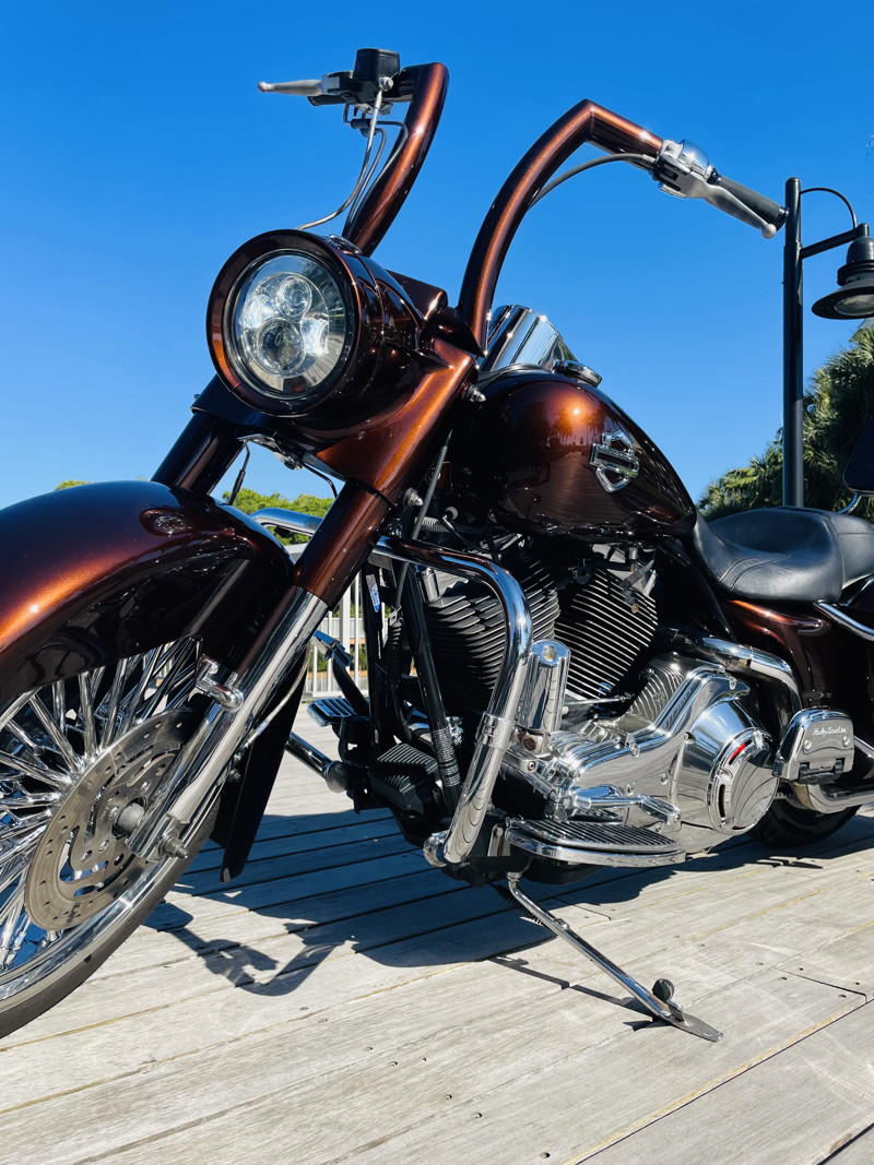 This bike has been completely customized as you can tell. From the most obvious the front 21in custom chrome wheel to the bags, the rear fender, the front fender, the handlebars the everything. Painted in the famous root beer metallic it stands out and the long fishtail pipes just make this bike even more attractive. On the walk around video you can hear a front cylinder exhaust leak that is being fixed. Rear turn signals are not working and there are no front turn signals. This bike is amazing in every aspect.