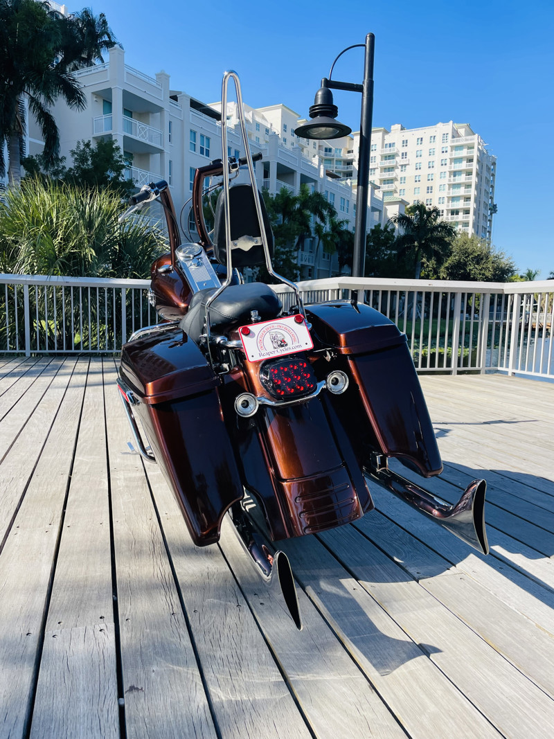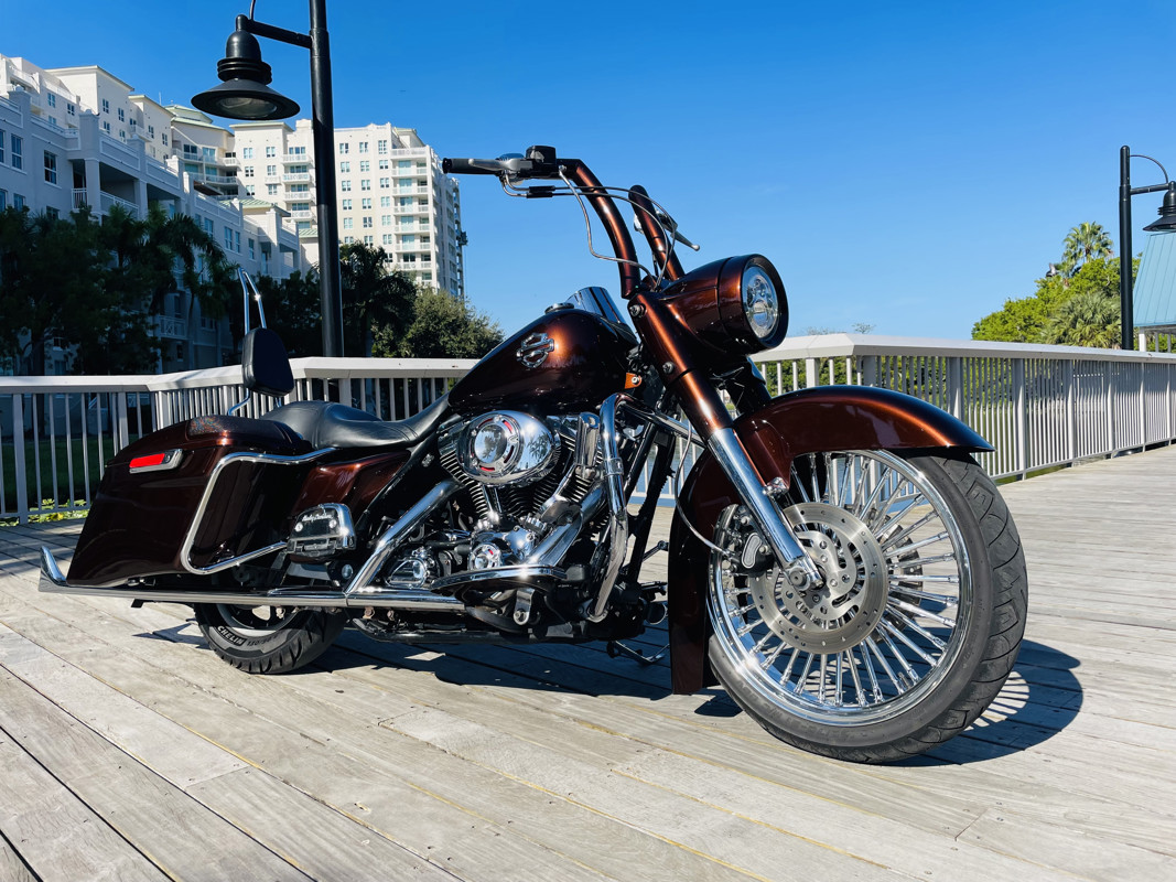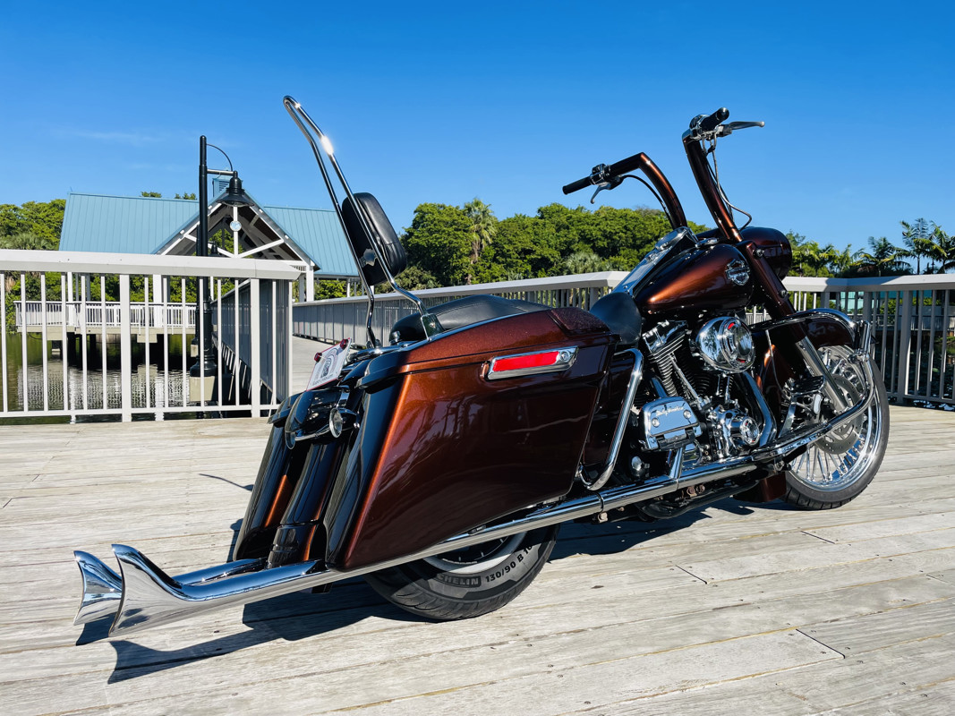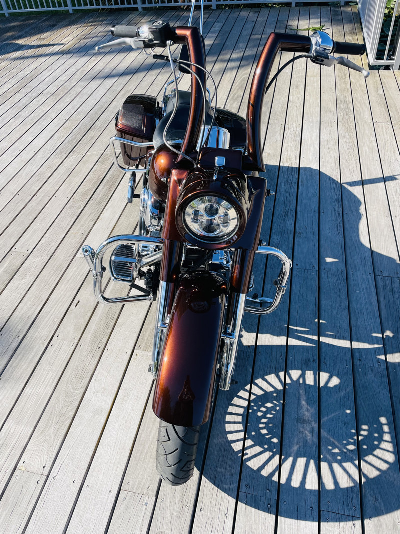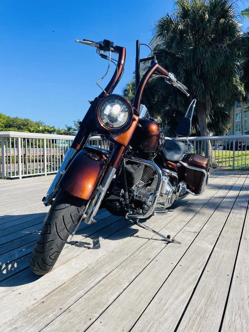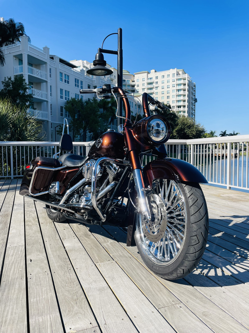 This bike has been completely customized as you can tell. From the most obvious the front 21in custom chrome wheel to the bags, the rear fender, the front fender, the handlebars the everything. Painted in the famous root beer metallic it stands out and the long fishtail pipes just make this bike even more attractive. On the walk around video you can hear a front cylinder exhaust leak that is being fixed. Rear turn signals are not working and there are no front turn signals. This bike is amazing in every aspect.