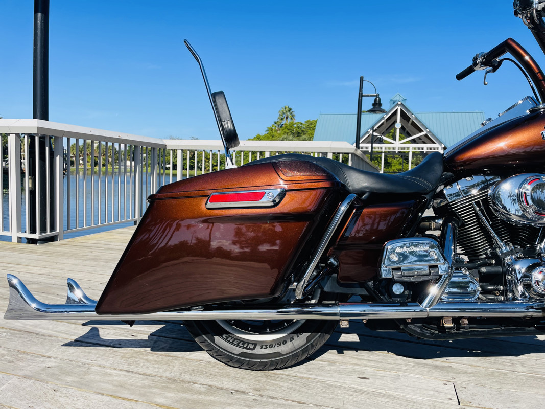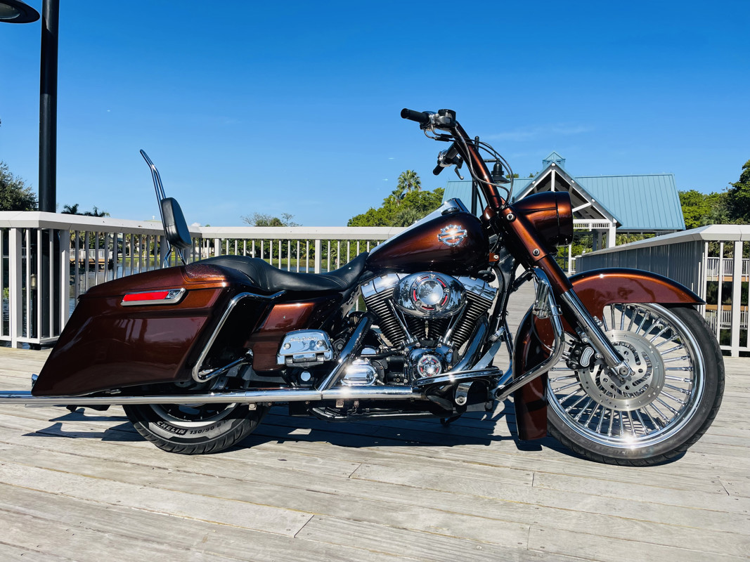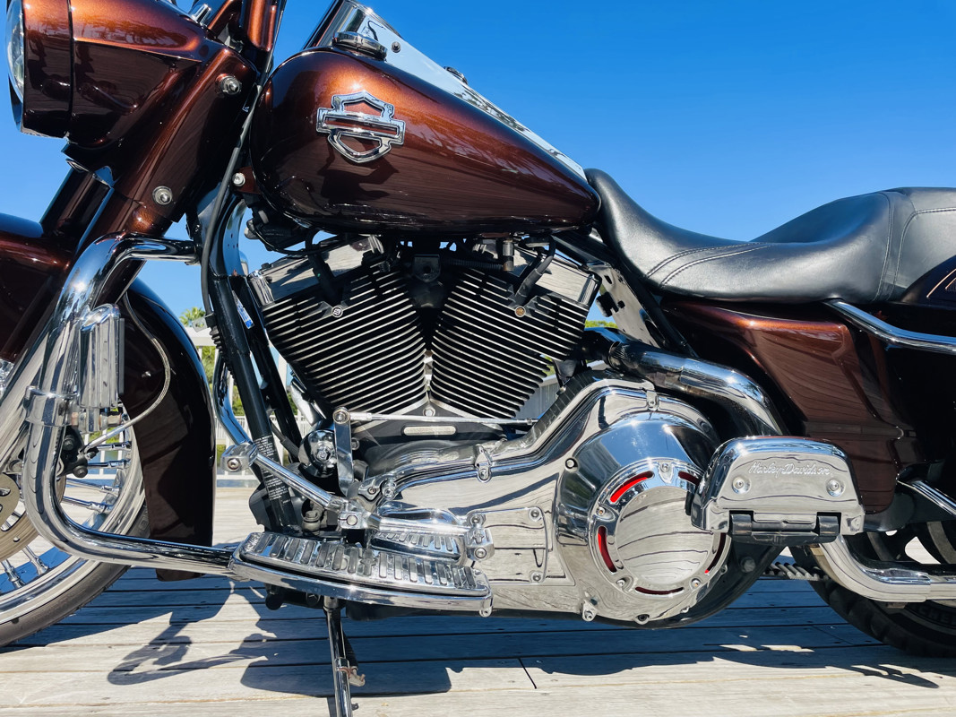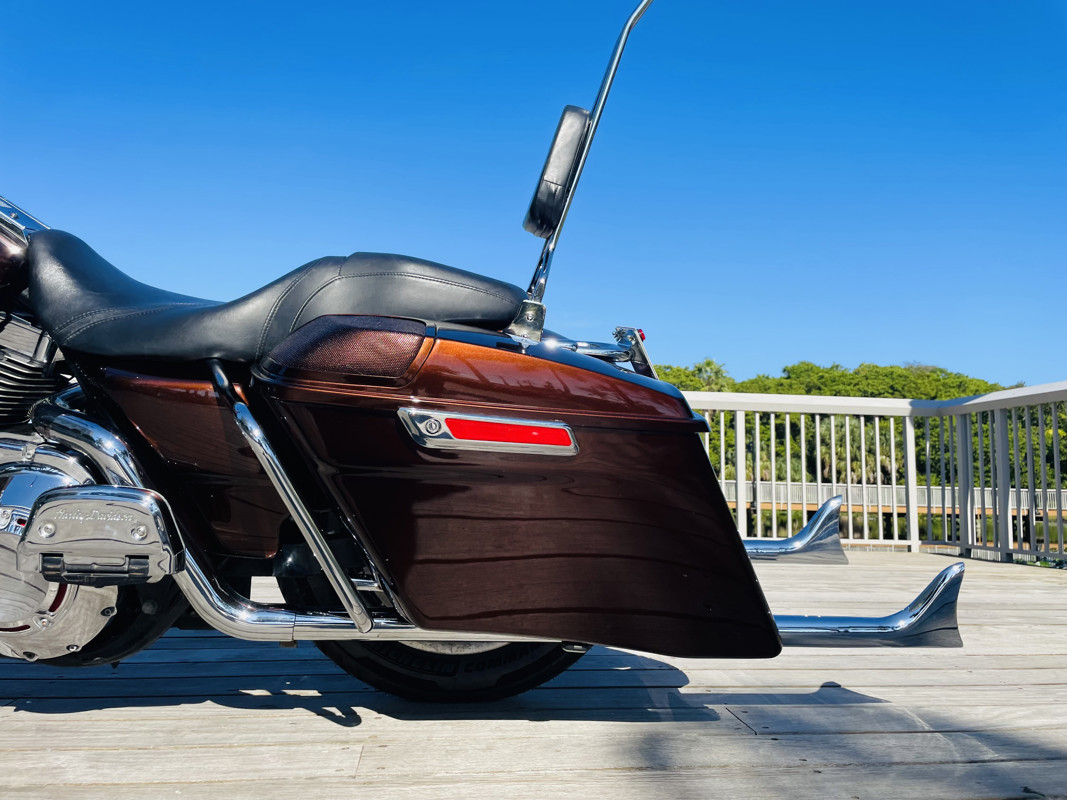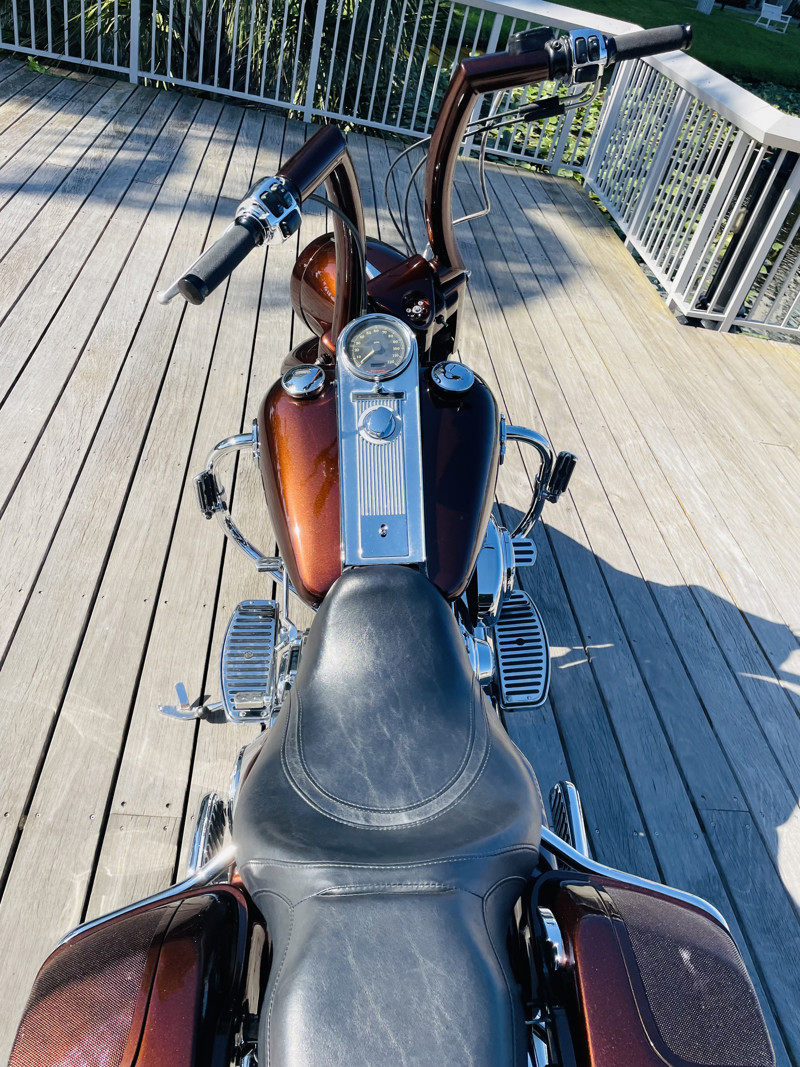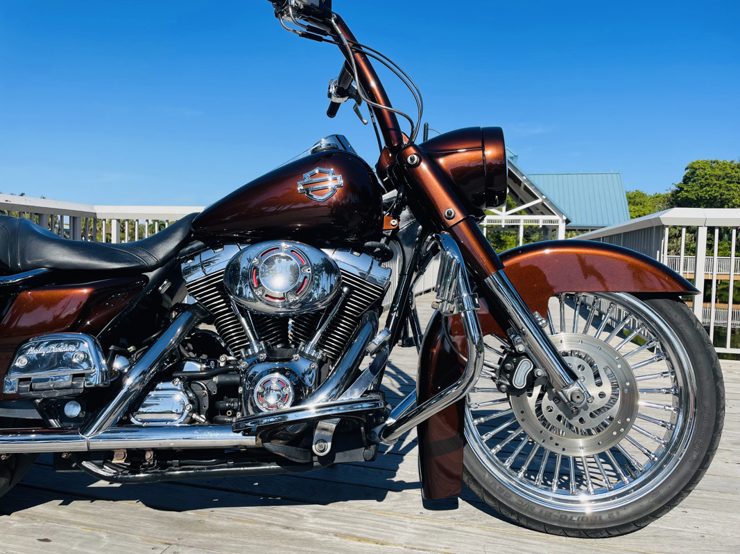 This bike has been completely customized as you can tell. From the most obvious the front 21in custom chrome wheel to the bags, the rear fender, the front fender, the handlebars the everything. Painted in the famous root beer metallic it stands out and the long fishtail pipes just make this bike even more attractive. On the walk around video you can hear a front cylinder exhaust leak that is being fixed. Rear turn signals are not working and there are no front turn signals. This bike is amazing in every aspect.