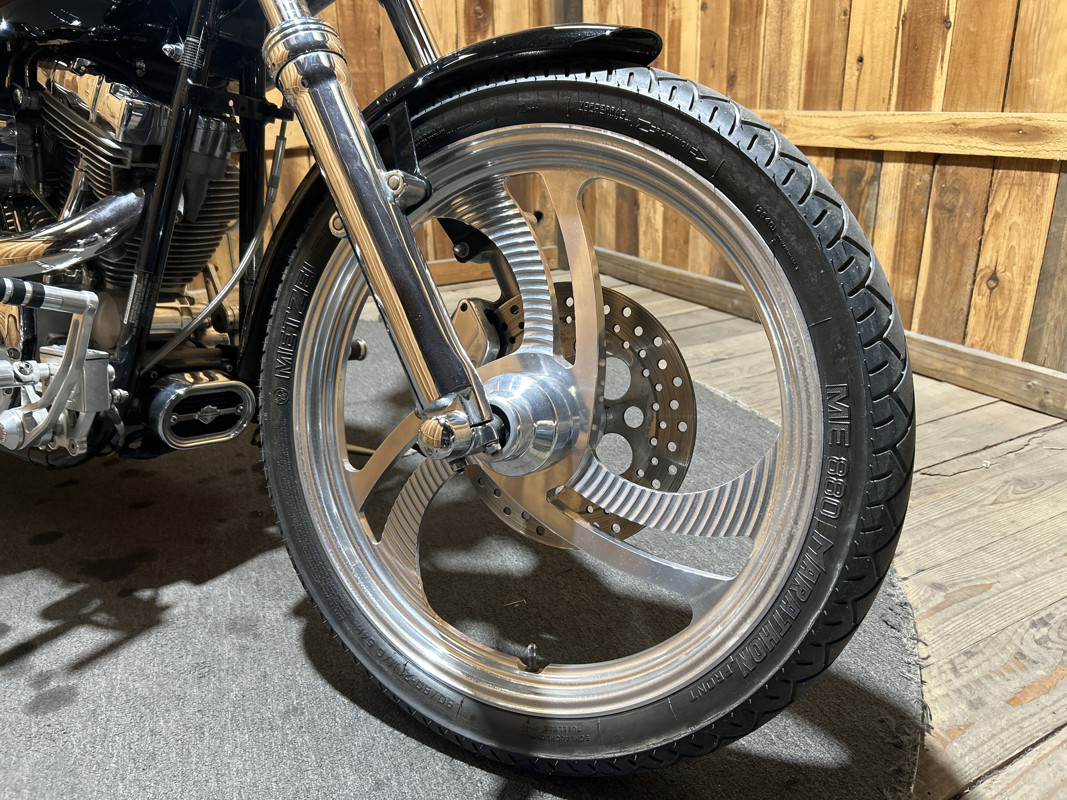 * Rinehart Racing Dual Chrome Exhaust * S and S Super E Carburetor with Chrome Cover * Solo Seat with Blue Flame Stitching * Accutronix Chrome Slotted Forward Controls * Solid Black Paintjob * All Blond Motor Cases * Passenger Foot Pegs * Chrome Luggage Rack * 8-Inch Chrome T-Bars with 1 1/2-Inch Pullback * Stainless Steel Braided Cables * 21-Inch Front and 18-Inch Rear Chrome 3 Spoke Wheels