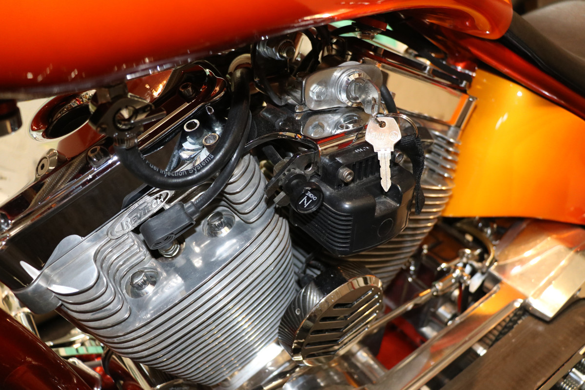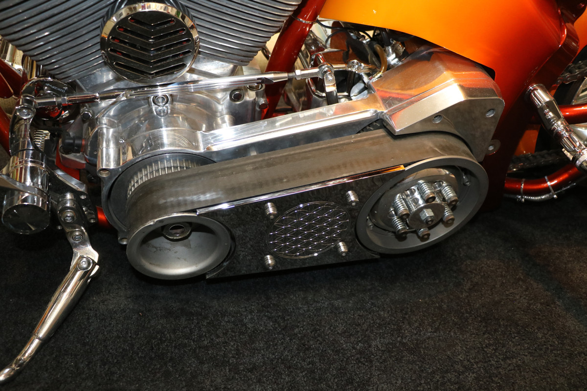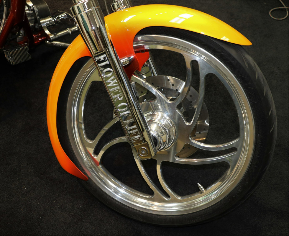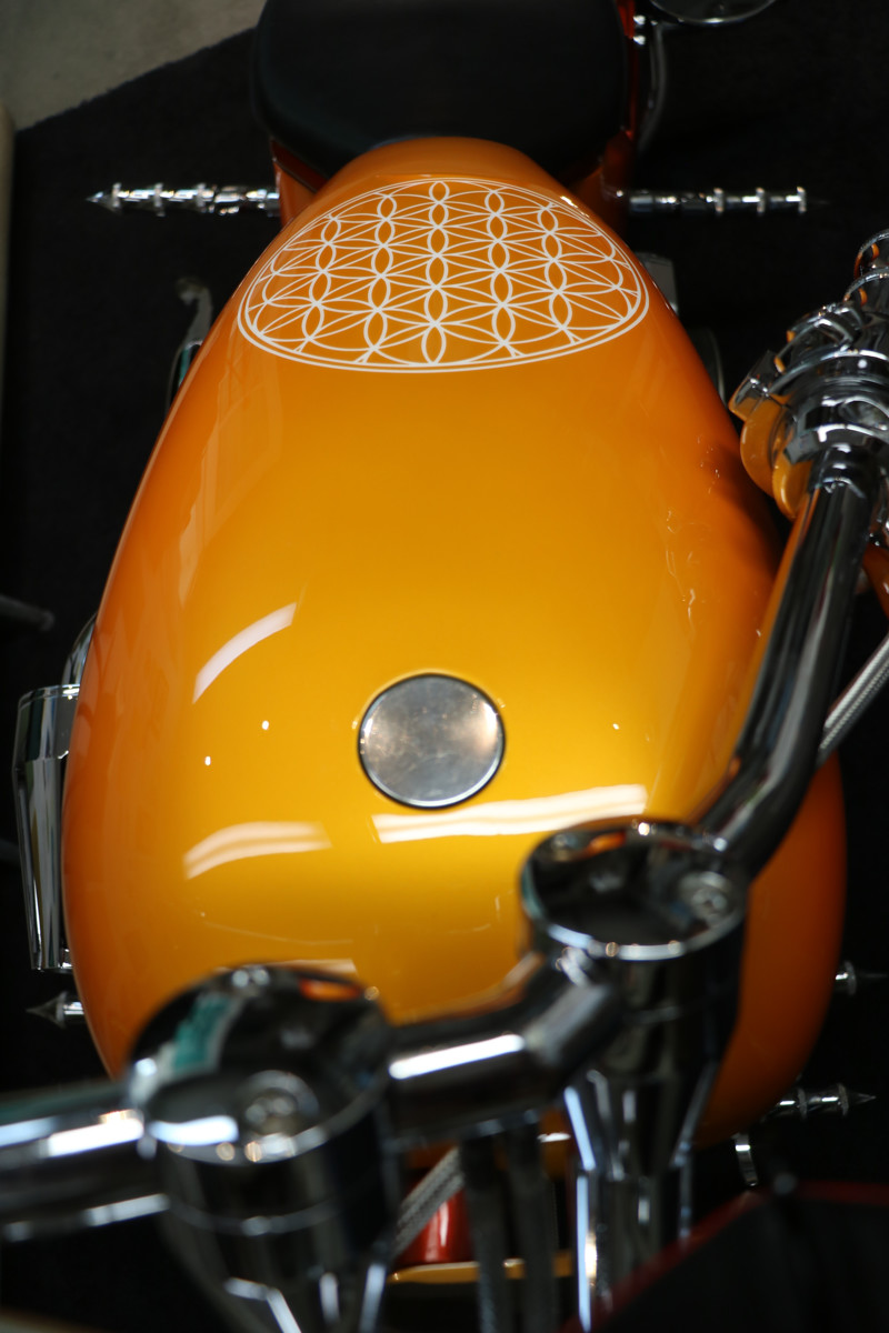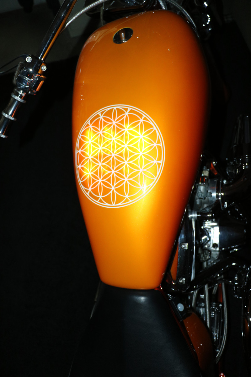 The theme is the Flower of Life design, seen around the world and utilized by Master Artists such as Leonardo da Vinci. This design is expertly created in paint on the tank and etched into the custom primary cover as well as the words etched on the fork lowers.
