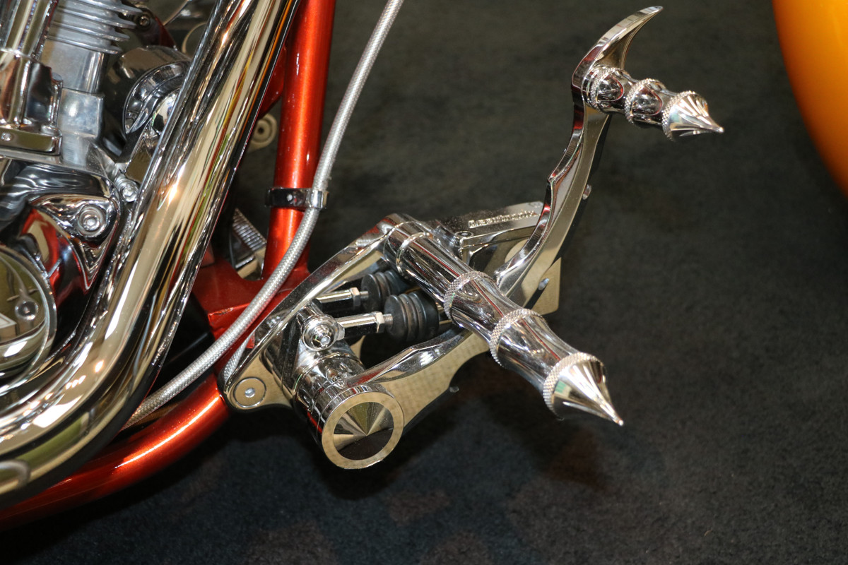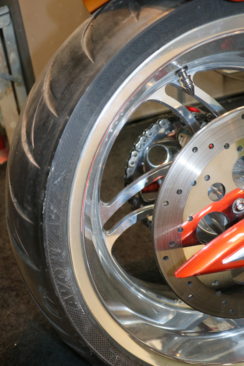 Billet aluminum rims: 21" front, 250" rear. Avon Cobra rubber.