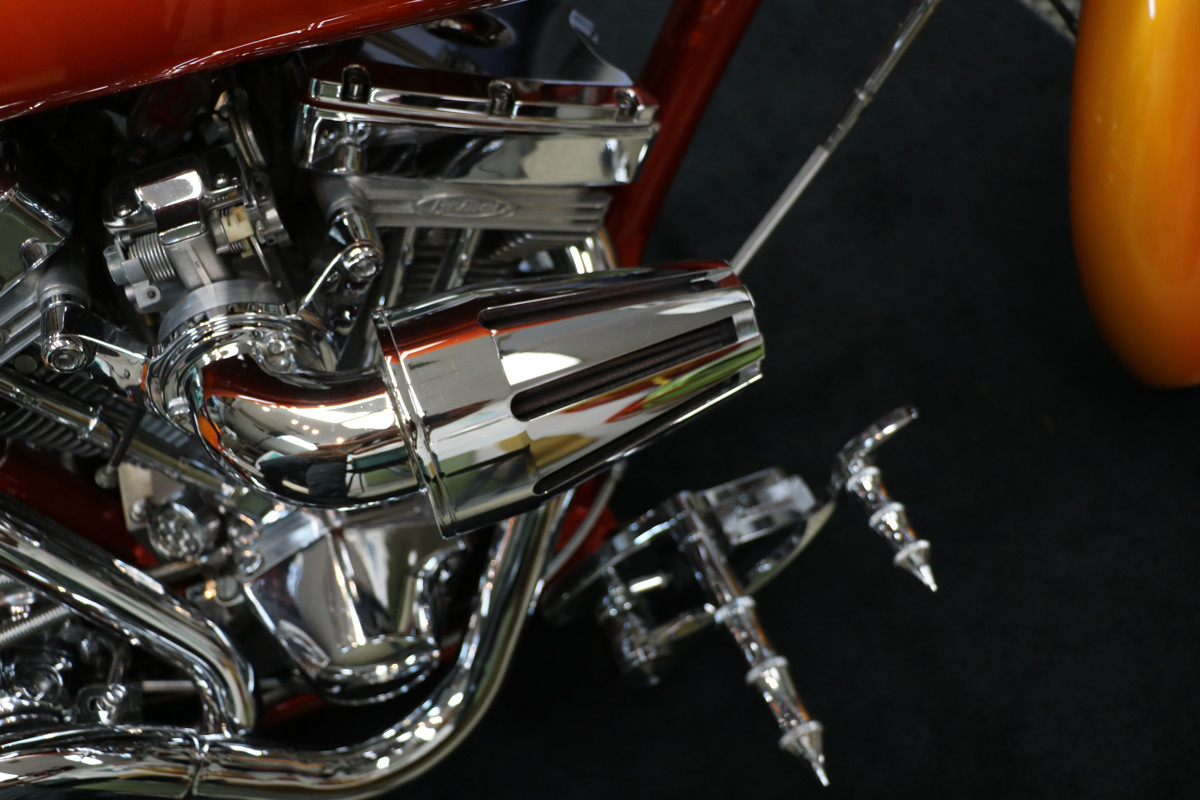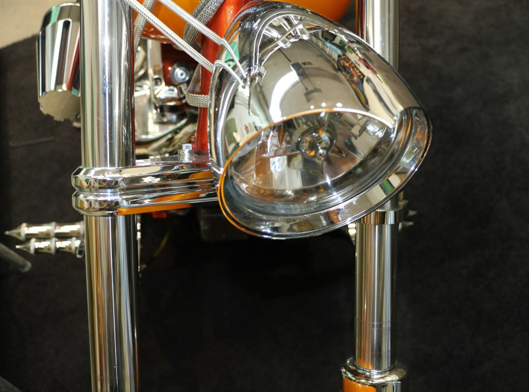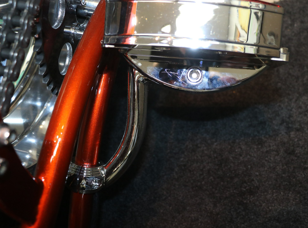 Not all of the parts were re-chromed. Just those that really needed it, so the top of the gear box has some swirls (see photo) and the top portion of the license plate where it attaches was scratched during assembly. The paint is fresh minus the underside of the frame (see photo) where it bottomed out while loading it into the trailer and a little rock chip on the oil tank that is only visible at a certain angle but won't photograph. That, the mechanic did.