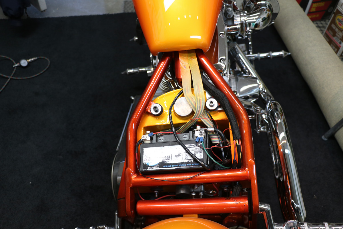 The makeover on this bike (completed in 2019) includes embedding LEDs with a flickering fire pattern into the metal gas tank, operated via remote.