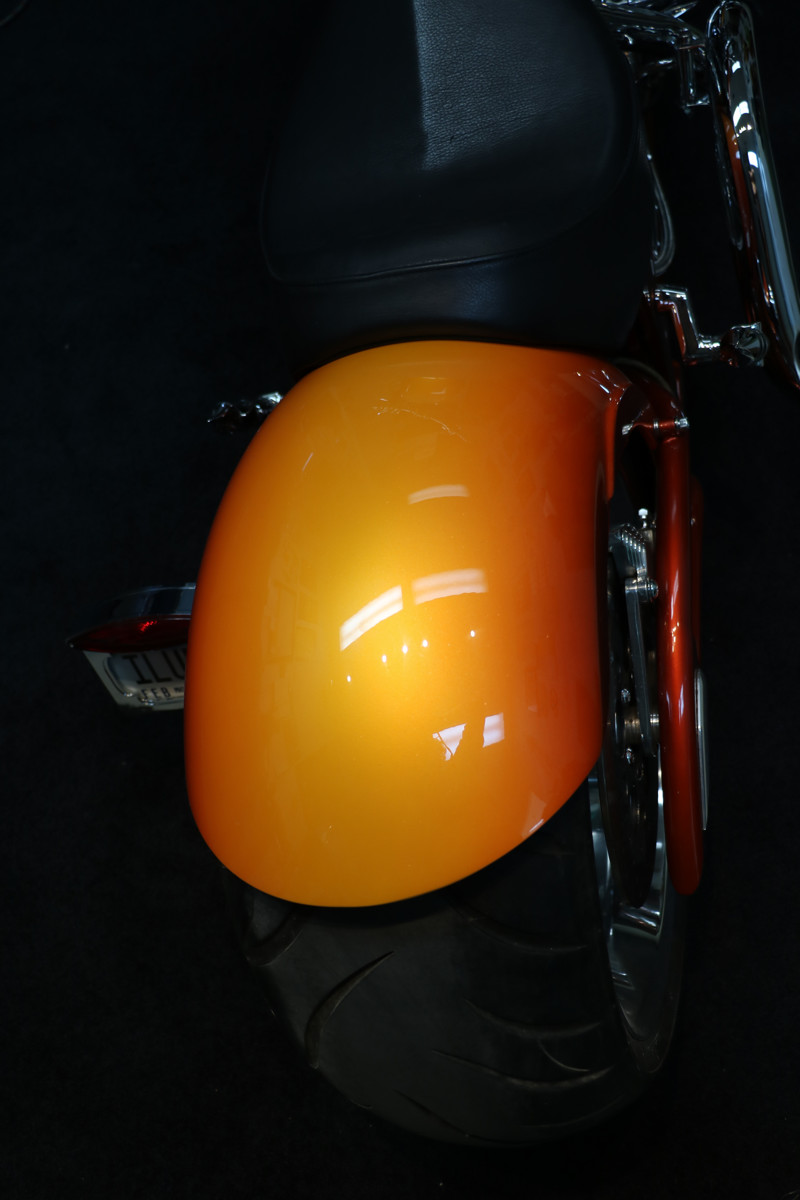 The fresh paint scheme is a fade of five fire colors - bronze to yellow - sprayed in House of Kolor pearls and kandys by the Award Winning paint company Customized Creations. The graphics are in white.