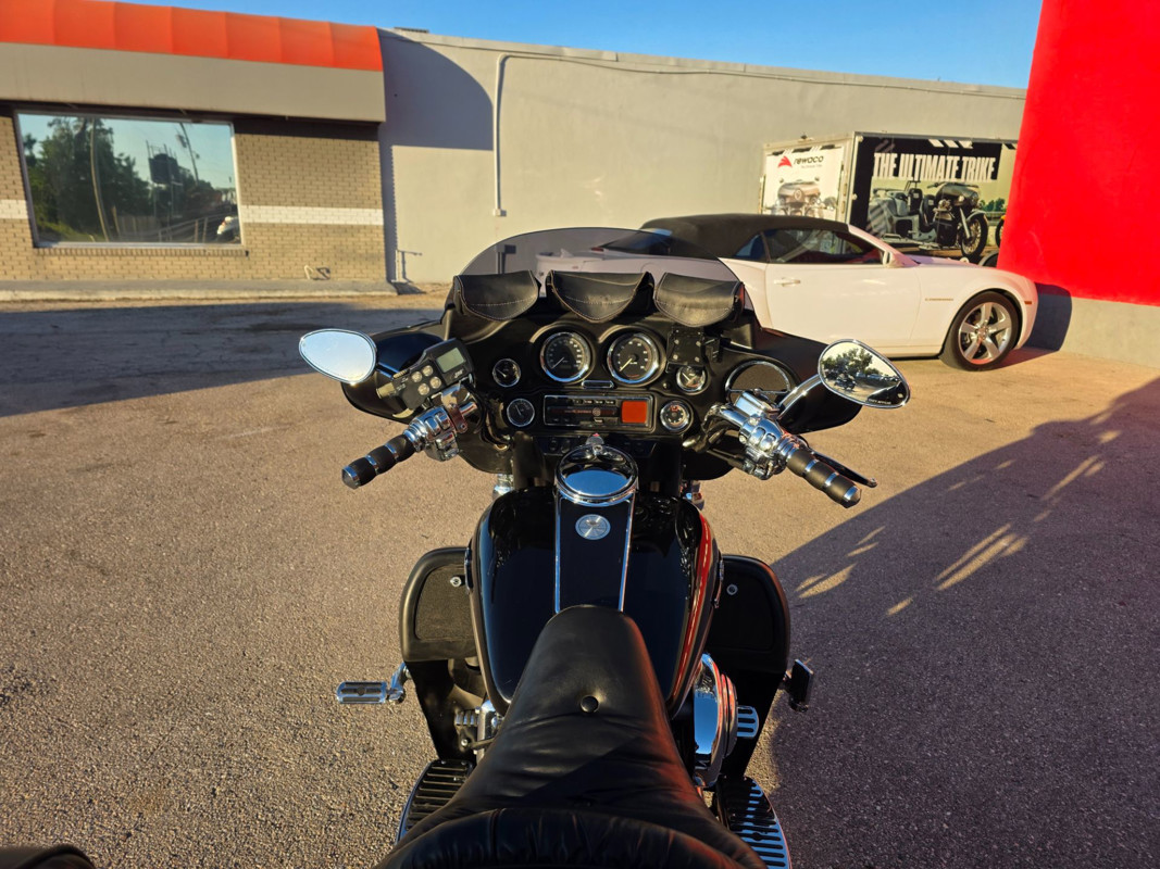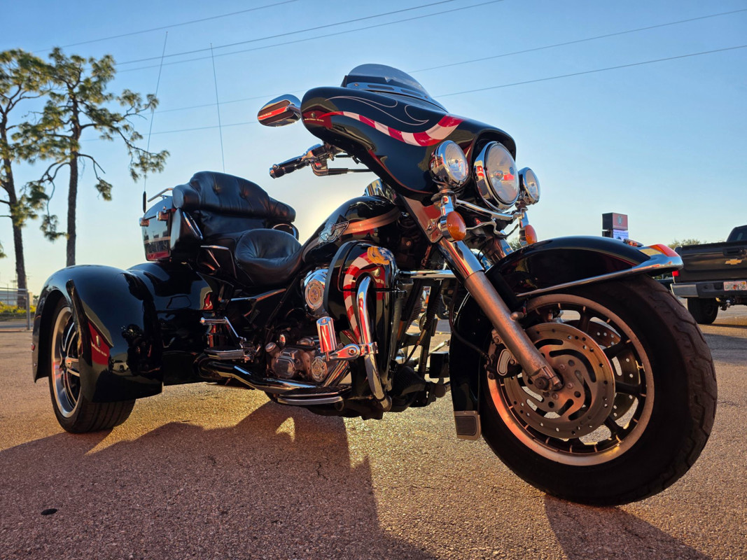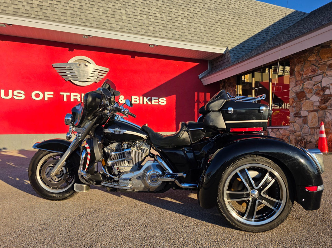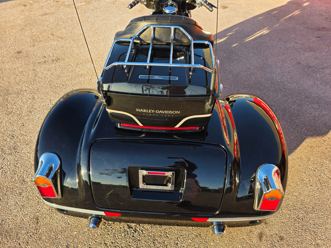 Professionally installed California Side car trike kit with independent rear suspension. 100th Anniversary FLHT/FLHTI Electra Glide® Standard This is the Harley touring experience taken down to pure form. The Electra Glide® Standard. It starts with a Twin Cam 88® engine at center stage. Choose a traditional carb. Or new for 2003, the sophisticated, heat-managed EFI system we debuted in our other touring rigs last year. You also benefit from last year's chassis improvements. Big miles are smoother than ever. We kept the Standard's style minimalist from there, then decked it out for the Anniversary. This one has Vivid Black paint, 100TH tank cloisonné and model nameplate. You also get lockable hard bags. Generous boards. And a comfortable seat. We could think of no better place to park it for the million miles of road that lay ahead. * MSRP may not reflect vehicle shown. See Additional Features for specific color/option pricing.