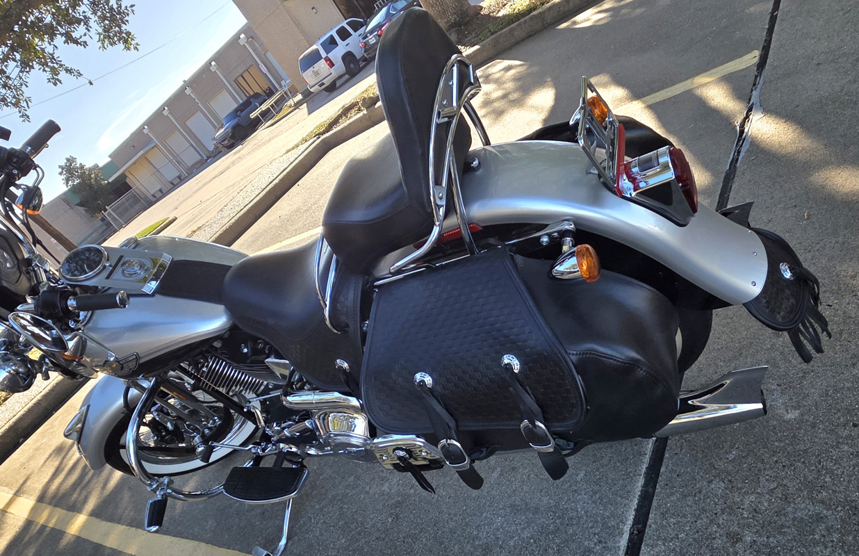Chrome is in great shape. Leather and bags are in very nice shape. No scratches, dings, or dents. Always Garaged, well maintained. This bike is classic and beautiful. Anniversary Silver Rare bike, turns heads everywhere it goes!