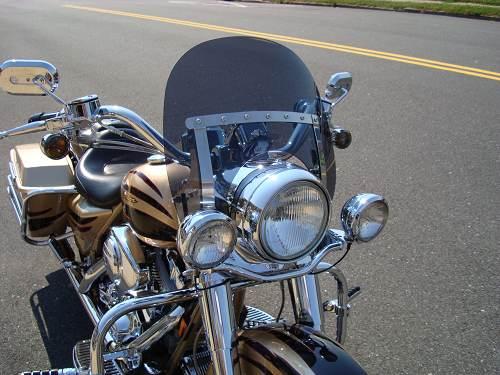 Rider and passenger enjoy a custom leather seat with chrome buttons, adjustable rider backrest and detachable passenger backrest. The dark Lexan custom mini wind deflector is detachable and other features include cruise control, a H-D factory security system with siren and a custom indoor storage cover.