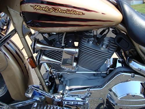 Based on the popular FLHRI Road King model, the 2003 CVO Screamin' Eagle Road King featured a host of exclusive custom features and accessories from Harley-Davidson Genuine Motor Accessories. The heart of the 2003 Screamin' Eagle Road King, however, is the engine created by combining Screamin' Eagle Big Bore cylinders and a stroker flywheel and rod assembly to the standard Harley-Davidson Twin Cam 88 engine. Bore and stroke grew from 3.75 x 4.00 inches to 3.87 x 4.37 inches, while displacement was boosted from 88 ci (1450cc) to 103 ci (1690cc). Compression was bumped up slightly, from 8.9:1 to 9.0:1.