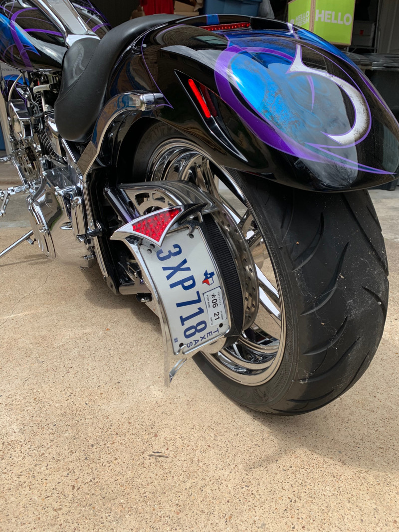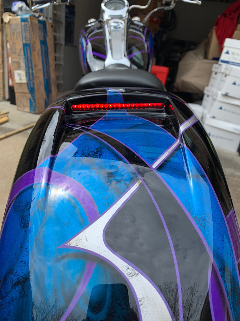 The rear fender has been redesigned with recessed blinkers and break light that have been “blacked out” making them virtually invisible until they are activated. The front head light has been resized to not over shadow the front blinkers that have been carefully placed inside the forks between the "trees". The tank has been raised to provide better “flow” as it meets the seat and also opens the view of the engine