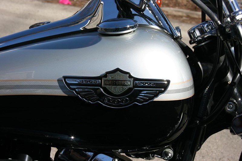 This is an opportunity to get your hands on a 100th Anniversary edition, Softail Deuce, with less than 3000 miles. This bike is not only showroom floor condition, but has been upgraded with an exceptional amount of added chrome, including Billet chrome and rubber foot pegs, all chrome electrical covers, chrome lower forks, chrome chain guards, chrome hub covers, Billet chrome hand levers, distributor cover and headlamp ring. It also comes with a chrome Deuce backrest and rack, and custom fit rear, black Harley saddle bag to fit. This bike has been stored under a custom Harley cover, in a heated garage. It gets winterized each year, has had nothing but Harley synthetic oil and premium fuel running in it, and has a brand new battery. This is practically a brand new '03, 100th Anniversary Softail Deuce, that's been amazingly maintained and barely ridden. It's just barely been broken in for you.