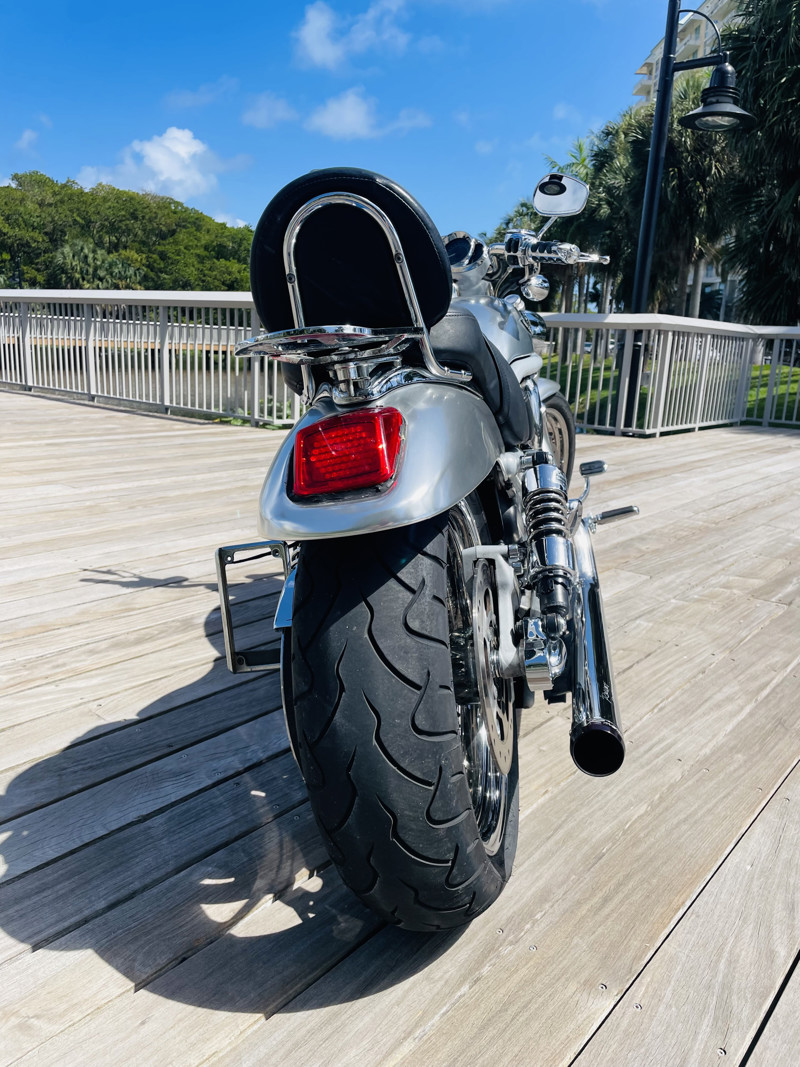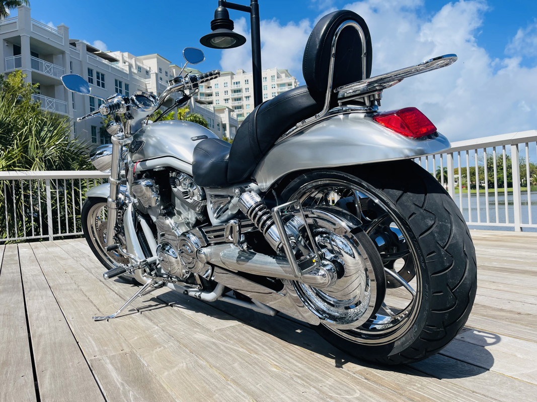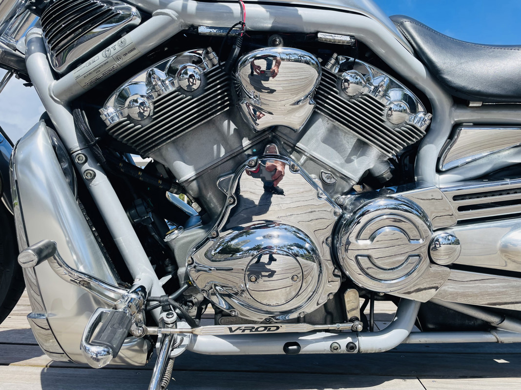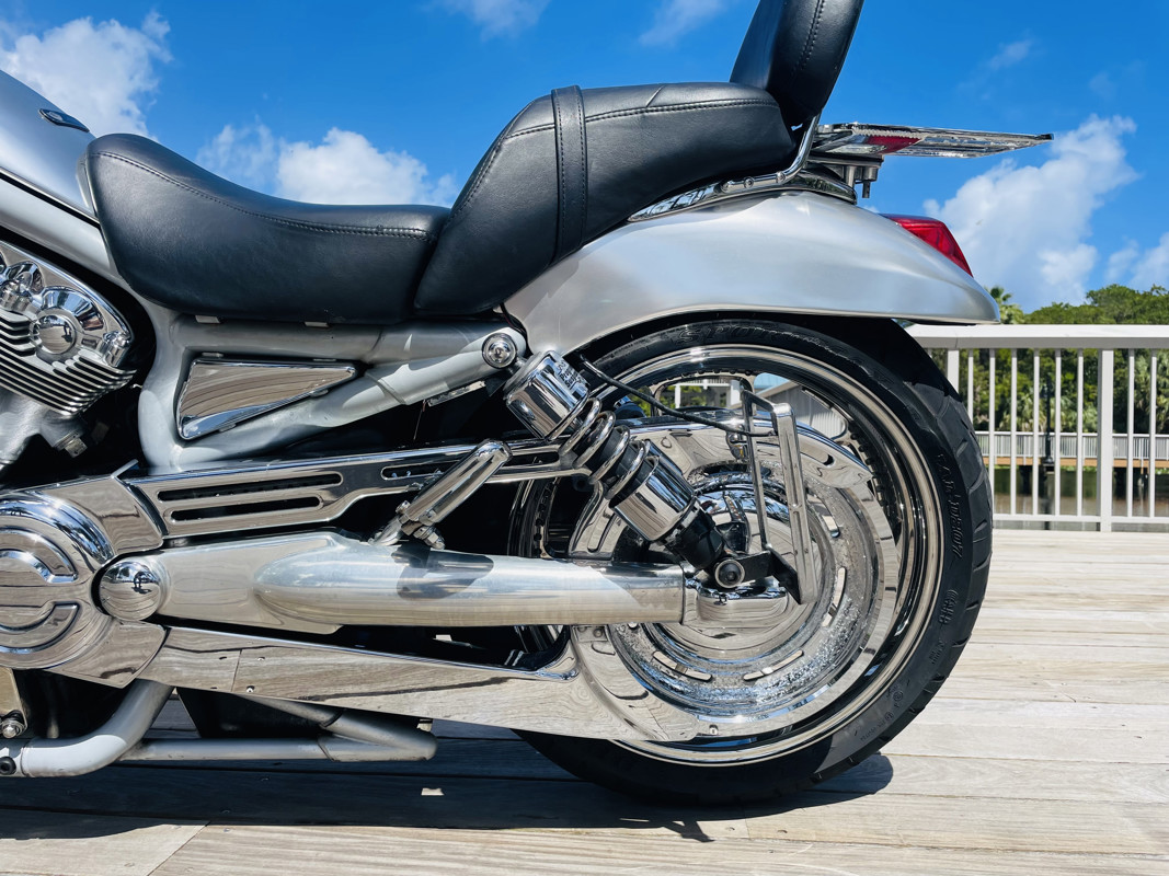 This is the 100-Year Anniversary Edition with all of its Anniversary batching. With its amazing brushed aluminum exterior and few signs of its true age. While the tires are older (2017) they do not show signs of aging. The engine runs perfect and there is no paint damage but the odd piece here and there with chrome peeling. See the walk around video on our website where we point out all the pieces. The original V-Rod wheels are solid wheels and a lot of the owners were complaining about those and replaced them with open wheels, such as these here. Please note the rear tail light appears to be glued in. See detailed photo, not pointed out in the walk-around video though!
