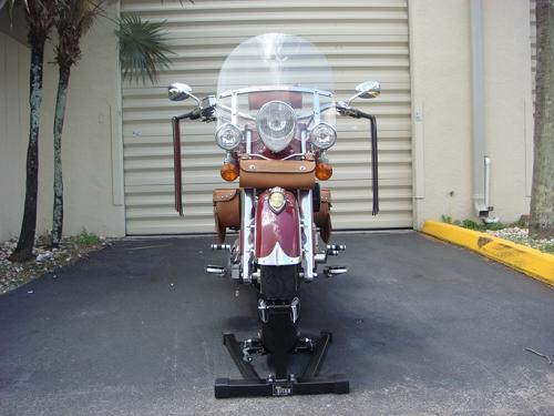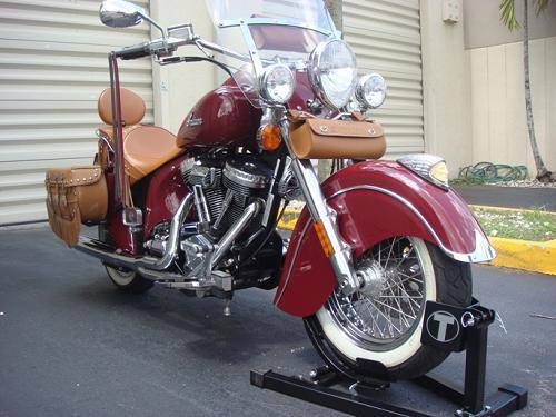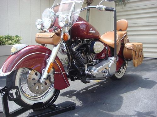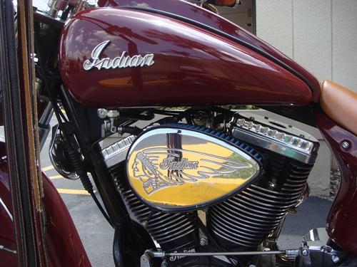 Powered by the air-cooled 100-cubic-inch (1638cc) 45-degree Powerplus engine with its distinctive rounded and serrated rocker boxes, the Vintage is essentially the standard Chief with special touches, The seat is covered in four-ounce leather embossed with the Indian script. The saddlebags include water-resistant liners and are constructed from eight-ounce leather. They wear chrome-plate buckles and buttons and leather fringe. Their tops are embossed with the Indian script. Other touches include die-cast tips for the trademark deep-valence fenders, and an ornate die-cast aluminum horn cover over the low-tone Fiamm horn. It uses the same chassis as other Chiefs, which includes rising-rate rear suspension, Paioli 41mm fork legs, and 130/90-16 whitewall tires on wire-spoke rims with four-piston Brembo brakes.