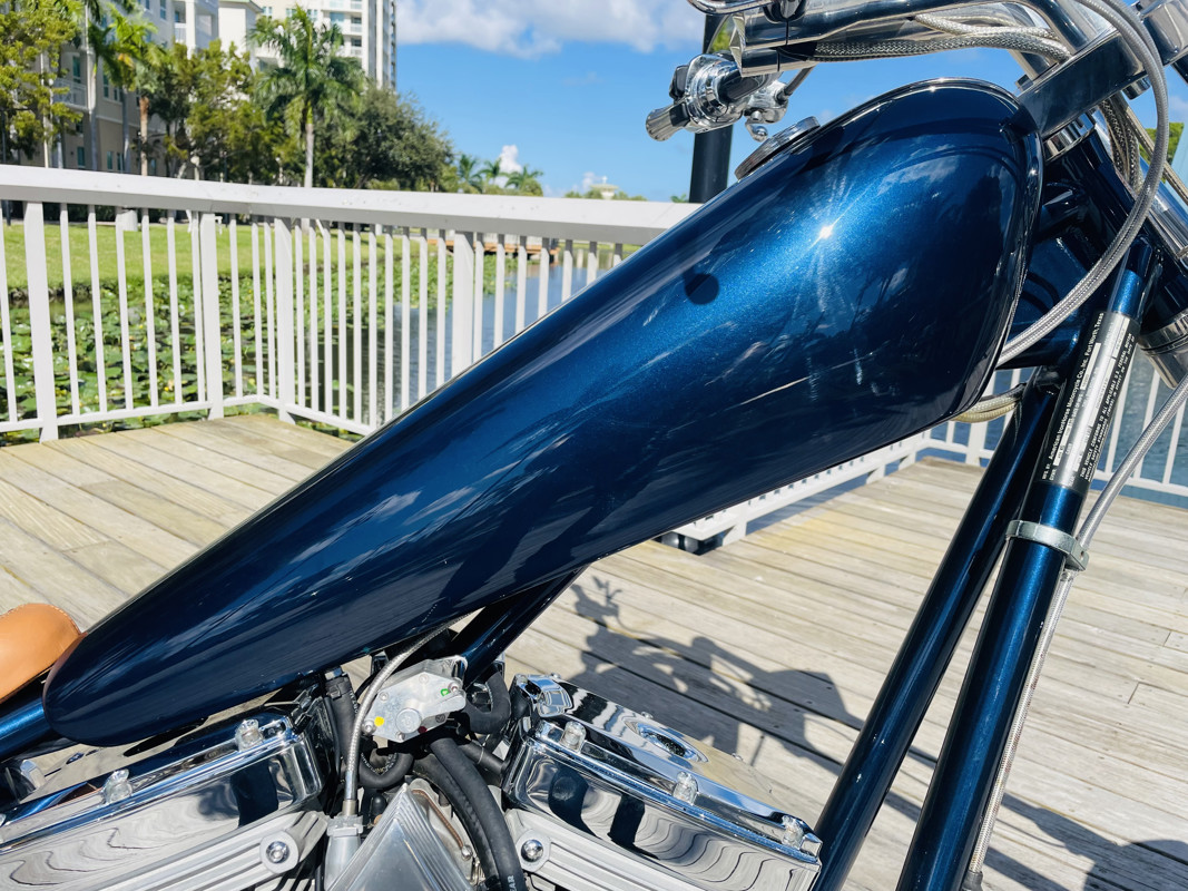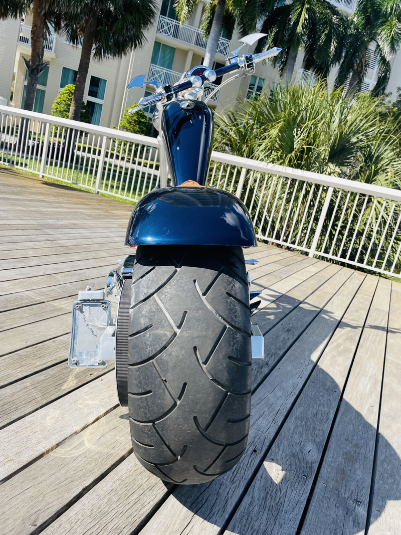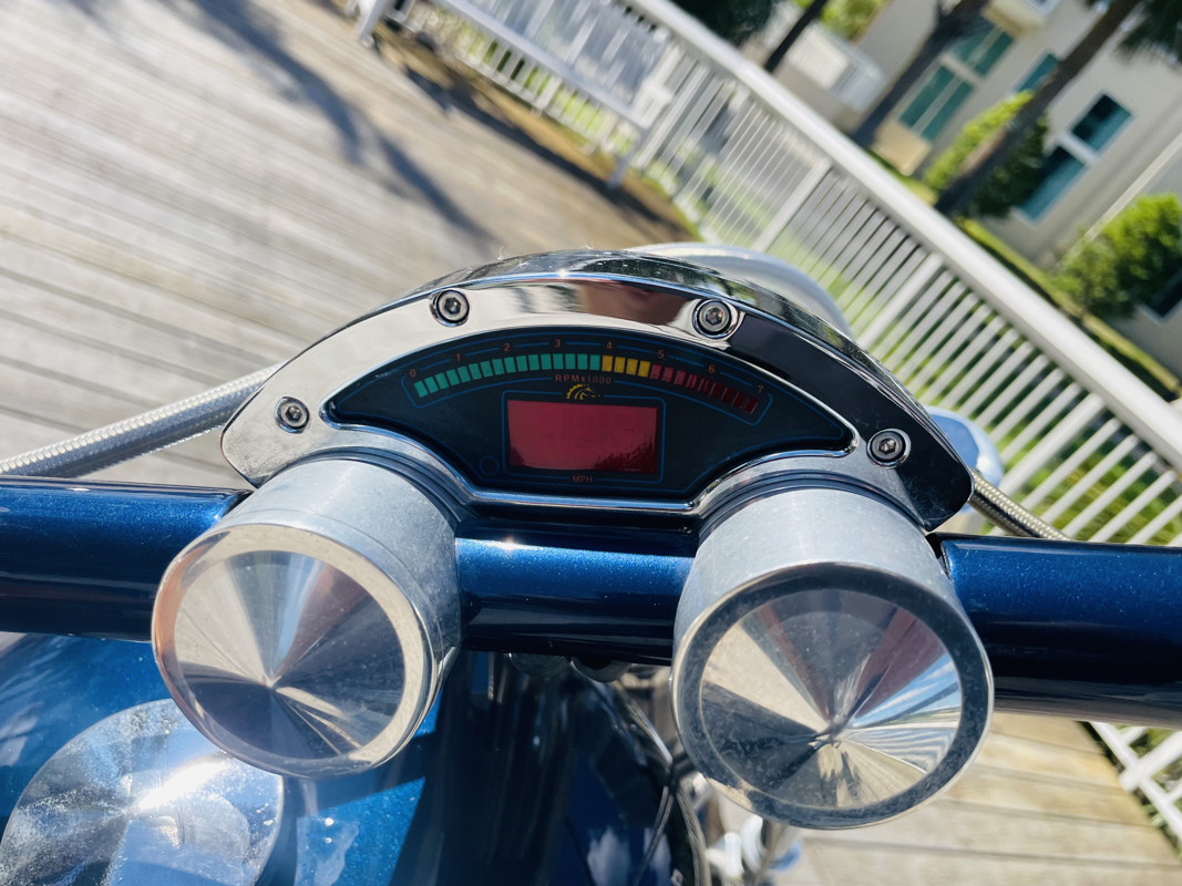 The color of this bike is amazing. It shines black at first then turns into a midnight blue metallic. Frame everything is the same color. Just stunning to simply look at. Unfortunately the chrome is suffering from the rather typical deterioration. You find some chrome defects on the speedo instrument cluster (which is not working) as well as on the primary cover. Typical also the secondary chrome like foot controls and pegs. Easy fixes if you want to make this bike perfect again.