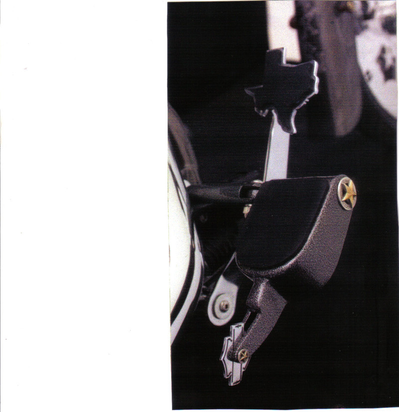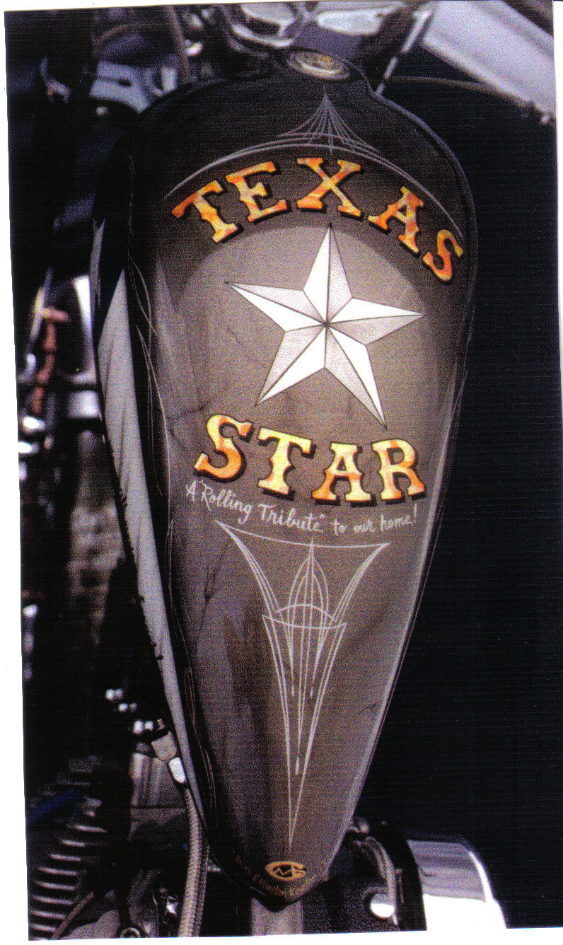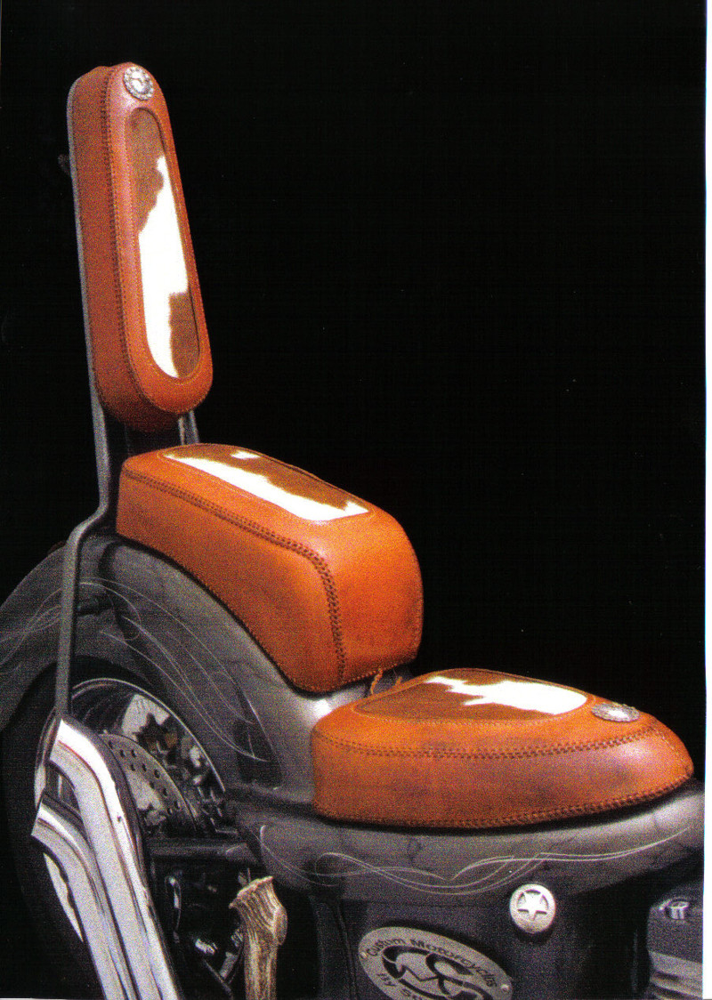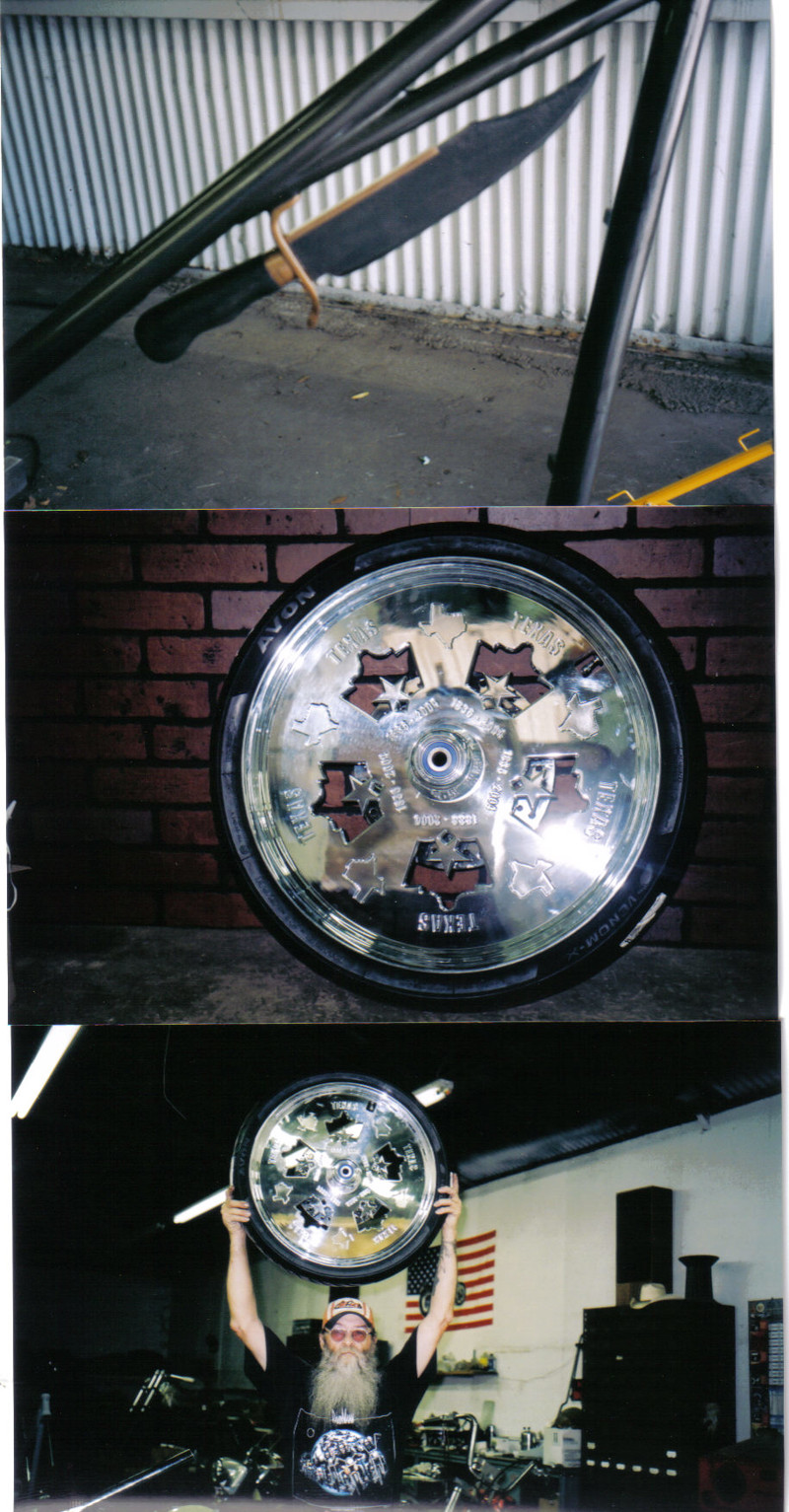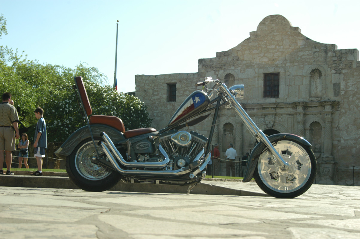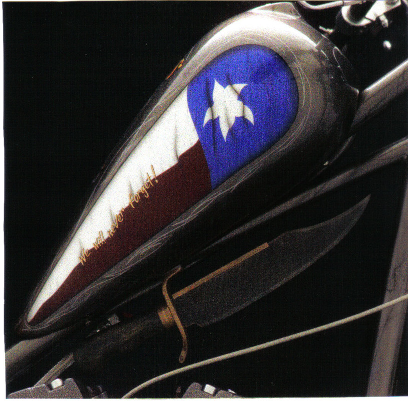 The Texas Star is accessorized with a replication of Jim Bowie’s actual knife from the Alamo. The knife was built in-house at Custom Motorcycles by Sonny from a blueprint furnished by historian Joseph Mosso, who owns the original knife. Some of the other adornments are spur-shaped front footboards, real antler rear foot pegs, solid silver Texas commemorative coins on the handlebars and rear fender. The barbed-wire brackets were fabricated by Sonny’s son, Waylon. The wheels, with classic Texas styling were designed by Sonny and machined by Ego Tripp of Lubbock. The seats are made from real Texas Longhorn hide from Amarillo Stockyards and they were hand-laced by Jason Rexrod.