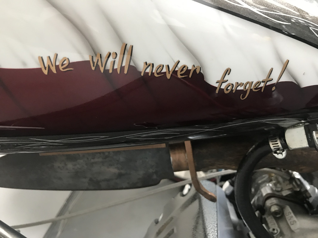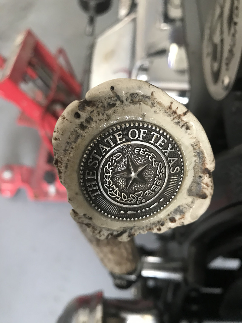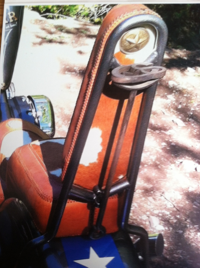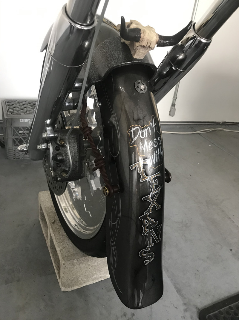 The bike is true art and the theme is all about Texas Heritage. The front fender is mounted with Texas style barbwire and reads “Don’t mess with Texans”. The bike is totally unique and definitely one of a kind with intricate detail and craftsmanship. My hat is off to the builder, the late Sonny Keeton of Beaumont Texas!