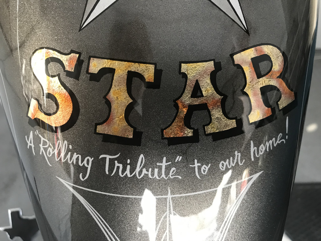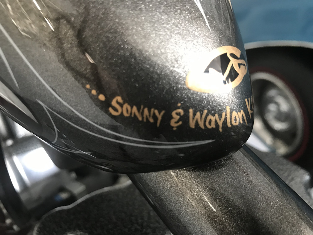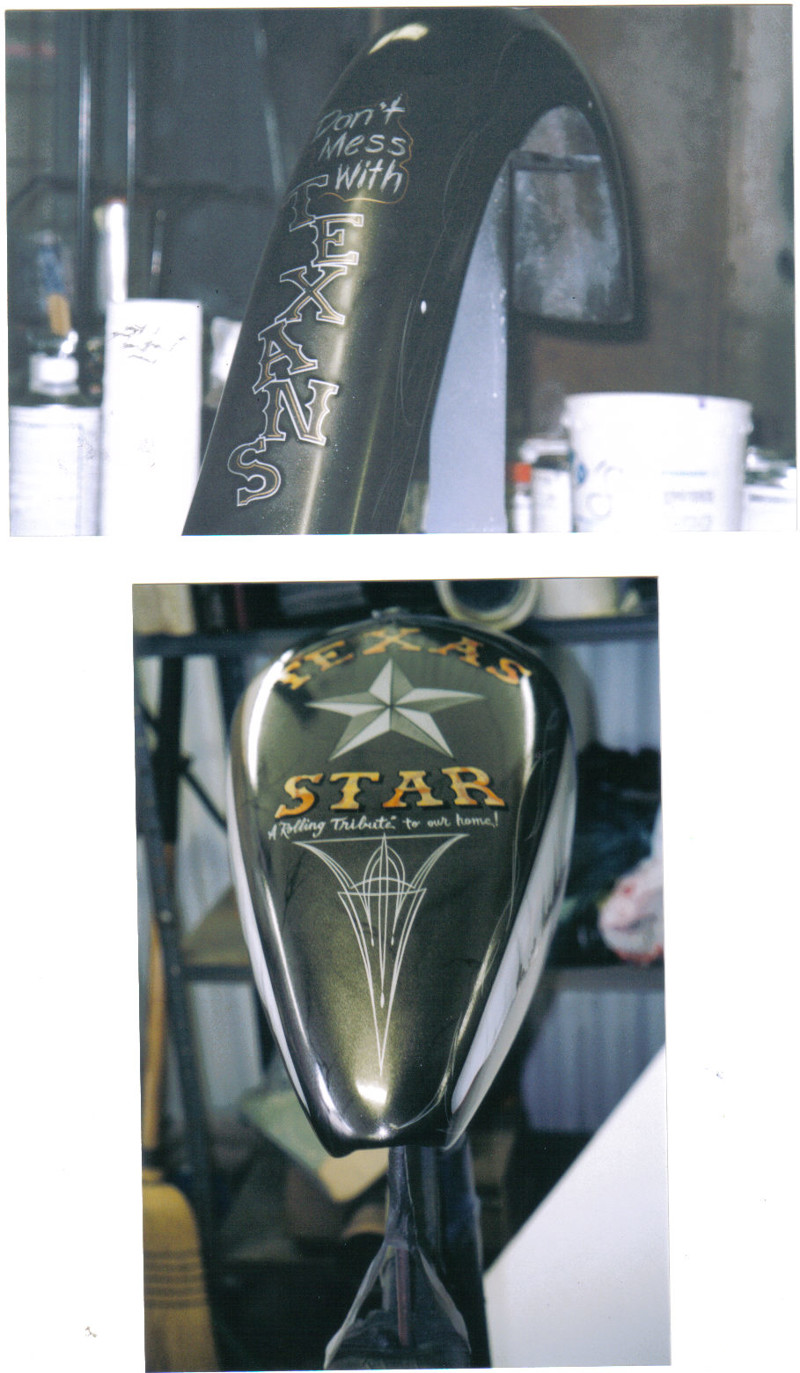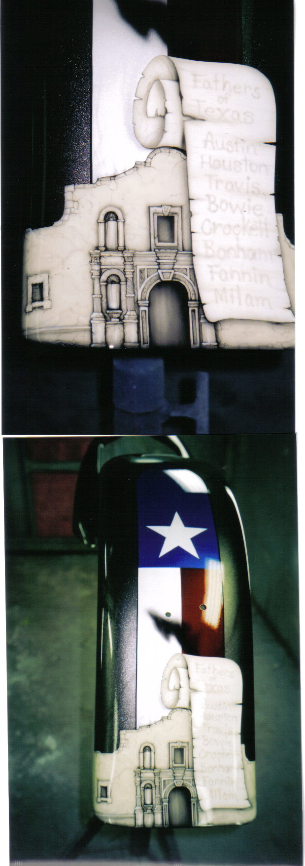 The paint and artwork by Sonny Keeton are Texas all the way with gold-leaf “Texas Star” logo and its sub-title, “A rolling tribute to our home” echoes the feelings of the Keeton family, while a detailed airbrush rendering of the Alamo enhances the rear fender.