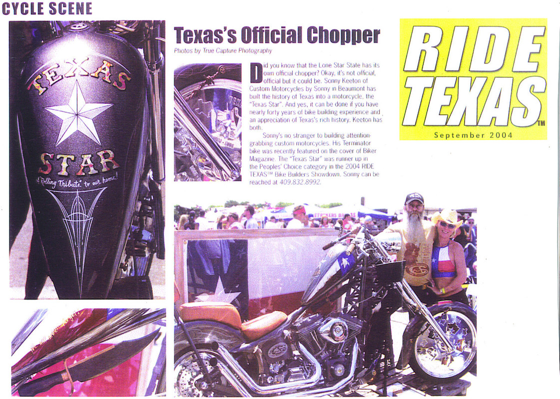 This eye-catching machine has been featured in Ride Texas Magazine, Victoria Newspaper, and various television appearances, Willie Nelson and the Texas Roadhouse and Thunderpress.