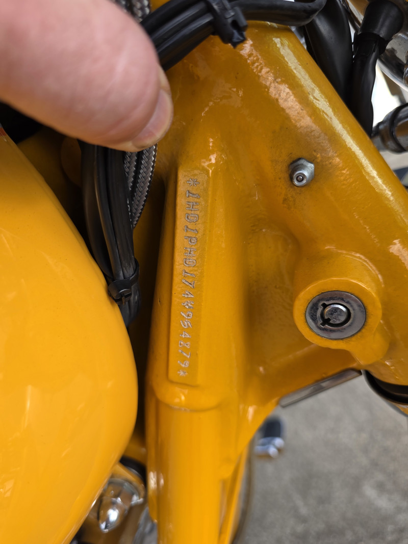 Yellow Pearl and Platinum Mist paint with matching pinstripes and Harley-Davidson graphics