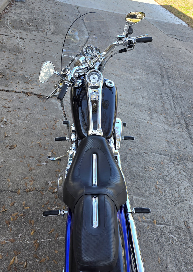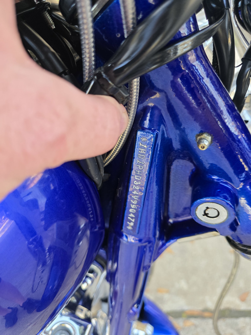 Candy Cobalt and Starlight Black paint with matching pinstripes and Harley-Davidson graphics