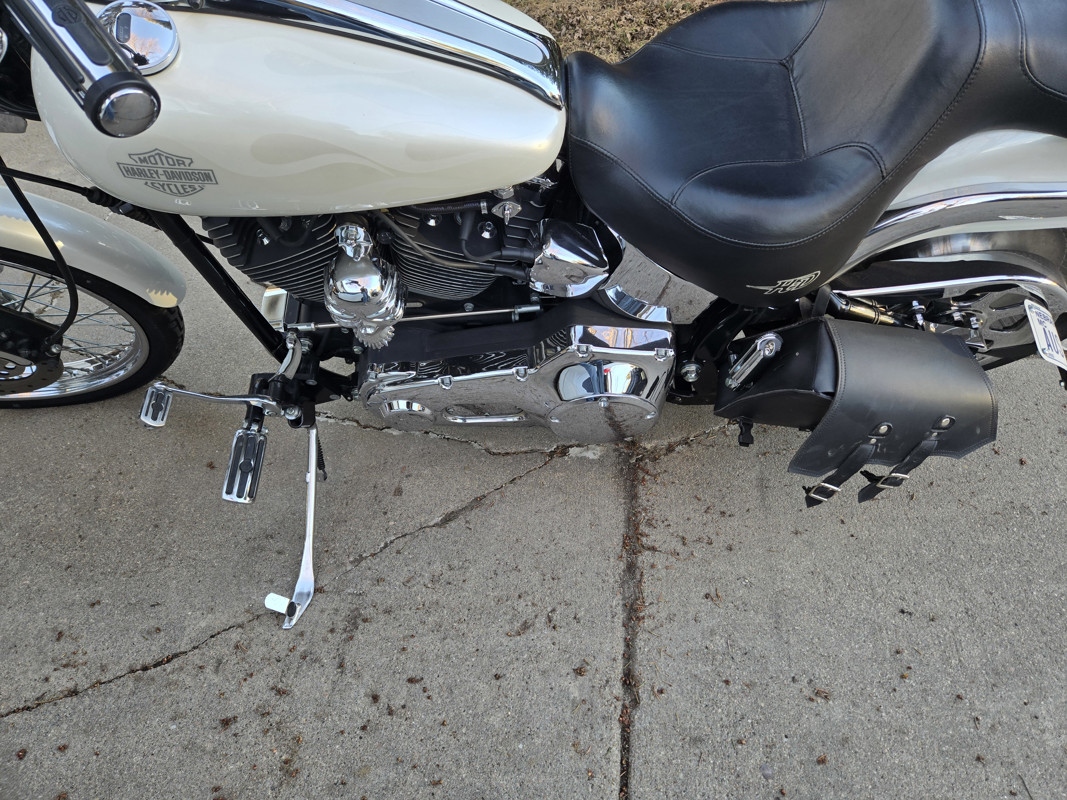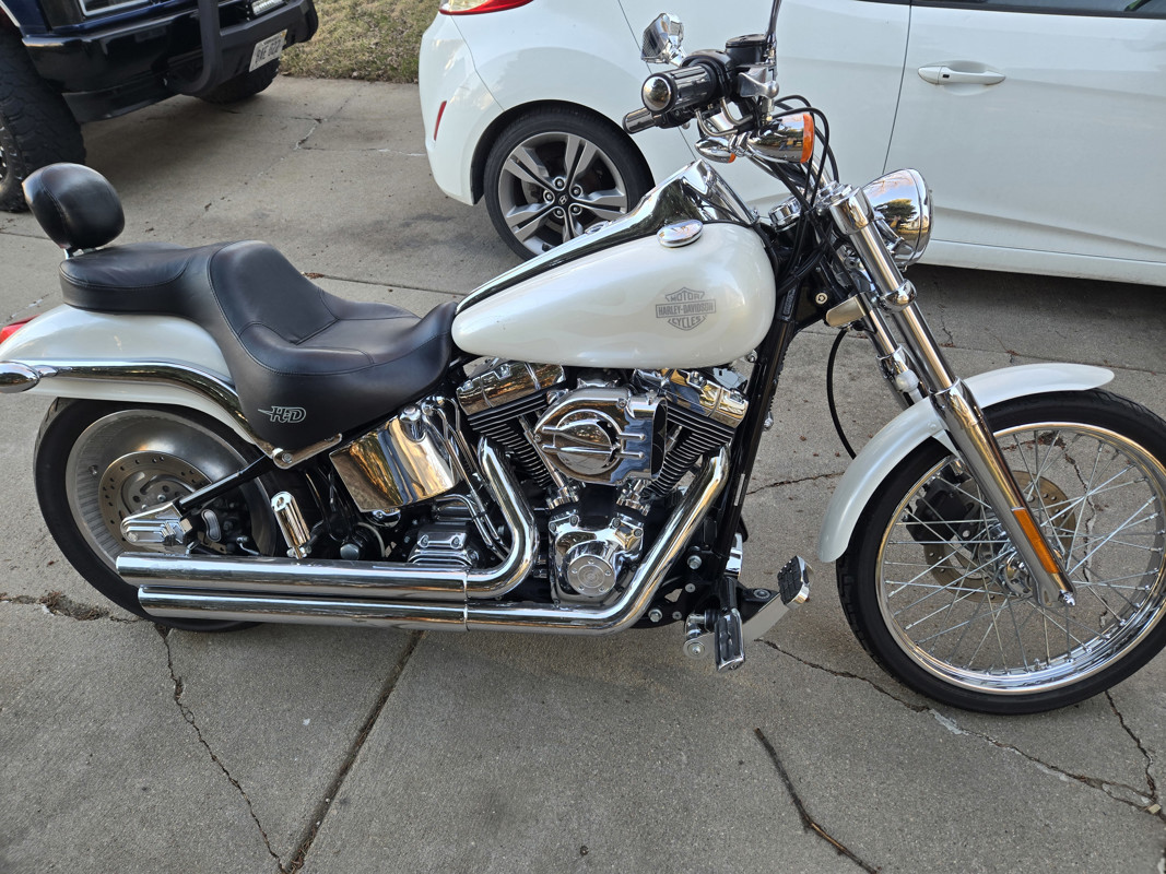 04 softail deuce pearl white with ghost flames only a few done this way . Stage 3 motor very fast chrome everywhere screamin eagle exhaust 2 owners 20k miles bike is perfect no leaks runs perfect buy and ride away needs nothing