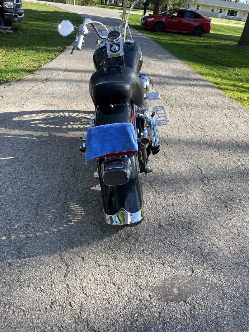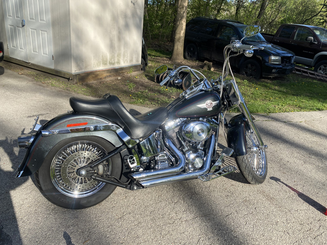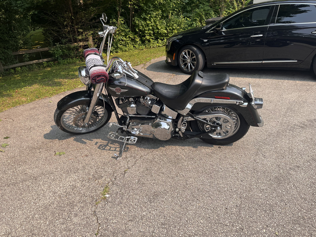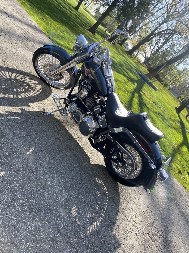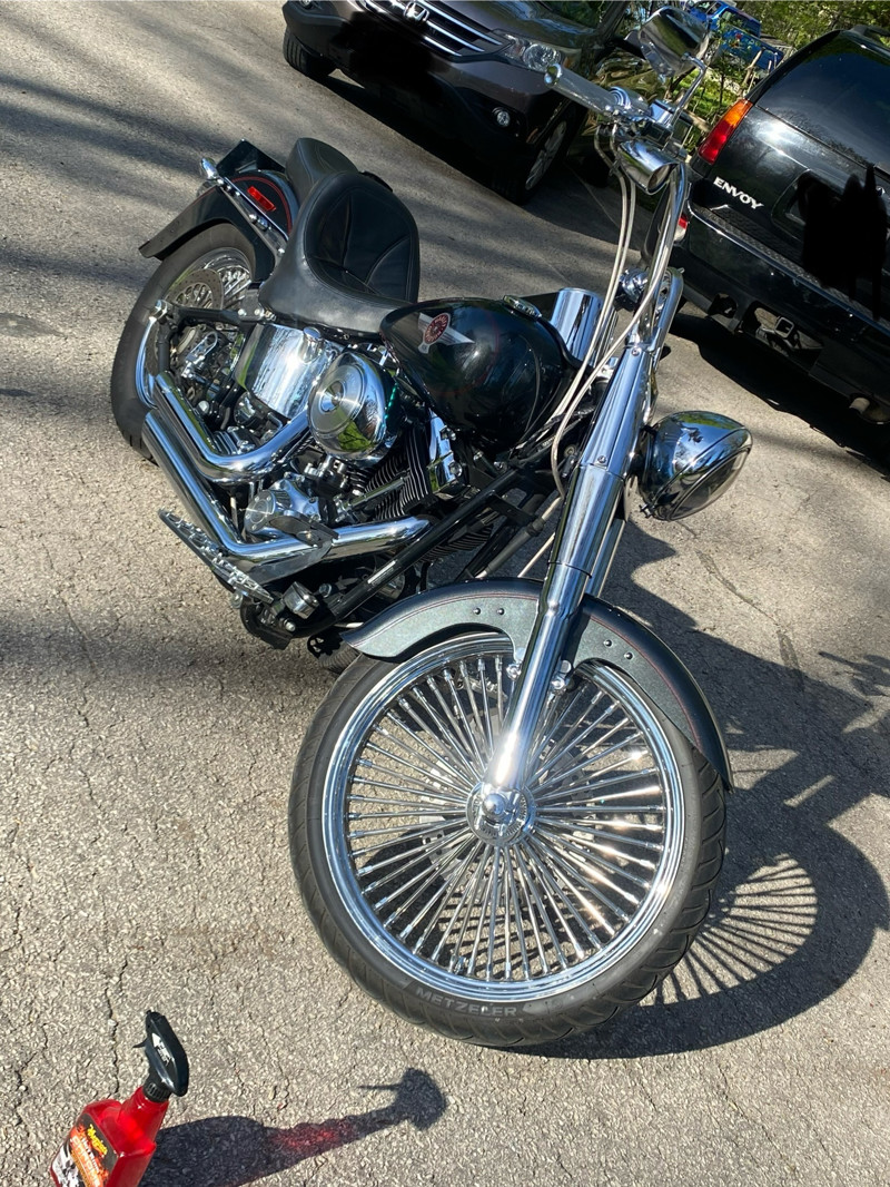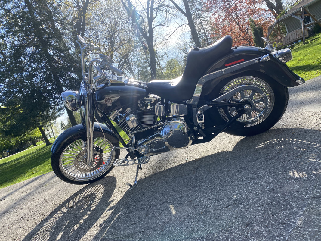 The 88 twin cam has been bored out to a 98” with fueling hydraulic conversion kit so no need to worry about those early twin cam issues and this updates it to the same as 2007 and newer twin cams reliability. Also has S&S 583 cams lifters and pushrods, making this cruiser a Hell of a lot more powerful. Just a note my uncles 2017 fatboy lo with the 110 screaming eagle package comes close. I have the original rims and with new tires. Currently has DNA Mammoth 52 fat spokes 21” front 16”rear wrapped in metzler 888’s less than 1,000 mi on them($2,800package) and is lowered 2” in the rear also. Vance and Hines short shots with the carbureted engine gives that classic Harley sound you just can’t get with today’s bikes. Saddleman king seat with drivers back rest makes for a comfortable cruise and passenger. Halomaker headlight mini apes steel braided lines motor work performed by blasier performance of door county I have receipts for work done