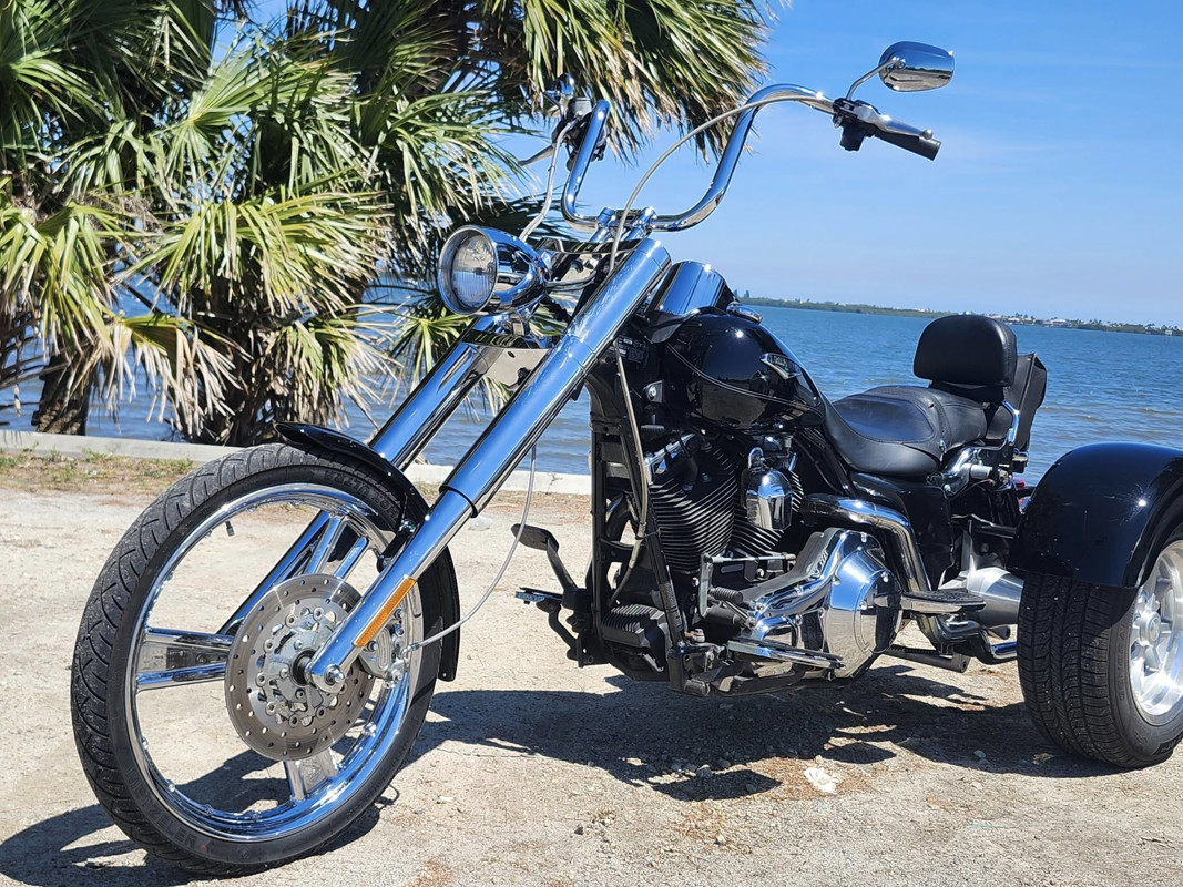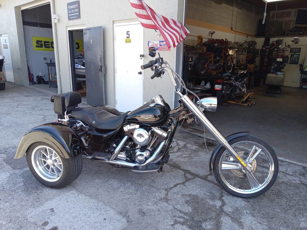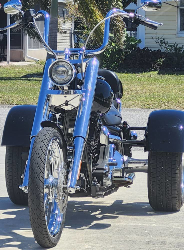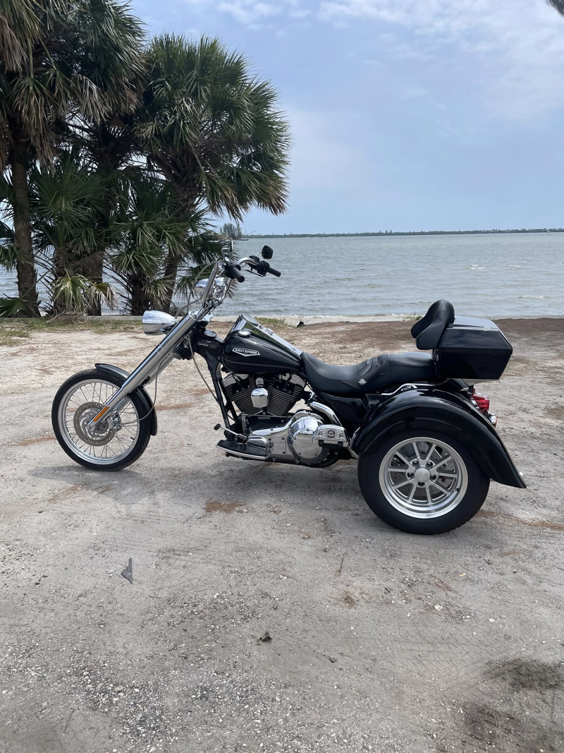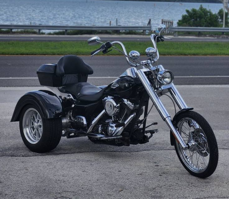 2005 Road King Chopper Trike: Flawless Beauty! Frankenstein Trike Kit, Mag Wheels, Burley 12" Gorilla Bar, Power Commander, New Spoked Front Wheel & Tire, Chopper Kit USA Wide Glide 82mm PHAT-KAT Rake Kit, 1000 Watt (4) Speaker Stereo, and Luggage Box. Recent oil & brake service. Price is firm-ish.