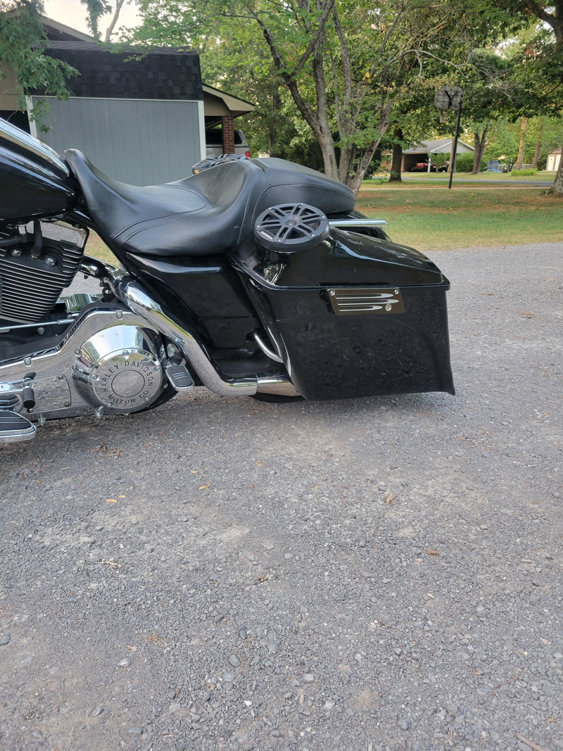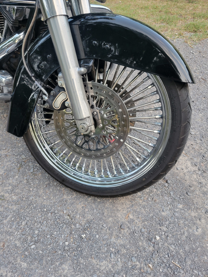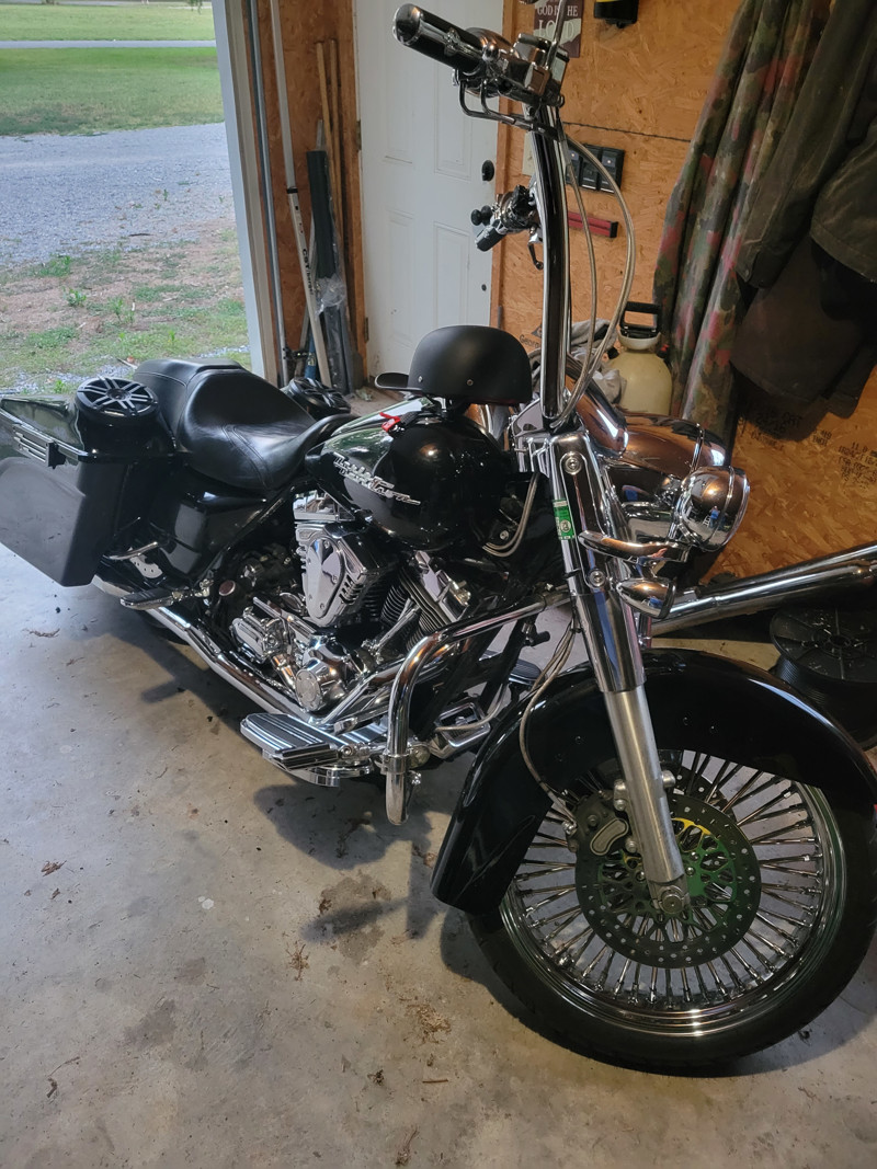 05 Harley Road King with new front 21" wheel with dual chrome brake disc, new front tire with less than 500 miles. Custom rear fender, with molded marine speakers, Bluetooth amp, custom license plate holder, custom blinkers and taillights, chrome 18" hanle bars with new throttle cables, all upper comtrols are chrome, new handle crips, front headlight has been changex to led, Vance & Hine exhaust, almost everything on the motor has chromed out on this bike. I do have other bags, 14" bars, Windshield, sissy bar and back rest to go with it. This bike sounds awesome and rides great, especially with blasting music while you cruise around town.