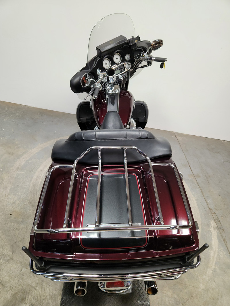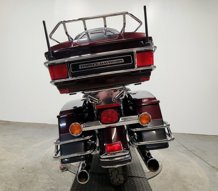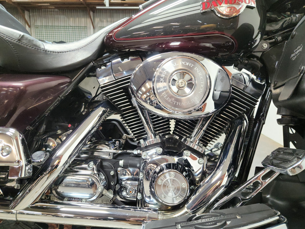 THE PAINT SHINES LIKE NEW AND THE CHROME SHINES BRIGHT! CHROME FRONT END, CHROME LEVERS, CHROME SWITCH HOUSINGS, CHROME RESERVOIRS & CAPS, AND CHROME ALL OVER THE MOTOR! UPGRADED FLOORBOARDS AND LOWER CONTROLS, CUPHOLDER, WINDSHIELD BAG, AND AM/FM STEREO — THIS IS ONE SHARP, LOW-MILEAGE HARLEY-DAVIDSON!