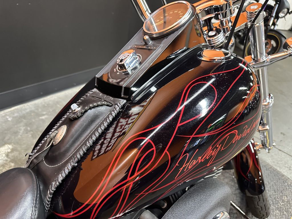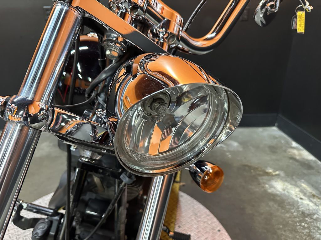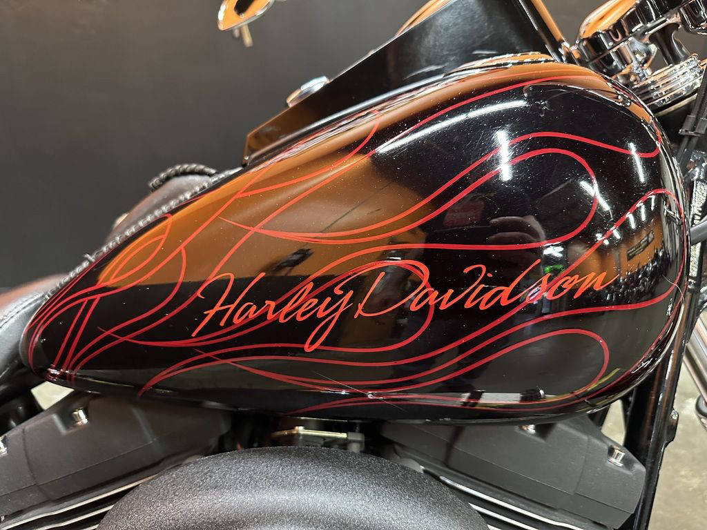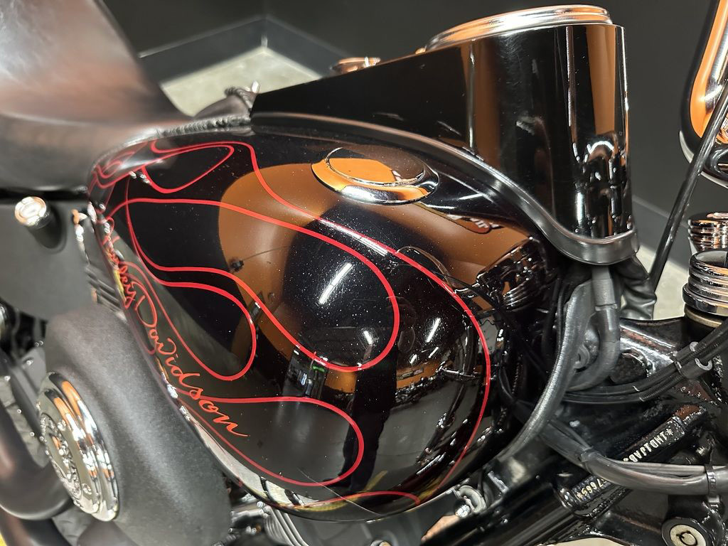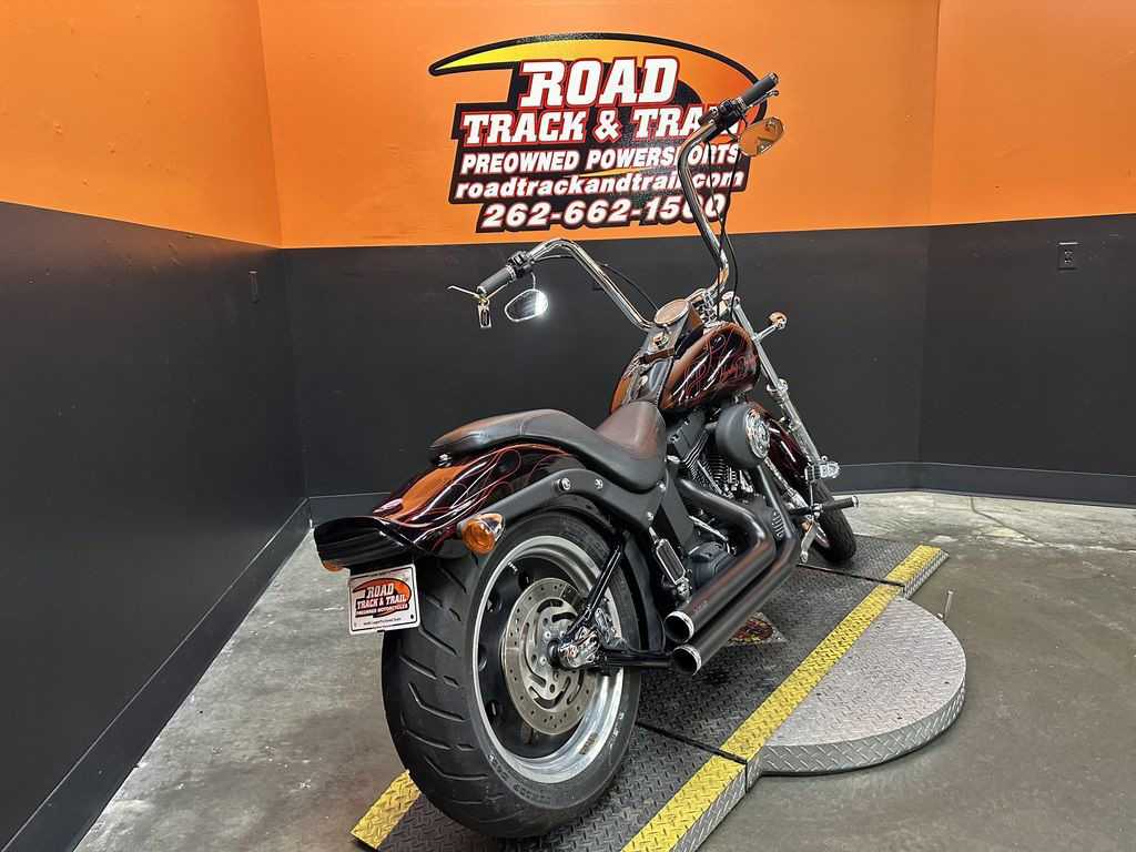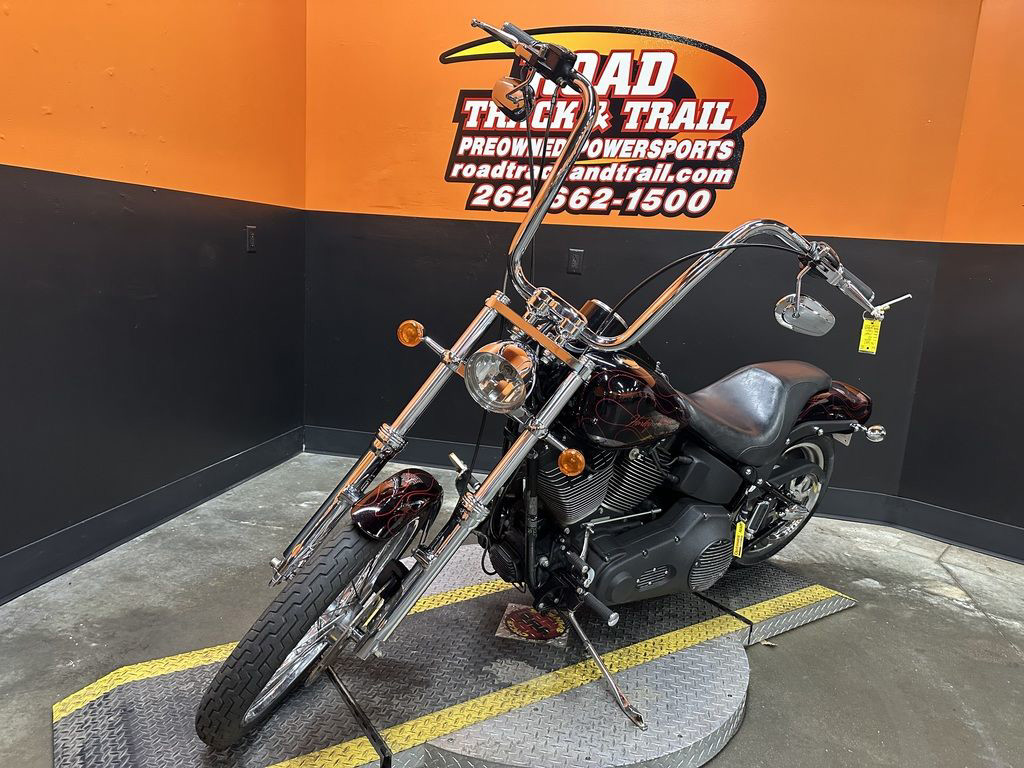 WOW FACTOR! ONLY 27,031 MILES, FULL CUSTOM METAL FLAKE FLAMED PAINT JOB, FREEDOM PERFORMANCE EXHAUST, HIGH FLOW INTAKE, CARLINI BIG HANDLEBARS, CHROME FORKS, AFTERMARKET BULLET STYLE HEADLIGHT, CHROME PULLEY COVER, AVON GRIPS, CHROME LEVERS, LED TAILLIGHT, LED FLUSH MOUNTED GAS CAPS, 200 SERIES REAR TIRE, AND MORE! CLEAN AND LOADED CUSTOM SOFTAIL CRUISER! THERE ARE A COUPLE OF PAINT TOUCH UP SPOTS ON THE FRONT FENDER AND THE LEFT SIDE OF THE GAS TANK.