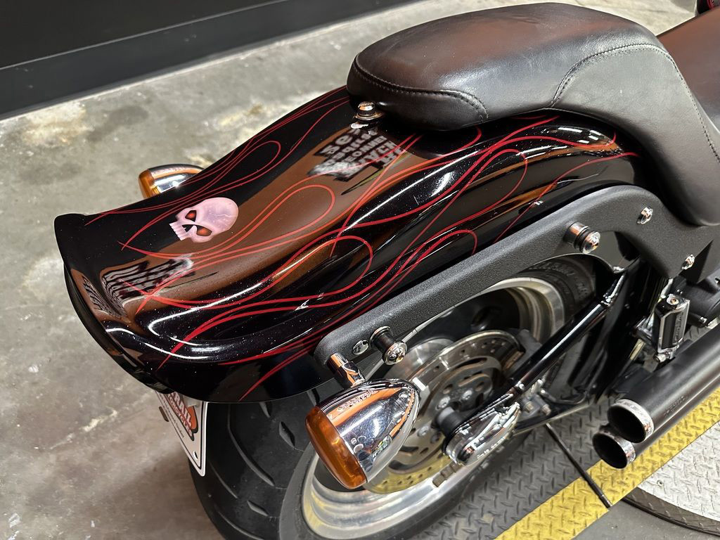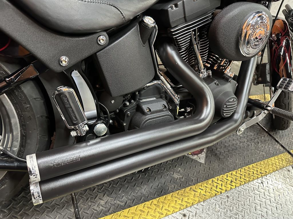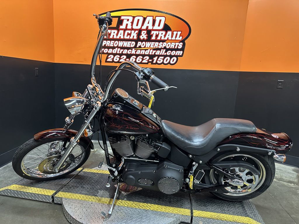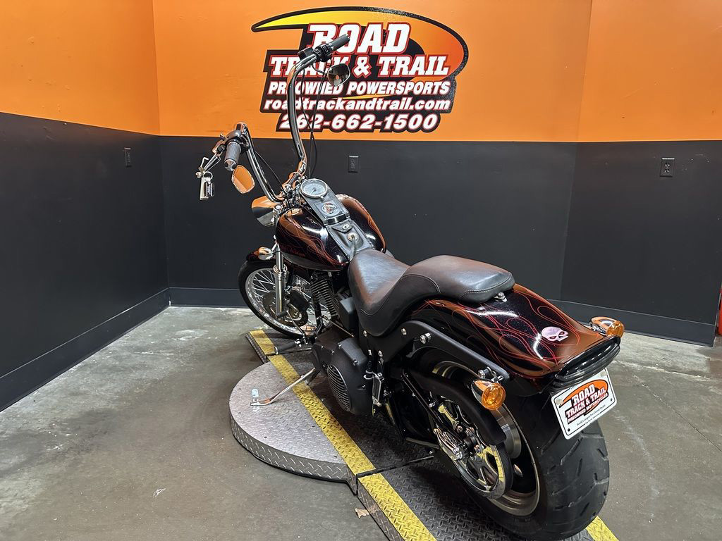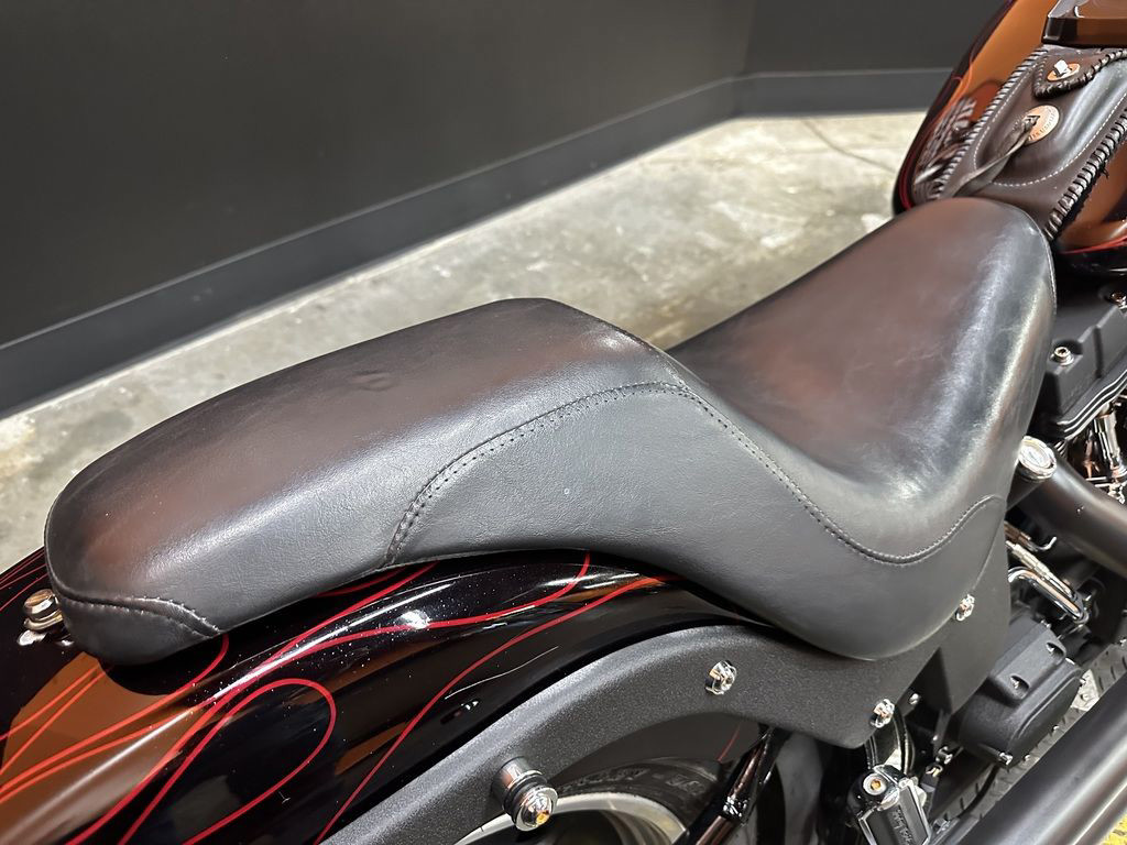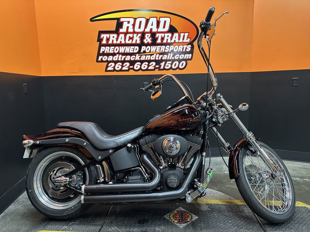 WOW FACTOR! ONLY 27,031 MILES, FULL CUSTOM METAL FLAKE FLAMED PAINT JOB, FREEDOM PERFORMANCE EXHAUST, HIGH FLOW INTAKE, CARLINI BIG HANDLEBARS, CHROME FORKS, AFTERMARKET BULLET STYLE HEADLIGHT, CHROME PULLEY COVER, AVON GRIPS, CHROME LEVERS, LED TAILLIGHT, LED FLUSH MOUNTED GAS CAPS, 200 SERIES REAR TIRE, AND MORE! CLEAN AND LOADED CUSTOM SOFTAIL CRUISER! THERE ARE A COUPLE OF PAINT TOUCH UP SPOTS ON THE FRONT FENDER AND THE LEFT SIDE OF THE GAS TANK.